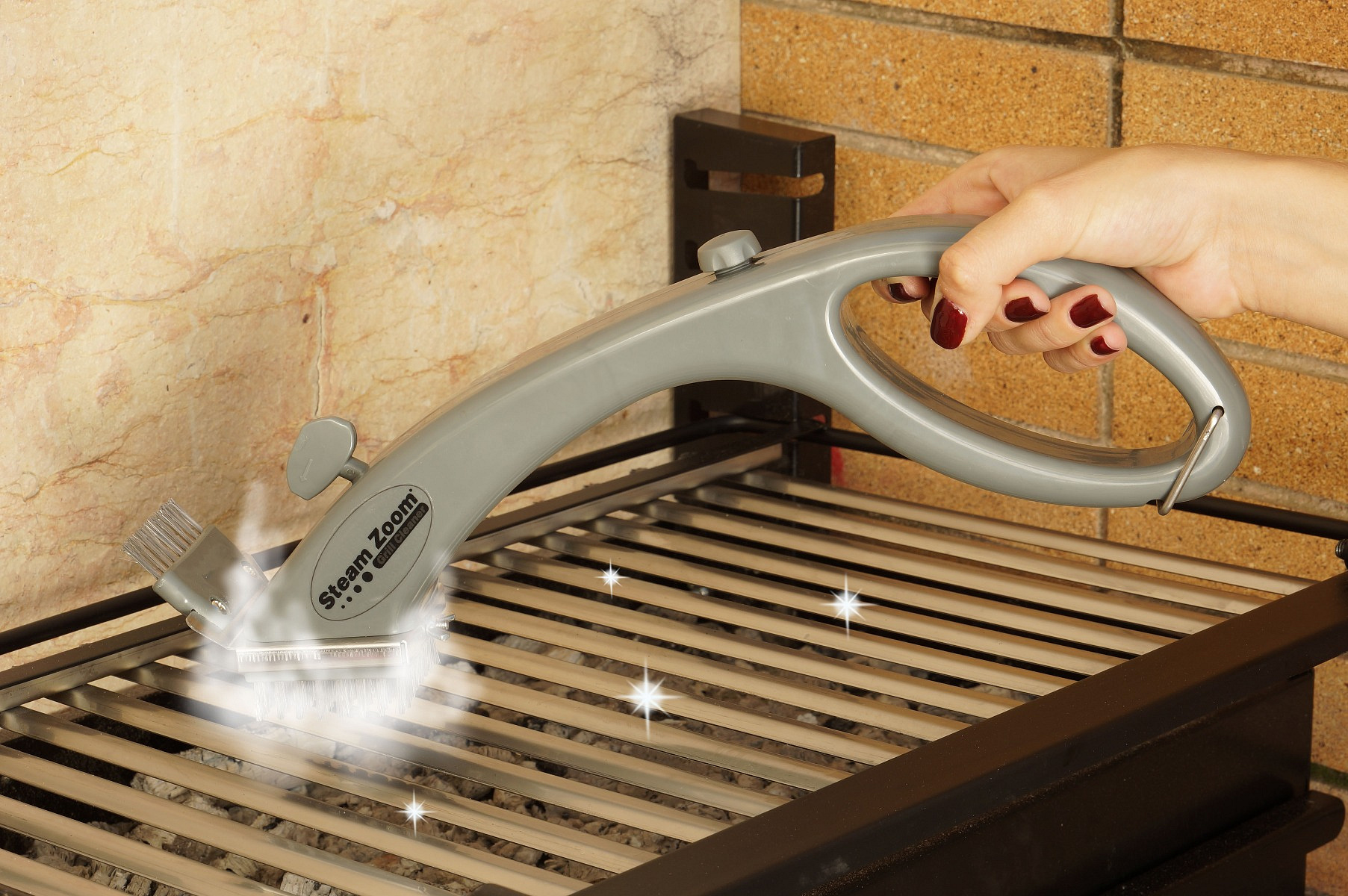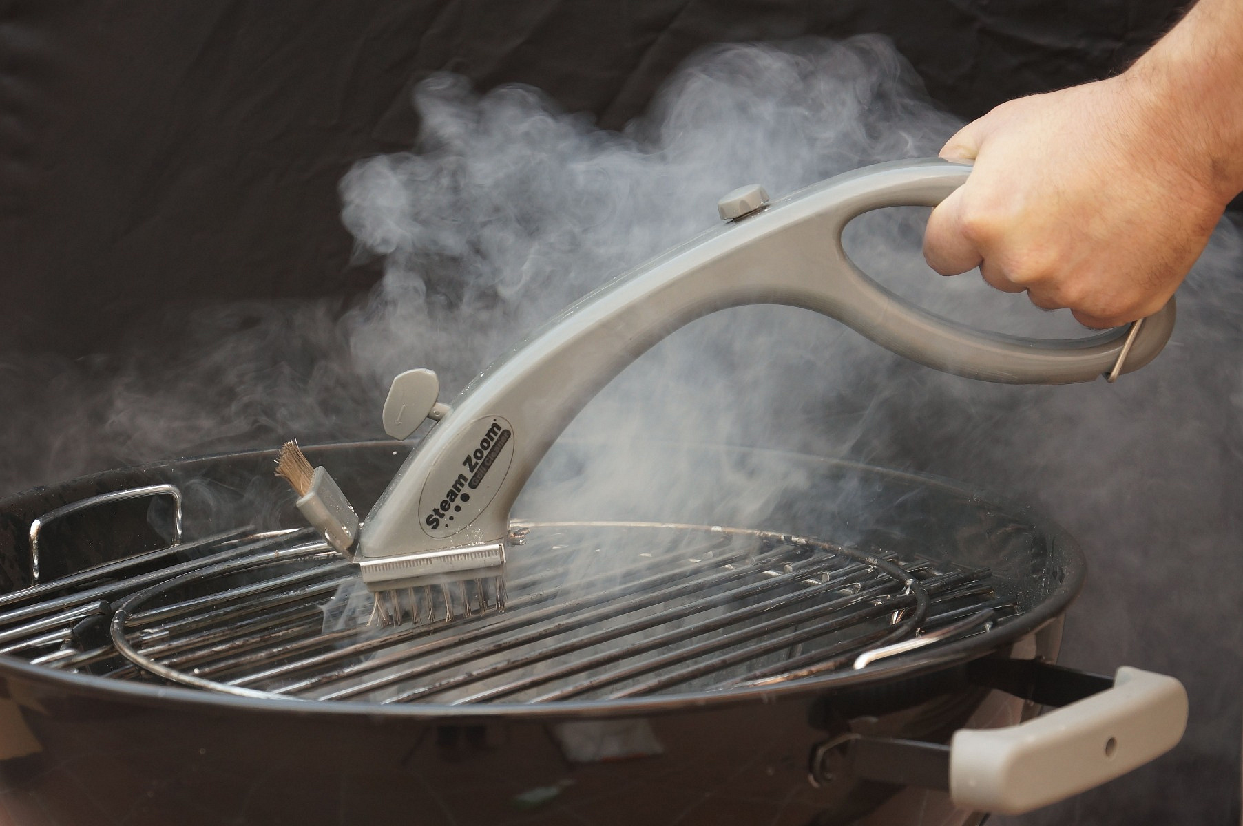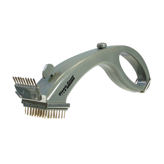 The grill cleaner is a wire brush that uses steam. The grill plate is, as it were, sprayed clean and looks like new again. The Steam Zoom Grill Cleaner can also be used on oven racks.