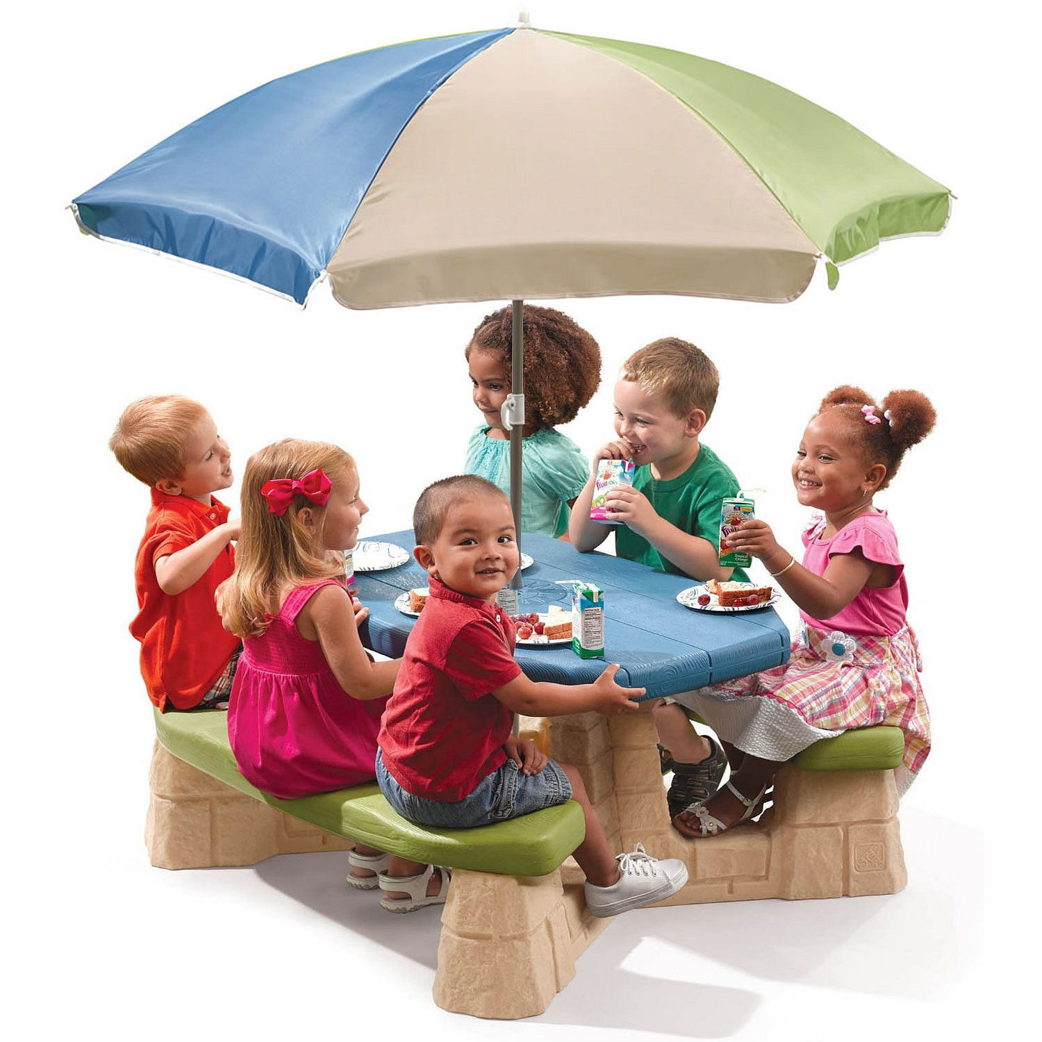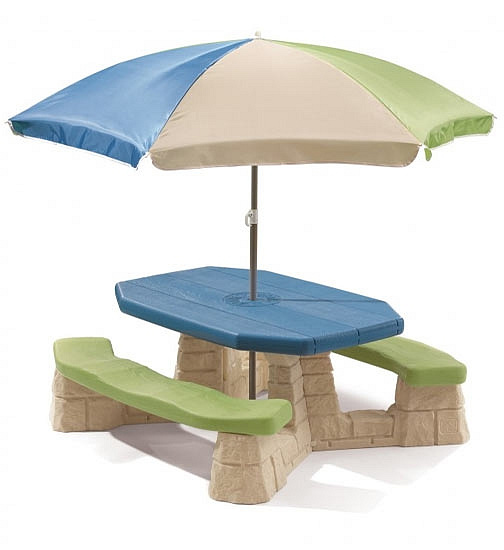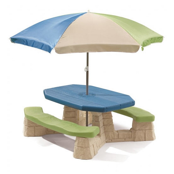 VíceStół piknikowy dla sześciorga dzieci z dwoma ławeczkami o specjalnym wyprofilowanym siedzisku. Wykonany z masywnego tworzywa sztucznego o podwójnych ściankach wypełnionych w środku powietrzem.Znaczna grubość elementów minimum 5 - 6 cm pozwala na długie użytkowanie stolika, a duży ponad 100 cm długości i szerokości 50 cm masywny blat oraz stabilna konstrukcja stołu zapewnia bezpieczeństwo zabawy. Dołączony parasol chroni przed promieniowaniem UV. Wysokość od ziemi do blatu stolika minimum 50 cm pozwala na korzystanie ze stolika dzieciom o różnym wzroście.