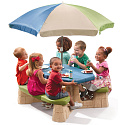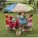 Stół piknikowy STEP2 dla sześciorga dzieci z dwoma ławeczkami o specjalnie wyprofilowanym siedzisku. Z masywnego tworzywa sztucznego o podwójnych ściankach wypełnionych w środku powietrzem.