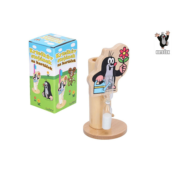 Dětský dřevěný stojánek na zubní kartáček s motivem Krtečka a jeho přátel. S tímto krásným stojánkem se pro děti stane čištění zoubků zábavou. Na stojánku jsou připevněny přesýpací hodiny. Rozměry balení 7 x 16 x 7 cm. Vhodné pro děti od 3 let.