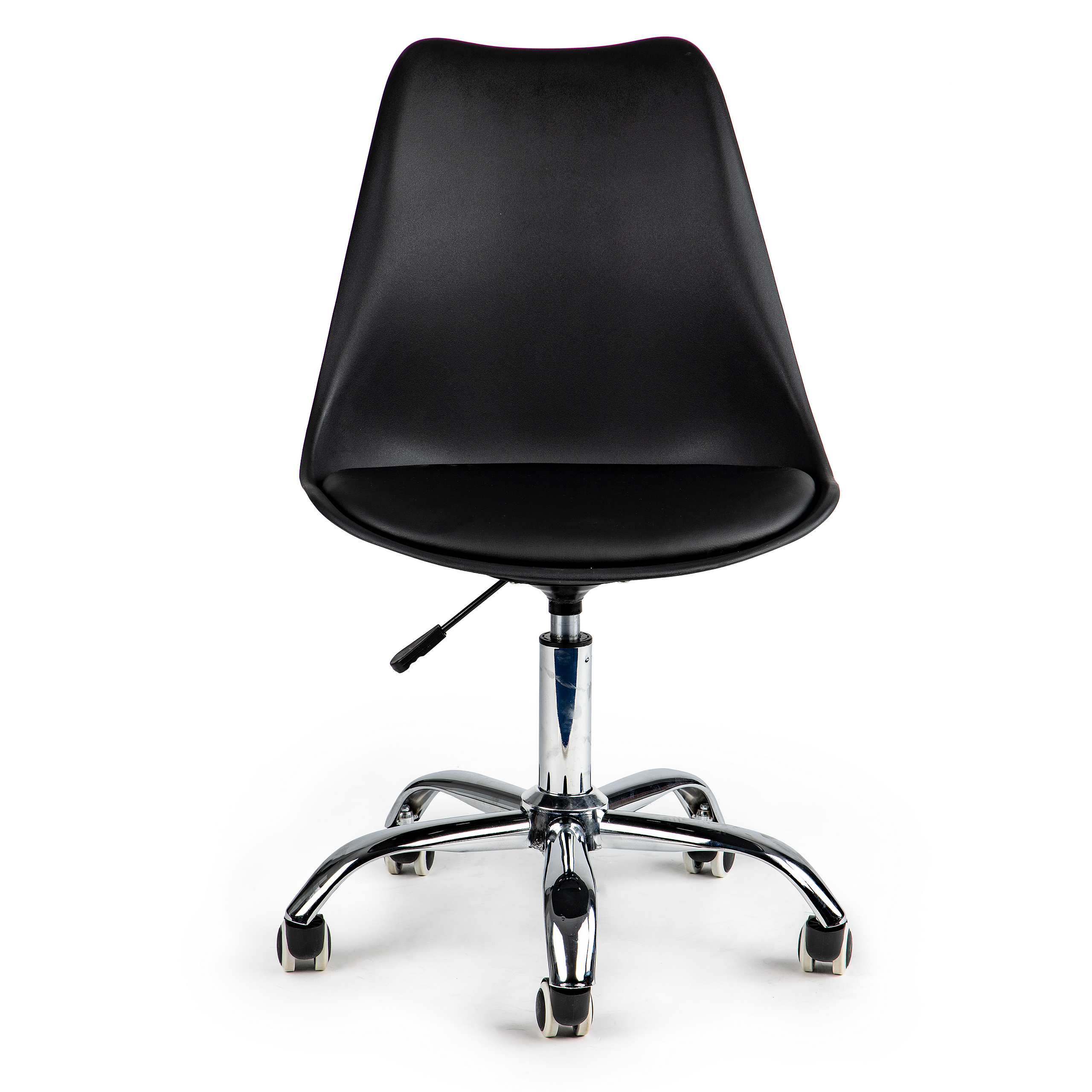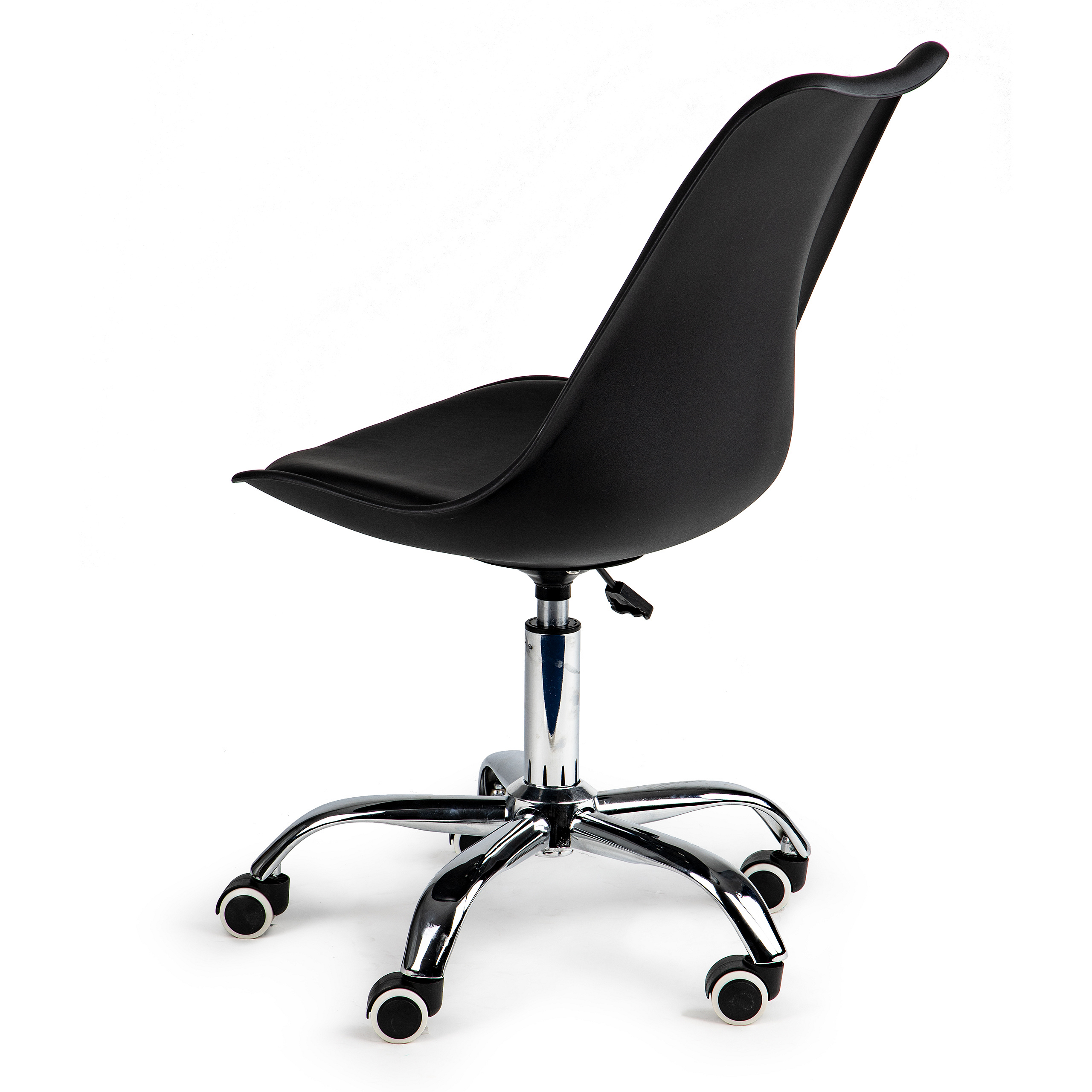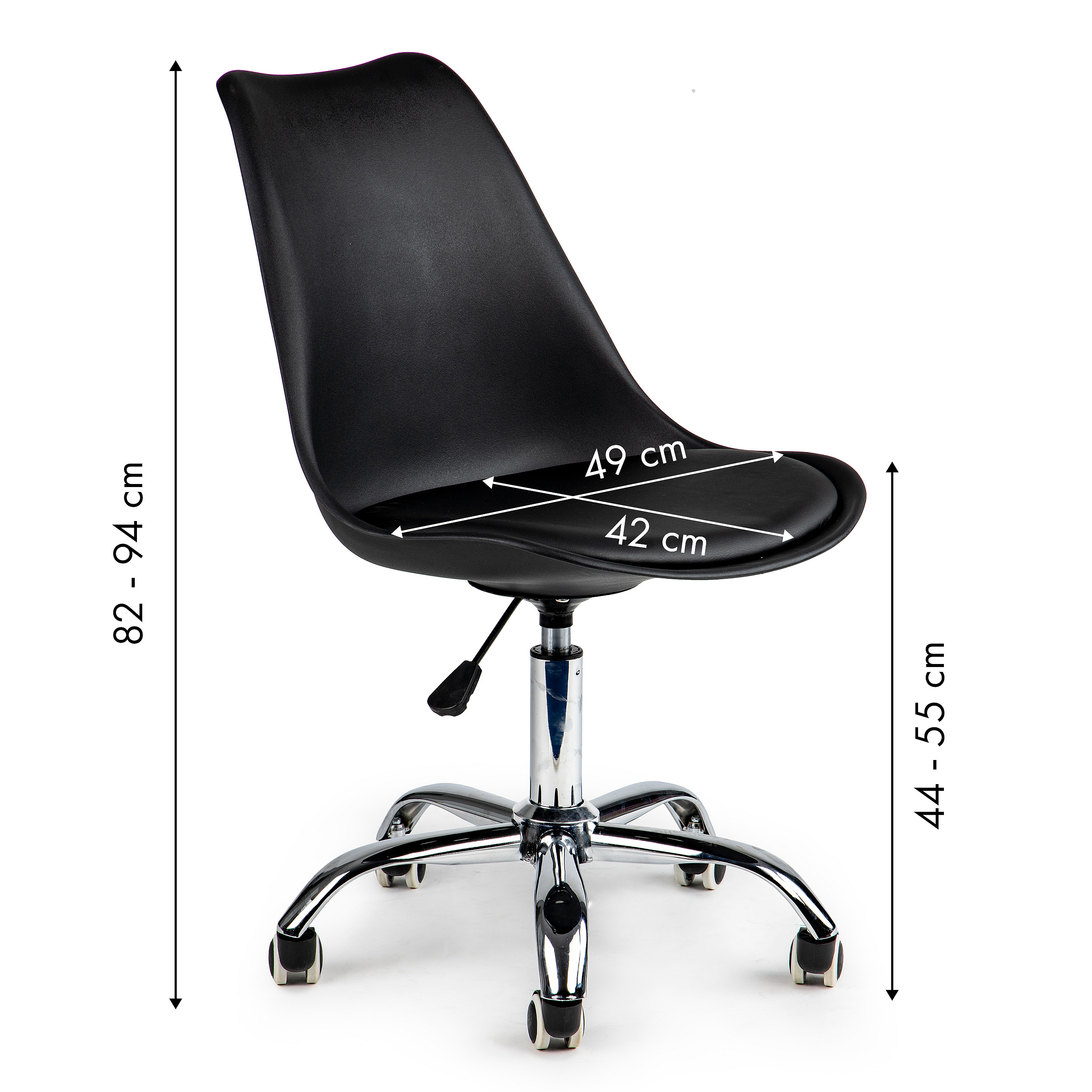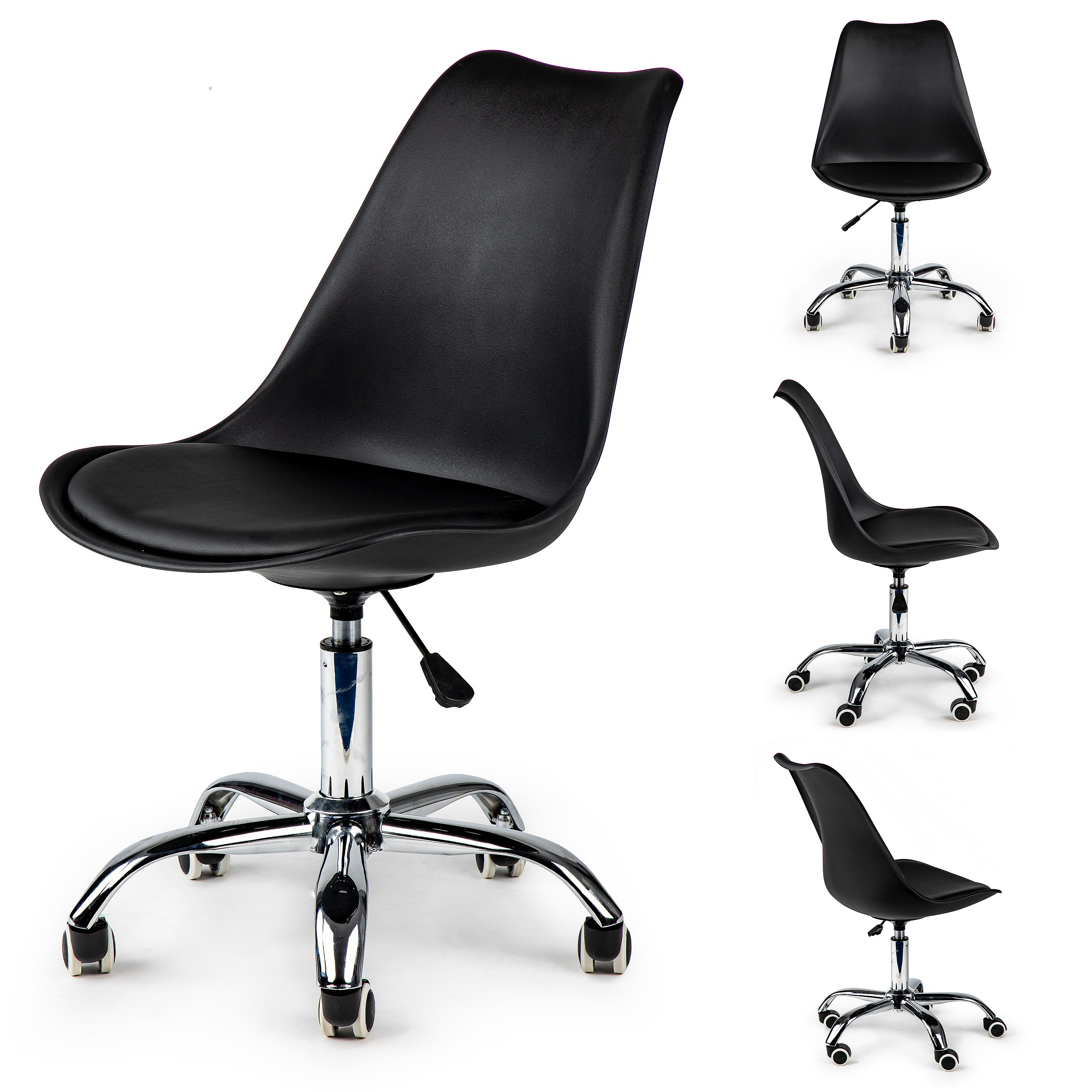 For proper functioning while working at a desk, you need a chair that allows long, comfortable hours in front of the computer. The swivel chair by ModernHome is an ideal solution for offices, home workstations, or reception areas in service spaces. Its black color scheme with chrome accents fits perfectly into modern interiors.