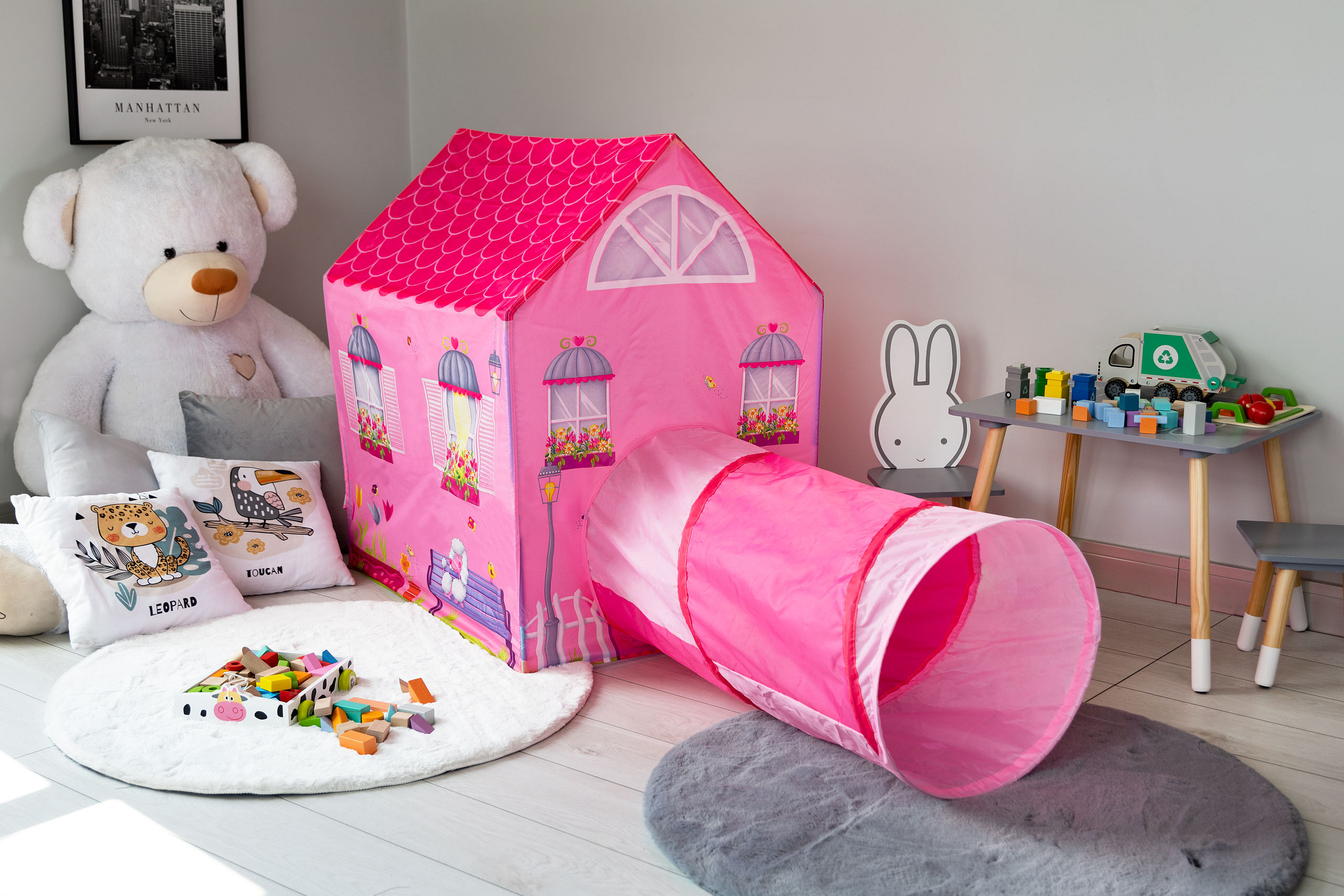 The tent gives you the opportunity to have unforgettable fun, it will be a perfect hideout and a place of great adventures. Vivid colors and colorful pictures will interest every toddler and make the game even more interesting.