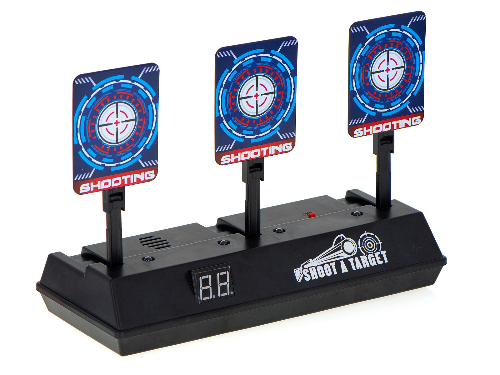 W tarczę można strzelać z pistoletów na piankowe strzałki. Posiada ona efekty świetlne i dźwiękowe uatrakcyjniające zabawę. Po trafieniu możemy usłyszeć dźwięk tłuczonego szkła lub oklaski. Dodatkowo na tarczy został umieszczony dwucyfrowy licznik punktów. Każdy cel po trafieniu kładzie się do tyłu. Po zestrzeleniu trzech tarcz otrzymujemy 1 punkt, po czym wszystkie podnoszą się automatycznie do góry.