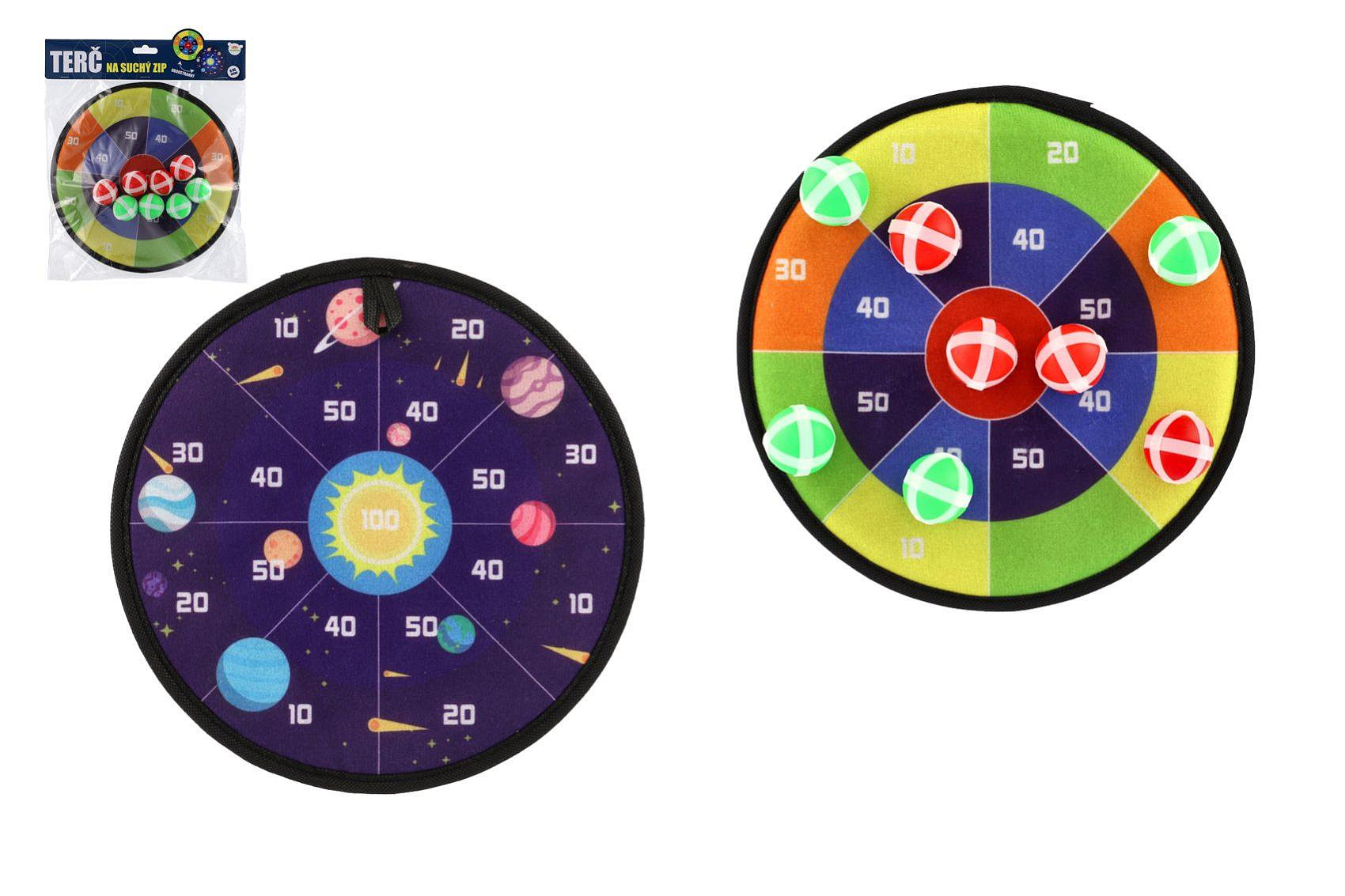 Terč na suchý zip dostane kluky i holky. Je to veselá hra, při které se vaše děti naučí mířit a házet . Nechte vaše děti soupeřit mezi sebou. Cílem hry je hodit co největší čísla. Jejich sčítáním se děti procvičí i v matematice. Terč na suchý zip má dva designy. Jedna strana terče je barevná s čísly, druhá je v motivu vesmíru s čísly. Terč má očko na zavěšení. Balení obsahuje: Terč na suchý zip oboustranný + 8 ks míčků se suchým zipem. Průměr terče: 27 cm Vhodné pro děti od 3 let