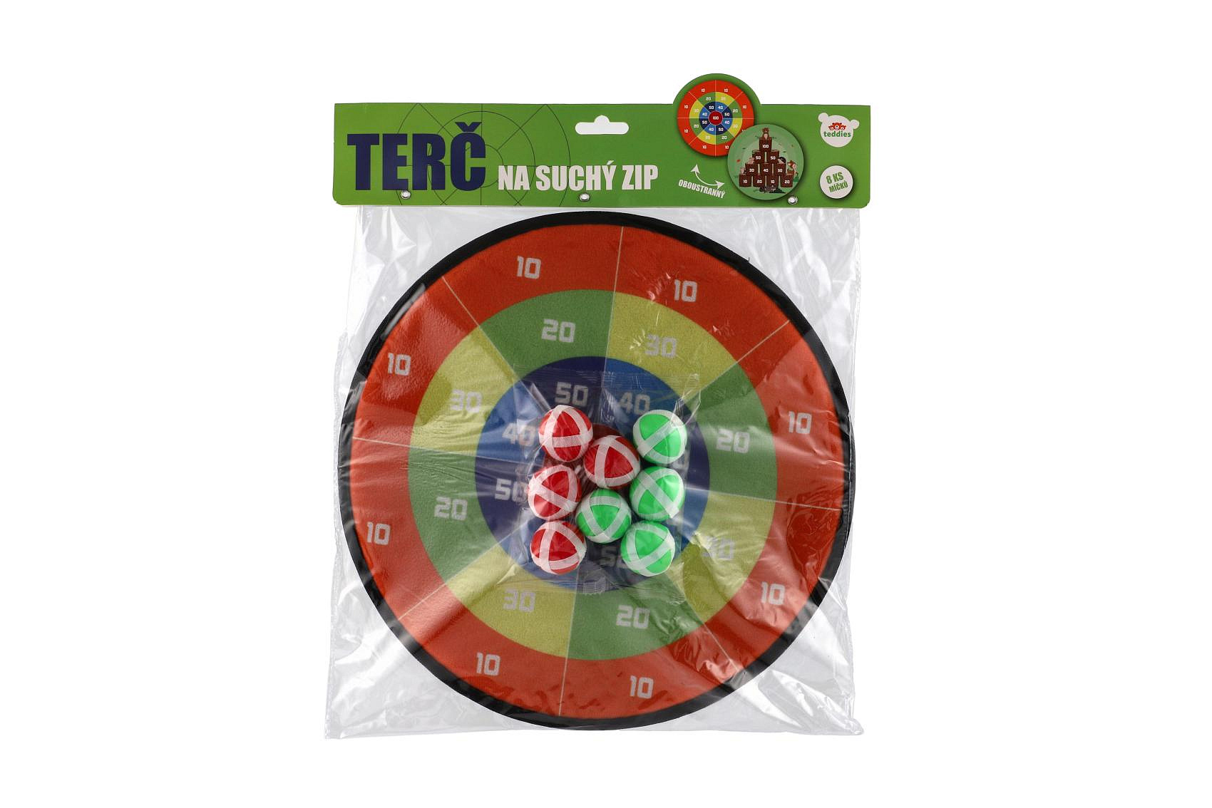 Terč na suchý zip dostane kluky i holky. Je to veselá hra, při které se vaše děti naučí mířit a házet . Nechte vaše děti soupeřit mezi sebou. Cílem hry je hodit co největší čísla. Jejich sčítáním se děti procvičí i v matematice. Terč na suchý zip má dva designy. Jedna strana terče je barevná s čísly, druhá je v motivu zvířátek v lese. Terč má očko na zavěšení. Balení obsahuje: Terč na suchý zip oboustranný + 8 ks míčků se suchým zipem. Průměr terče: 34 cm Vhodné pro děti od 3 let