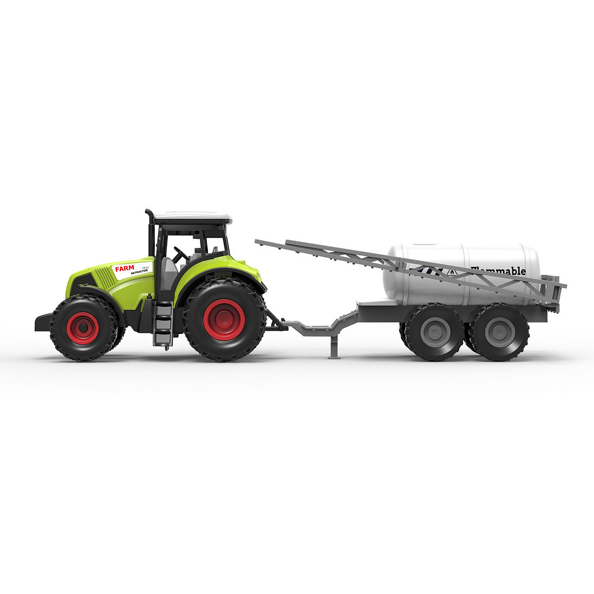 Moderní plastový traktor s vlečkou na postřik, hračka z kolekce Moje malá farma. Nepostradatelný pomocník pro každého malého farmáře! Vlečku můžeš jednoduše odpojit a traktor využít k dalším pracím. Traktor jezdí na setrvačník a jeho délka včetně přívěsu je 37 cm. Zmáčknutím tlačítek traktor vydává reálné zvuky. Traktor vyžaduje 3 ks baterií typu AG13/LR44, které jsou součástí balení.