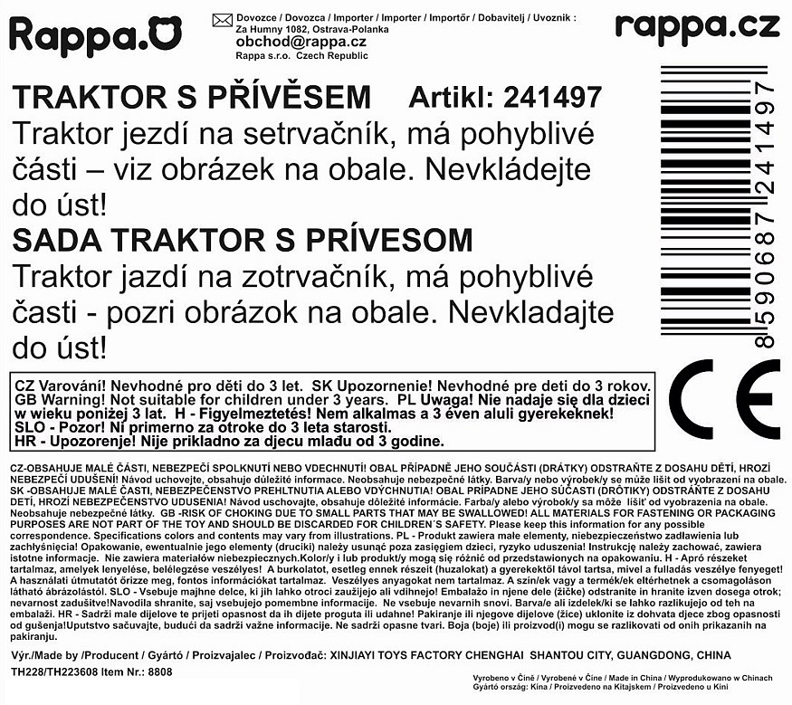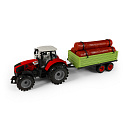 Moderní plastový farmářský traktor s vlečkou na dřevo. Vlečka se dá jednoduše odpojit a klády sundat. Traktor jezdí na setrvačník a jeho délka činí 19 cm. Vlečka jezdí na volný chod a je v délce 22 cm. Celková délka této soupravy je cca 45 cm.