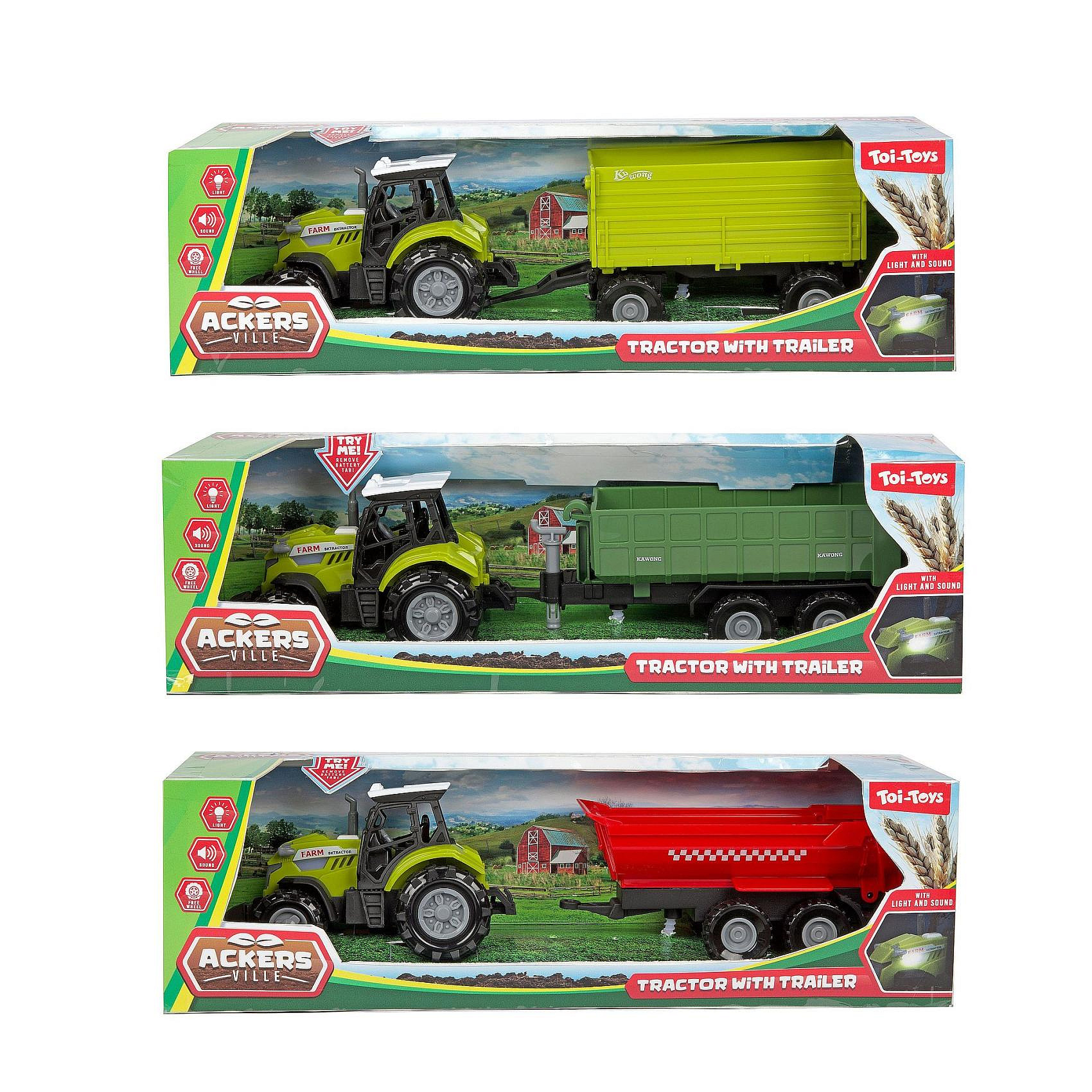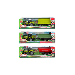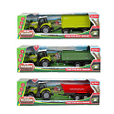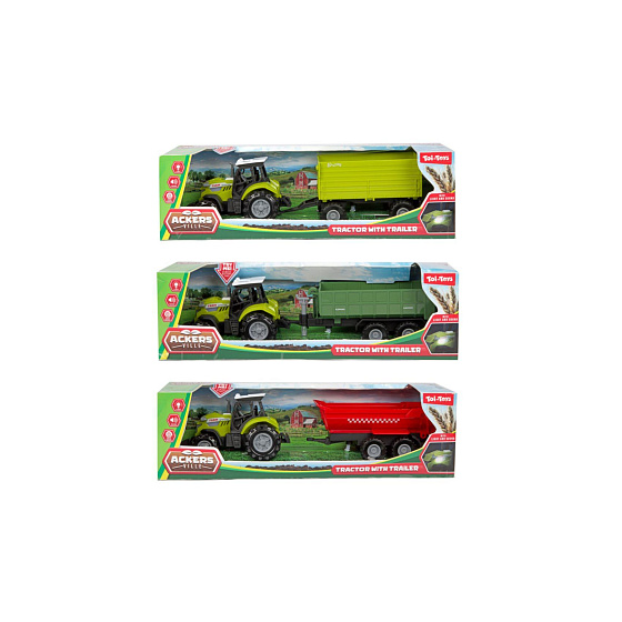 Traktor s vlekem plast 24cm na volný chod na baterie se světlem, zvukem 3 druhy v krabici 29x9cm