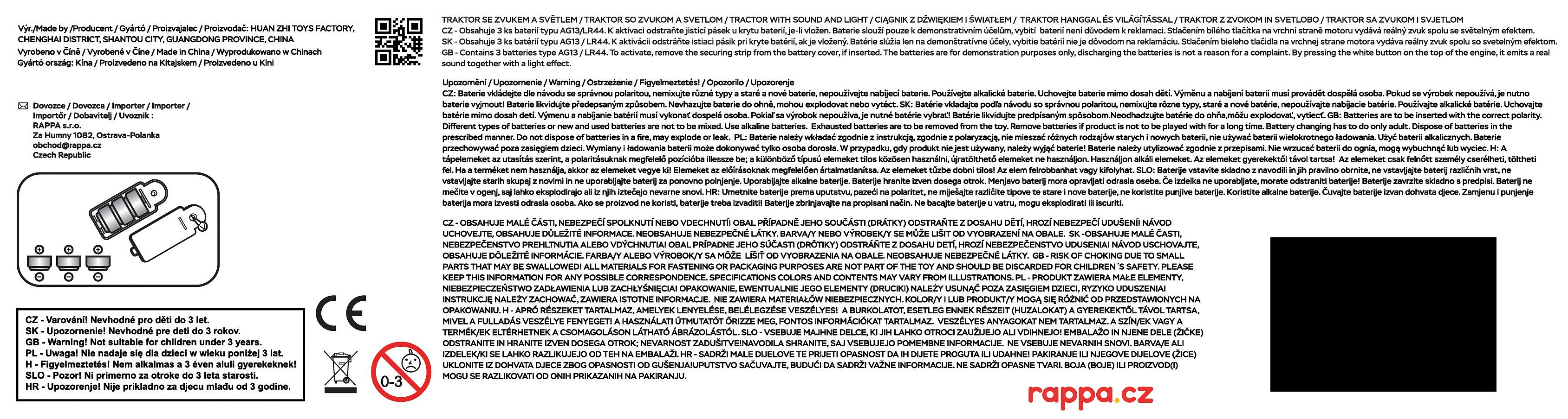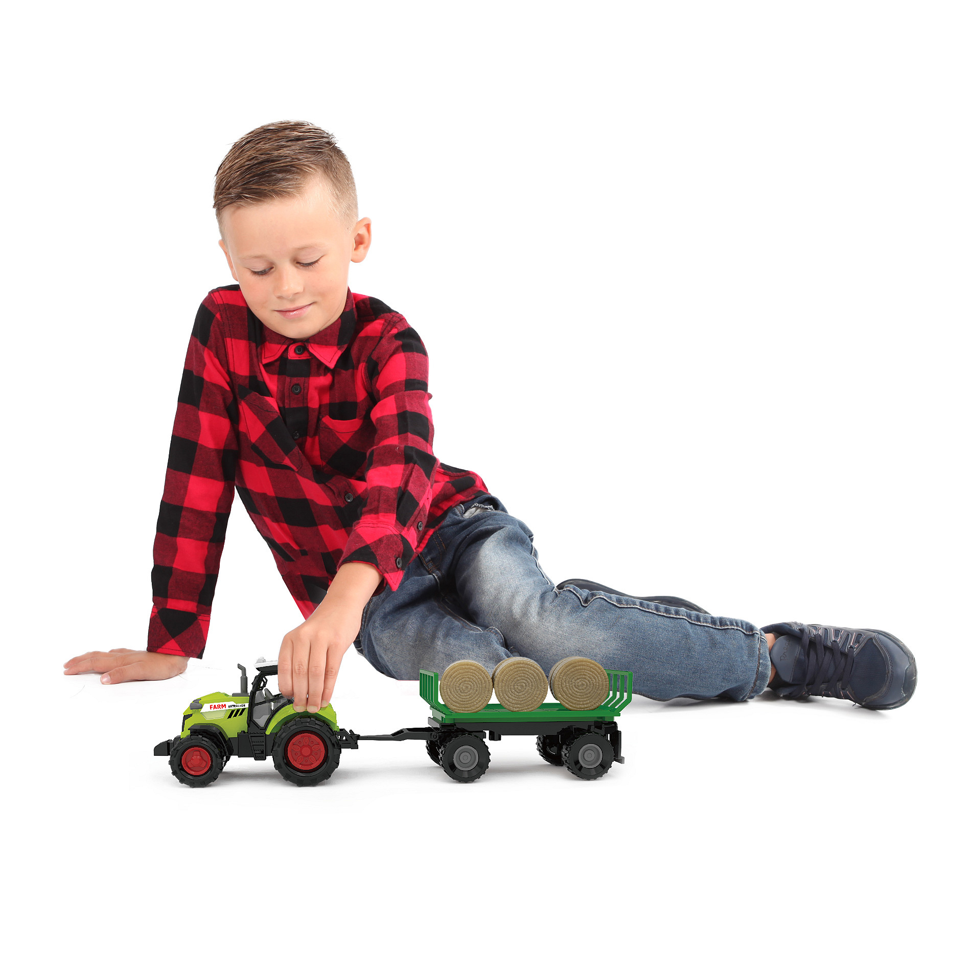 Moderní plastový farmářský traktor s vlečkou a balíky slámy, hračka z kolekce Moje malá farma. Vlečka se dá jednoduše odpojit a balíky sundat. Traktor jezdí na volný chod a jeho délka je 10 cm. Přívěs je v délce 12 cm, celková délka včetně přívěsu je 25 cm. Zmáčknutím tlačítka na traktoru vydává reálné zvuky spolu se světelným efektem. Traktor vyžaduje 3 ks baterií typu AG13/LR44, které jsou součástí balení.
