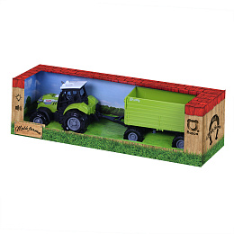 Moderní plastový farmářský traktor s vlečkou, hračka z kolekce Moje malá farma. Vlečka se dá jednoduše odpojit a otevřít. Traktor jezdí na volný chod a jeho délka je 10 cm. Přívěs je v délce 11 cm, celková délka včetně přívěsu je 25 cm. Zmáčknutím tlačítka na traktoru vydává reálné zvuky spolu se světelným efektem. Traktor vyžaduje 3 ks baterií typu AG13/LR44, které jsou součástí balení.