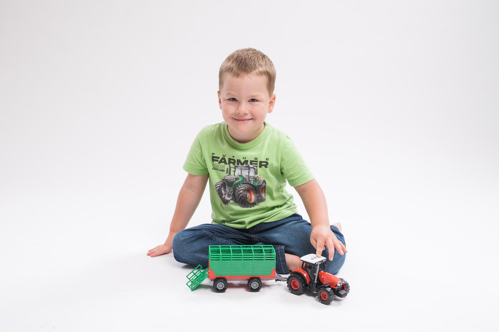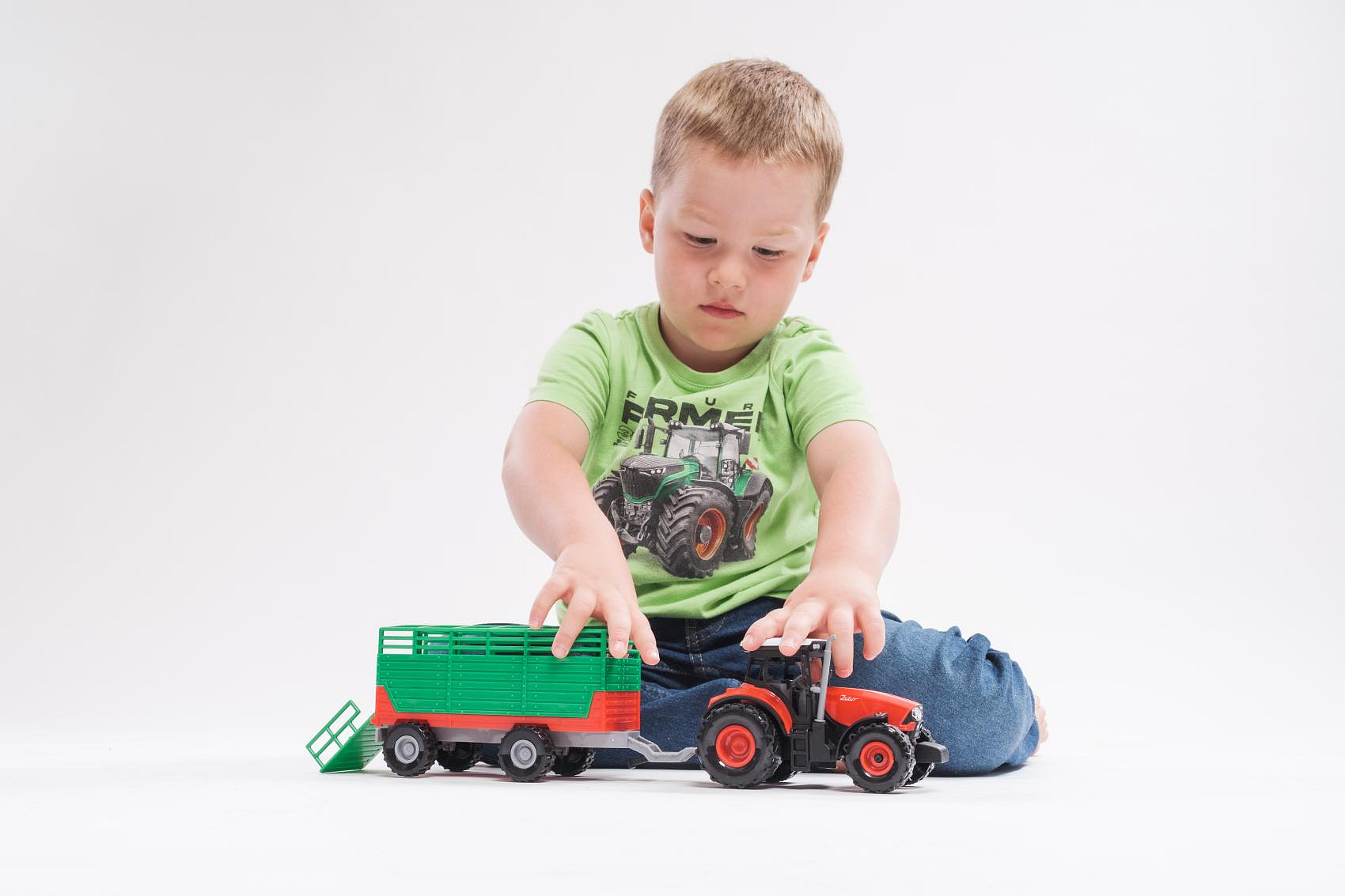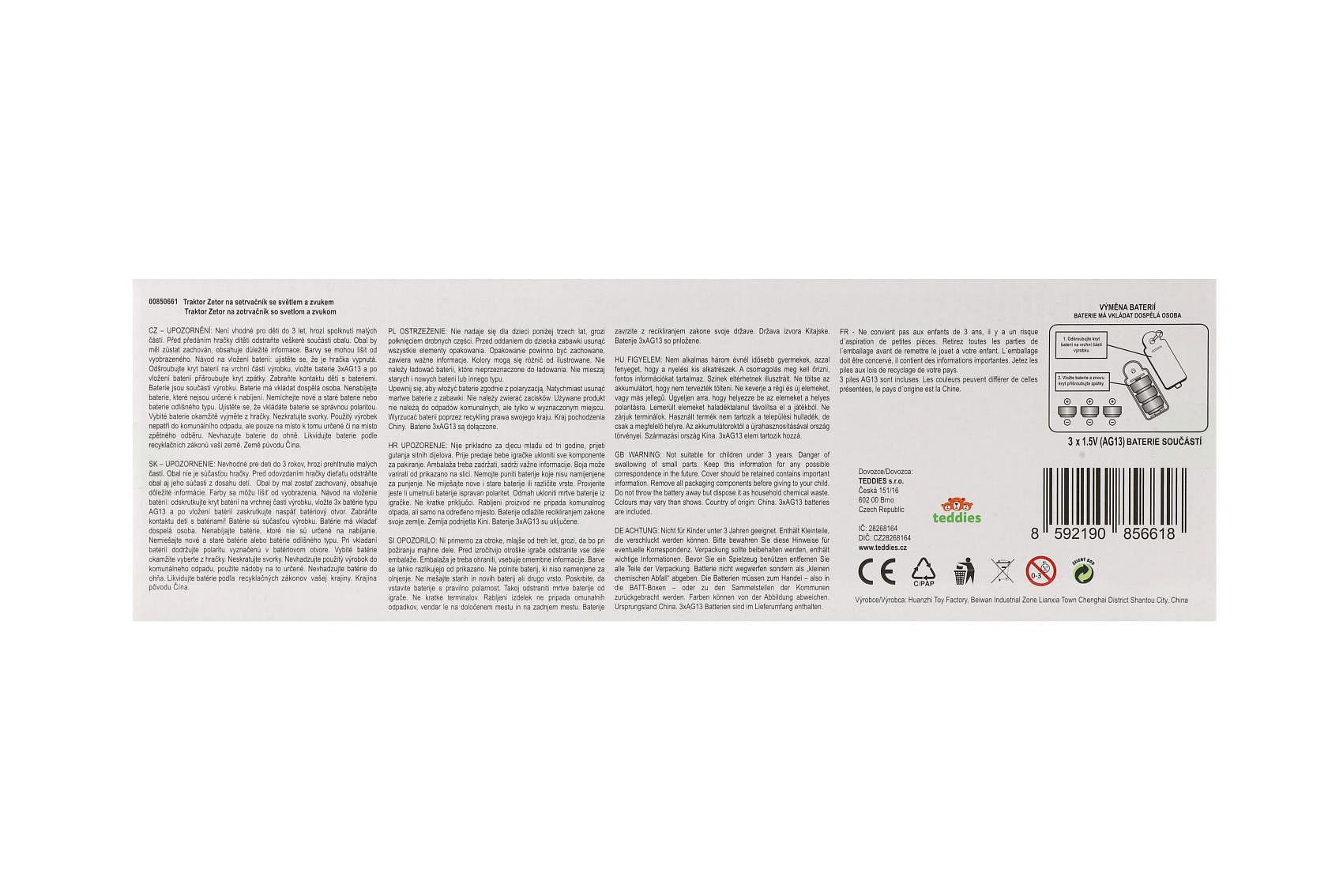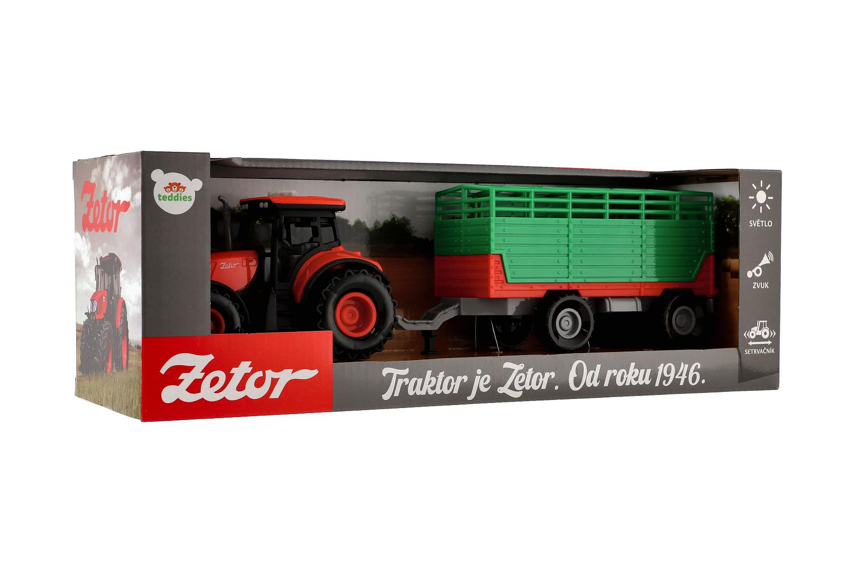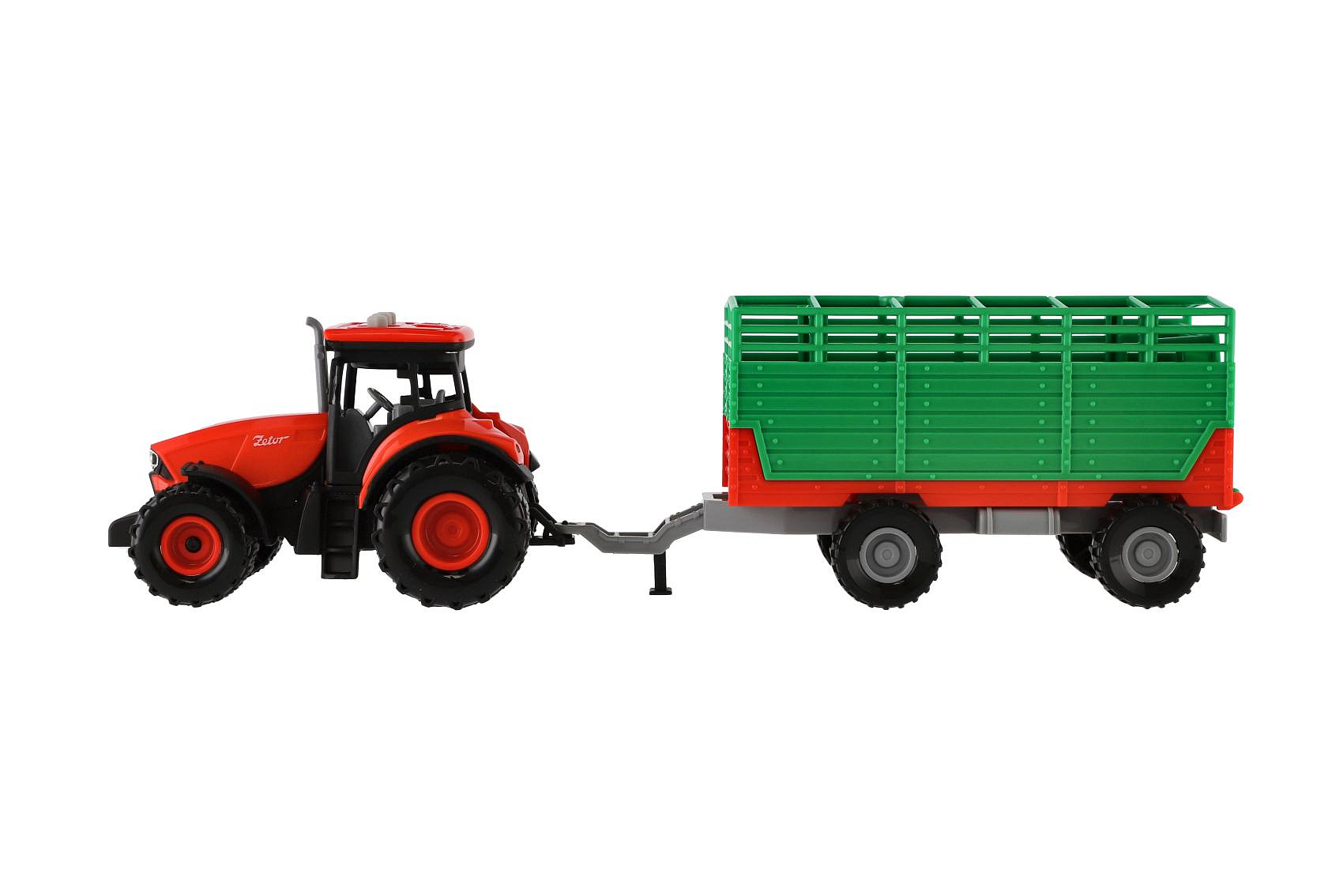 Traktor Zetor s vlekem plast 36cm na setrvačník na bat. se světlem se zvukem v krabici 39x13x13cm