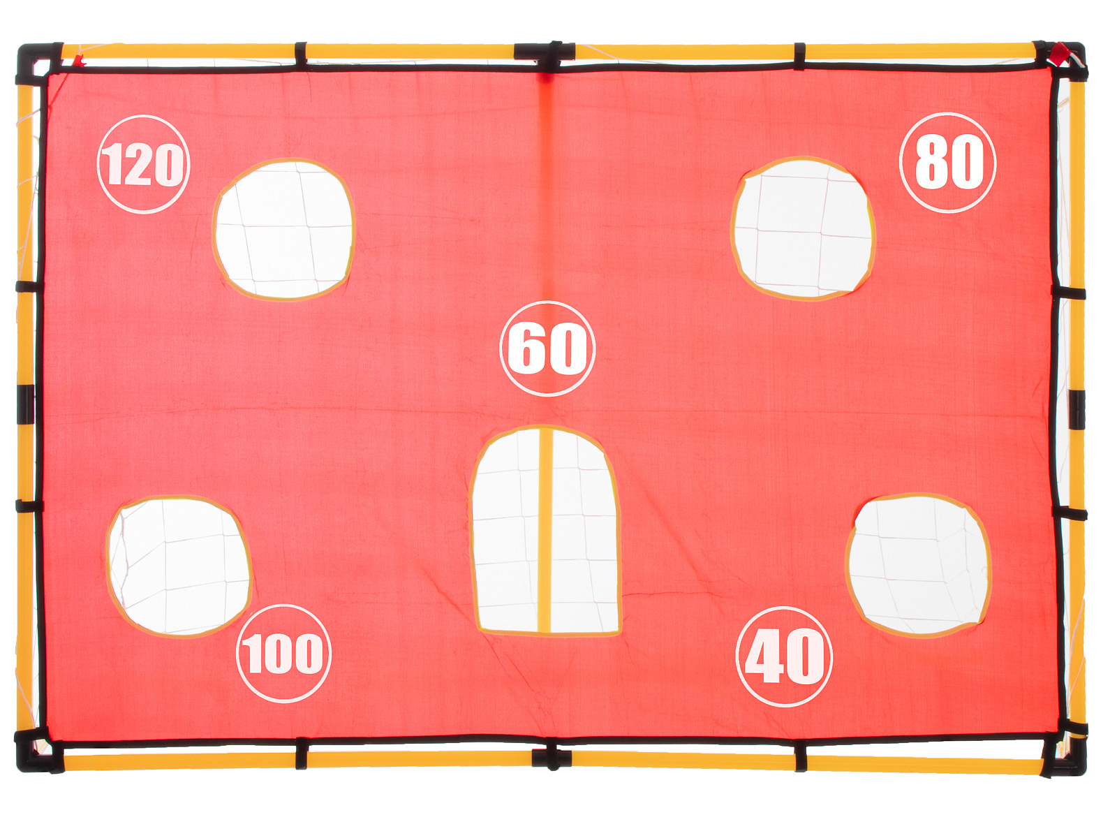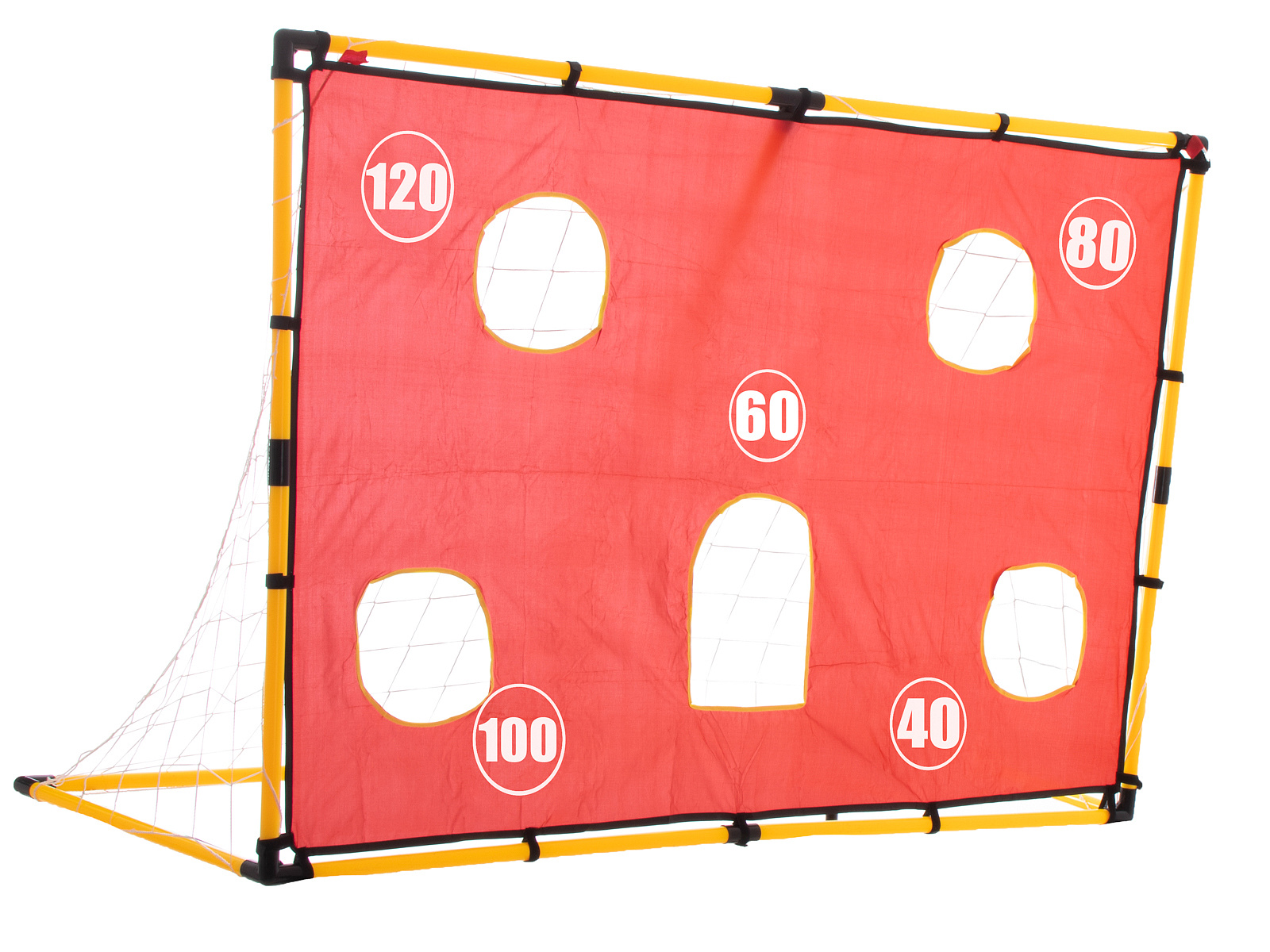 Duża bramka z matą, w której zostały wycięte otwory umożliwi trenowanie celnych strzałów do bramki bez konieczności angażowania bramkarza.