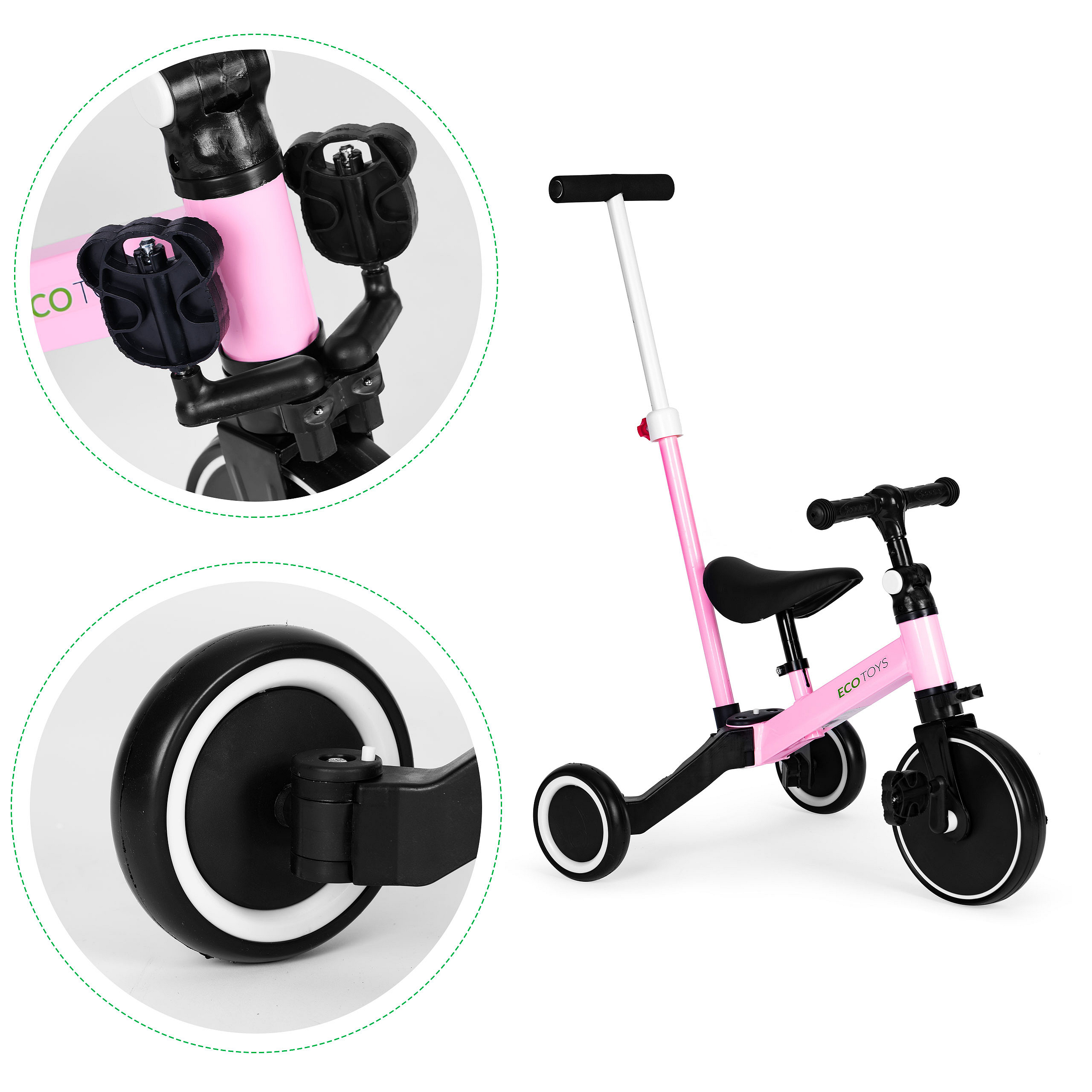 The wheels are made of special EVA material, which means they don’t wear out and leave no marks on floors or tiles. The bike is suitable for indoor and outdoor play.