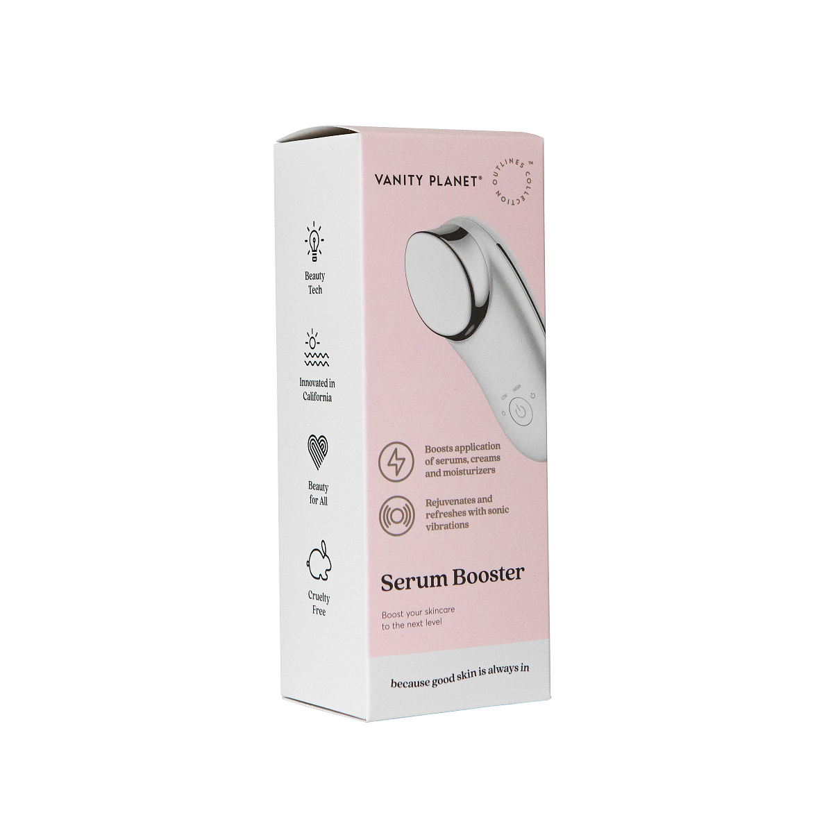Give your skin care routine a sonic boost with the Vanity Planet Serum Booster. Sometimes your skin needs a little help absorbing your daily skin care products like serums, creams or moisturizers. This beauty tool refreshes the skin and improves your daily skin care routine through sonic vibrations. These vibrations ensure that fine lines, wrinkles and puffiness under the eyes are reduced and blood circulation is improved, opening pores. Because the pores are now open, the skin can absorb the skin care products extra well. Get the most out of your skincare and enjoy young, hydrated, even skin with the Vanity Planet Serum Booster. No more age spots, redness and pigmentation, but a fresh glow.
