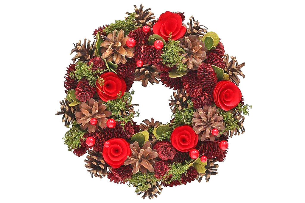 Díky hotovému provedení jej můžete rovnou zavěsit na dveře, stěnu nebo použít jako stolní dekoraci. Červené a zelené tóny evokují tradiční vánoční atmosféru, zatímco detaily ve tvaru růže dodávají věnci luxusní a slavnostní vzhled.