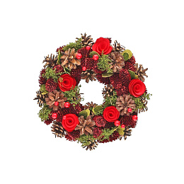 Ozdobte svůj domov krásným vánočním věncem o průměru 26 cm. Tento již hotový věnec je bohatě zdobený přírodními a dekorativními prvky - šiškami, červenými bobulemi, zelenými lístky a elegantními dekoracemi ve tvaru růže.