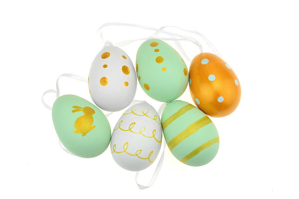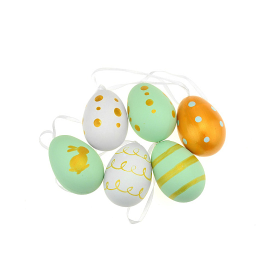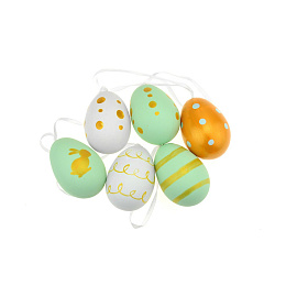 Sada 6ks barevných velikonočních vajíček s malovynými obrázky a ornamenty. Vajíčka jsou opatřena šňůrkou na zavěšení. Materiál: plast Rozměr: 6 cm