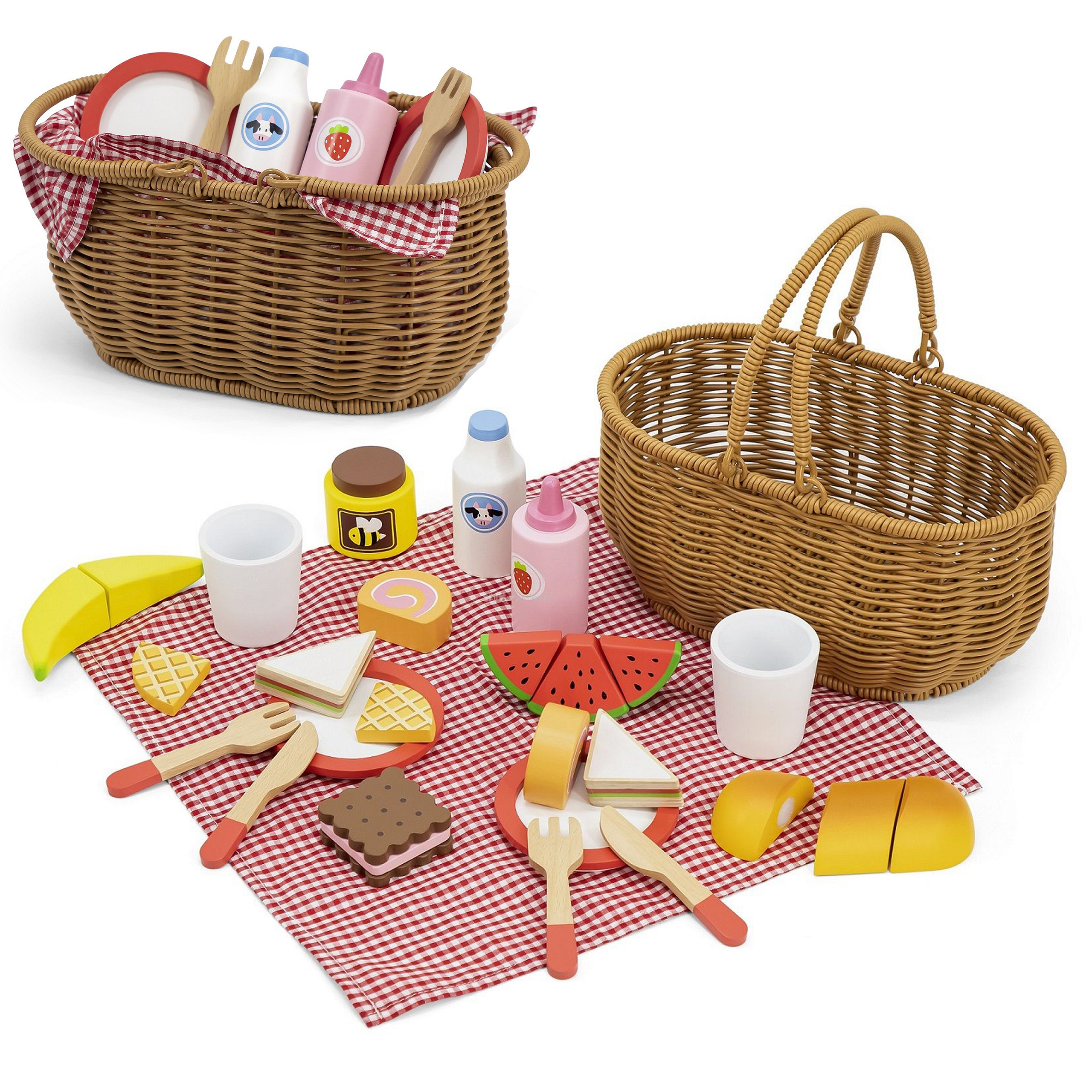 Wybierz się z przyjaciółmi na wesoły piknik z Drewnianym Zestawem Piknikowym od marki VIGA. Piękny koszyk wykonany ze sztucznej trzciny wypełniony jest drewnianym zestawem akcesoriów i tkaniną w kratę. Dzięki solidnym uchwytom Twoje dziecko z łatwością zabierze ze sobą cały zestaw, gdziekolwiek się uda. Zawarte w komplecie drewniane przekąski i akcesoria pozwolą na zabranie na piknik swoje ulubione zabawki, maskotki czy też odegranie scenki ze swoim przyjacielem. Zabawa z tym zestawem jest możliwa na świeżym powietrzu, jak i w domowym zaciszu. Część potraw składa się z kilku części i przymocowane są za pomocą rzepów. Za pomocą drewniane noża maluch może kroić je na kawałki, dzięki czemu rozwinie swoje zdolności motoryczne. Naśladowanie dorosłych przyczyni się za to do rozwoju umiejętności społecznych.