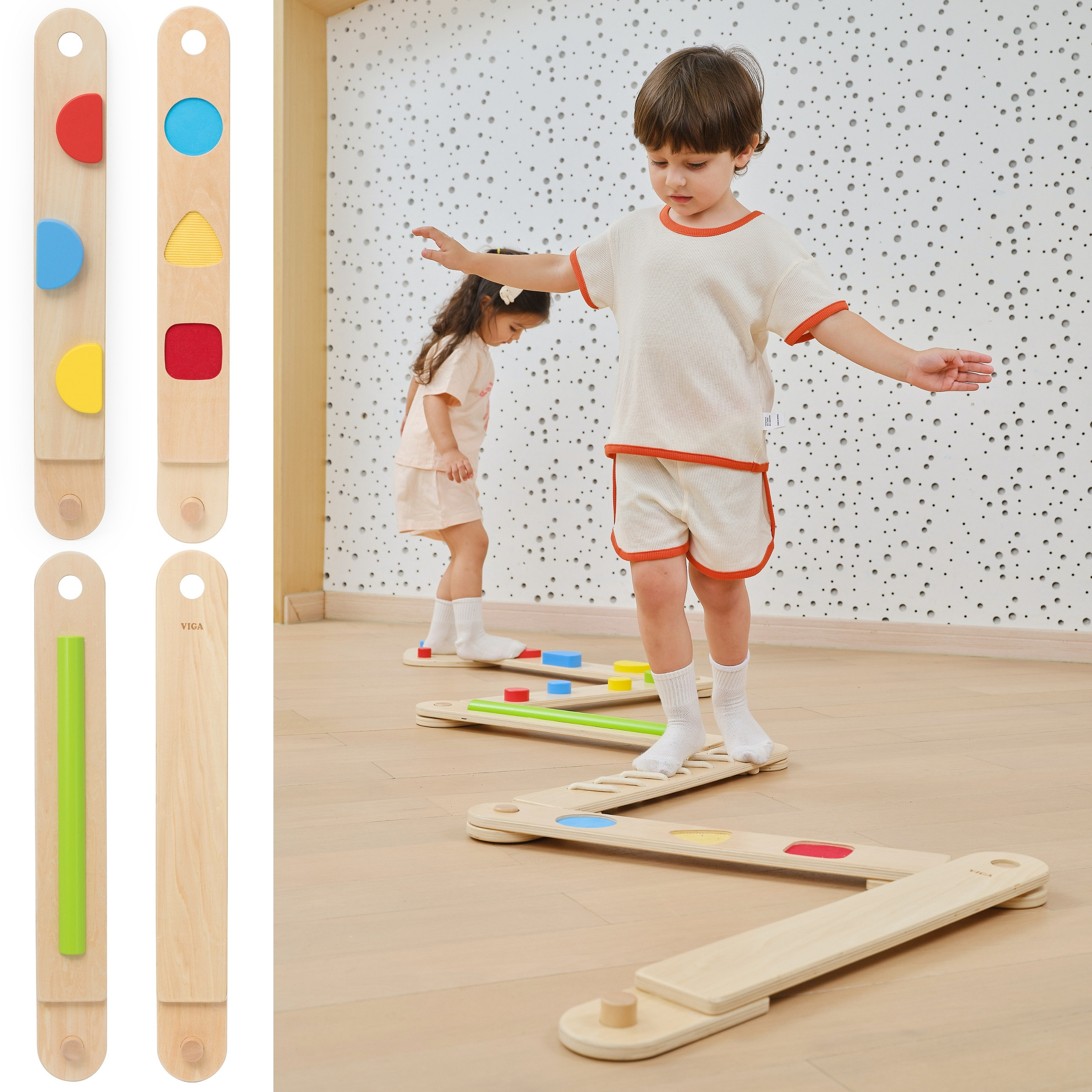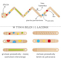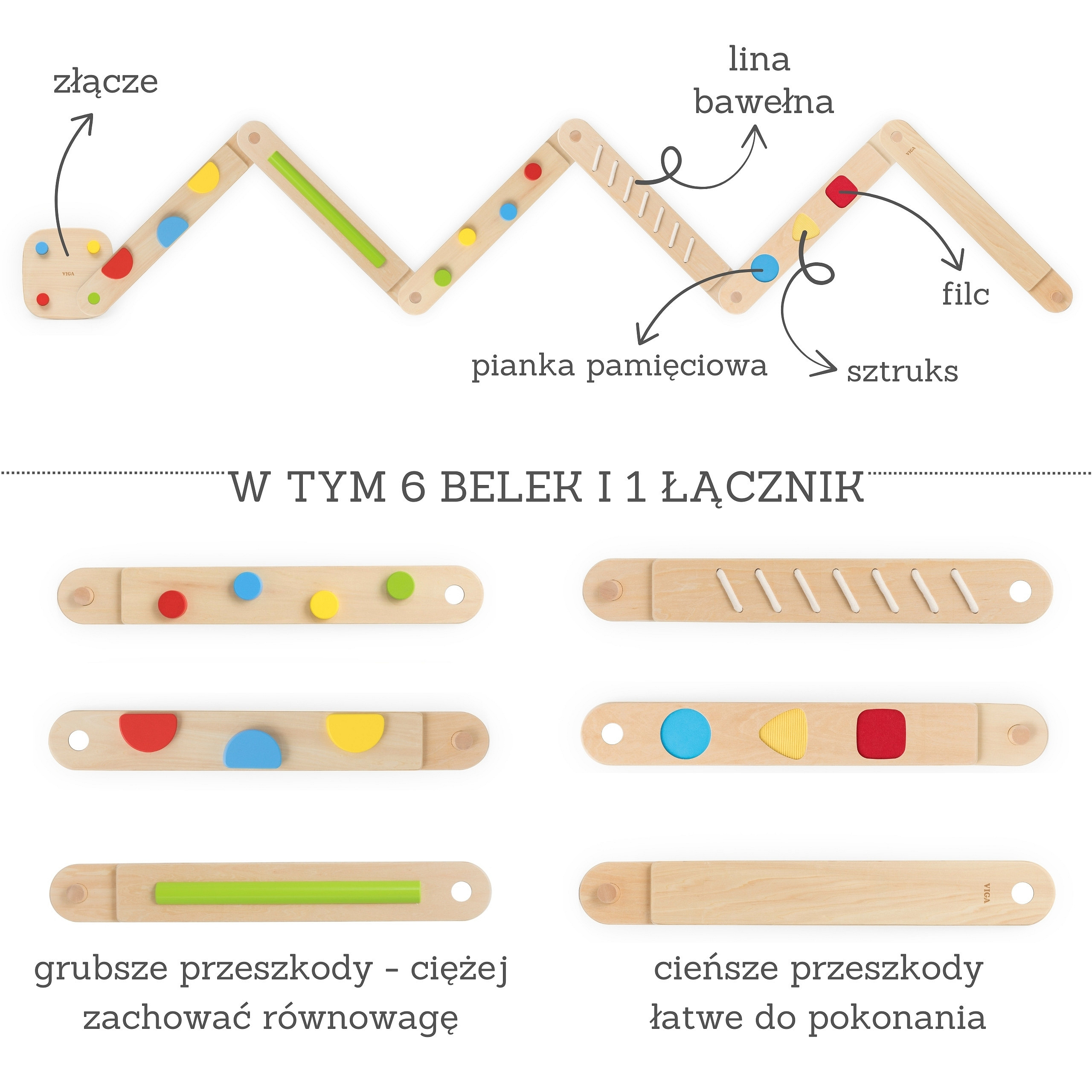 Odkryj i rozwijaj świat zmysłów dzięki innowacyjnemu zestawowi sensorycznych belek równoważnych od marki Viga. Ta wyjątkowa zabawka, składająca się z 6 belek i 1 łącznika, pozwala dziecku na swobodne tworzenie własnych, unikalnych torów i ścieżek równowagi. Każda belka zawiera zróżnicowane przeszkody, które dostarczają różnorodnych bodźców dotykowych, wspierając tym samym rozwój koordynacji, kreatywności i pewności siebie Twojego malucha. Zestaw zawiera zarówno belki z łatwiejszymi, jak i trudniejszymi przeszkodami, co pozwala na dostosowanie poziomu trudności do umiejętności dziecka. Łączniki są zintegrowane z belkami, co znacznie ułatwia montaż i przechowywanie zabawki. To idealne narzędzie do rozwoju dużej motoryki i świadomości ciała w przestrzeni, które zapewnia bezpieczną i pełną wrażeń zabawę.