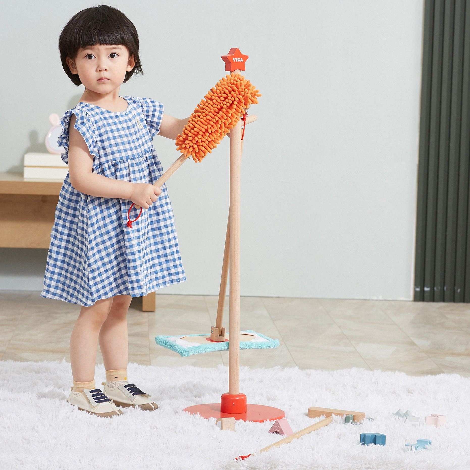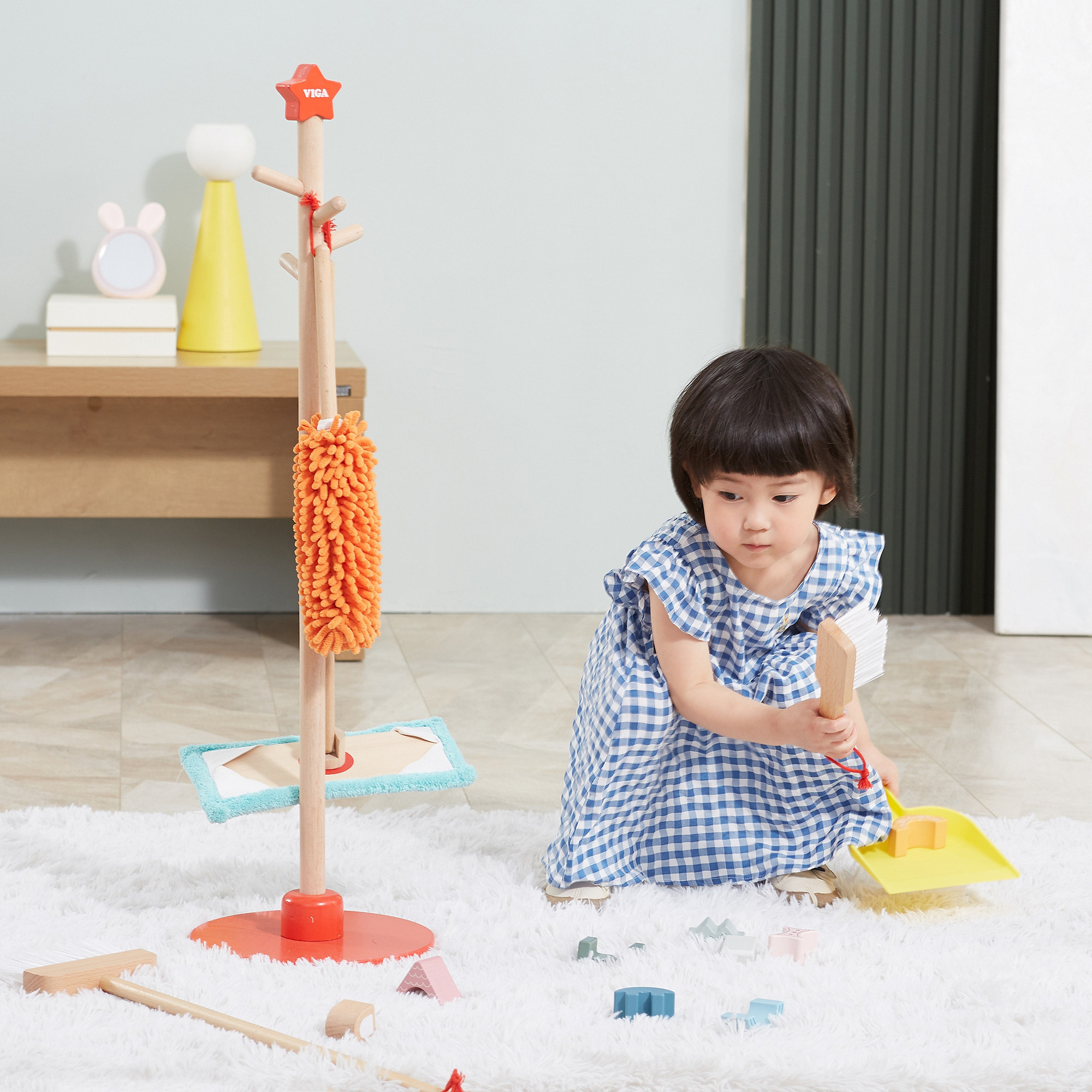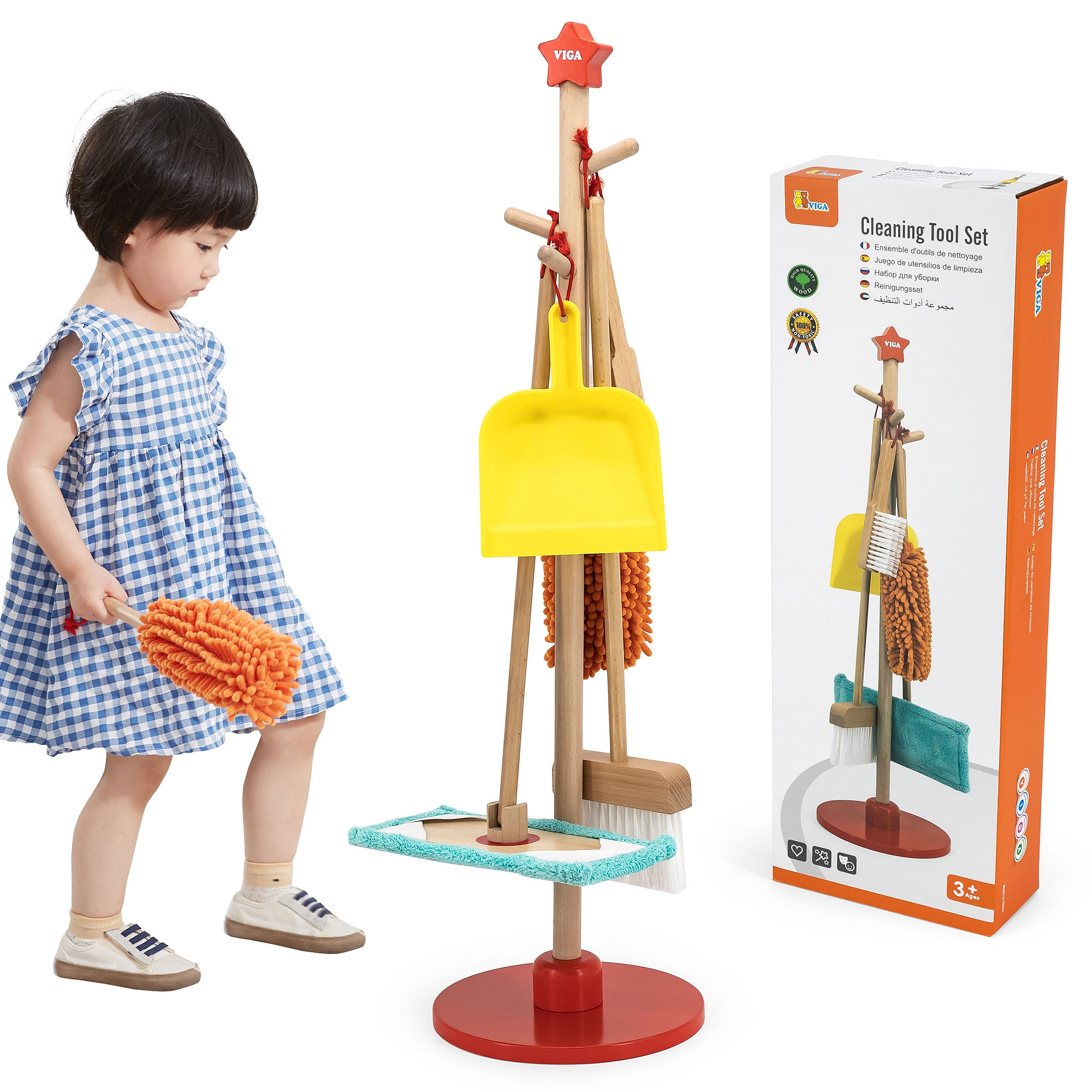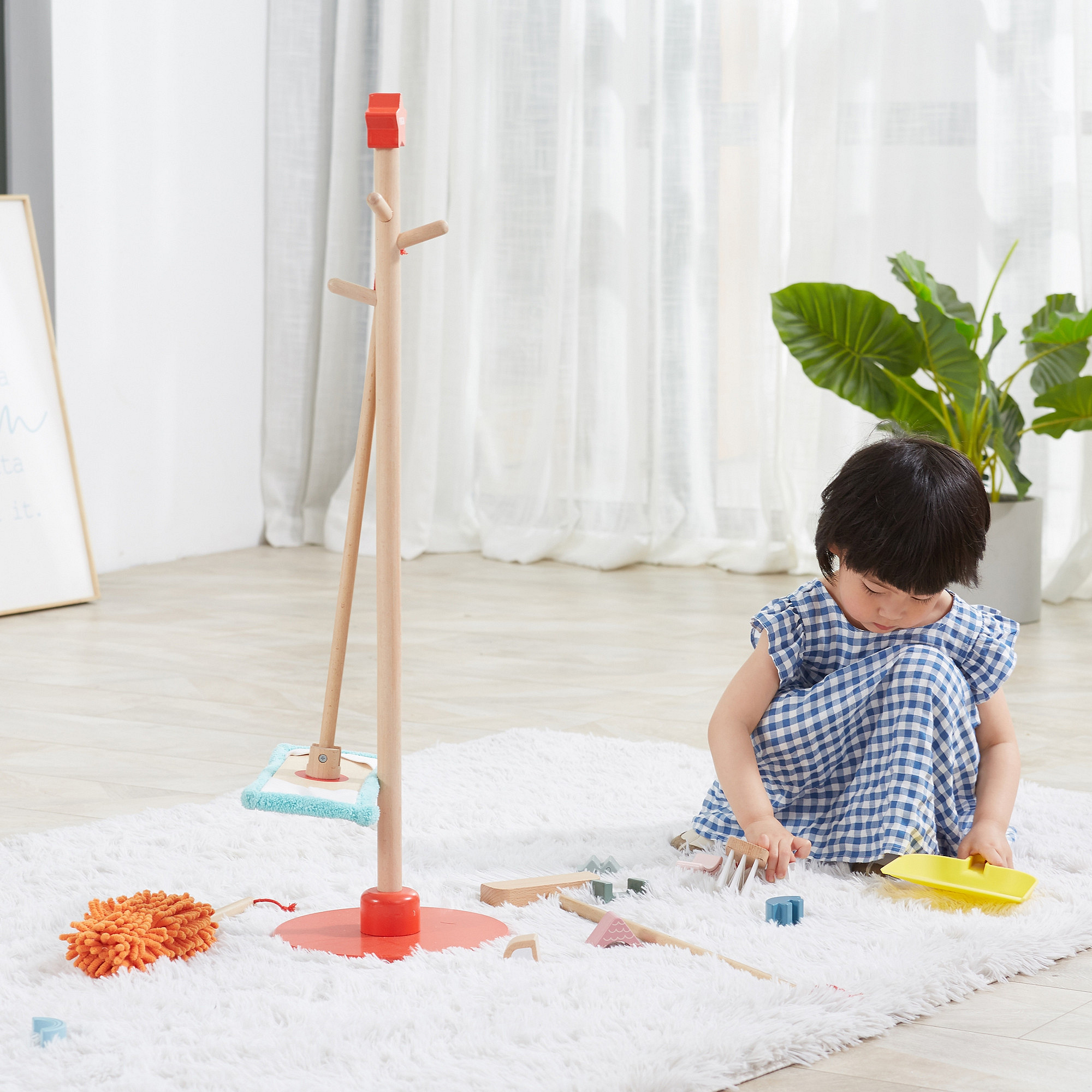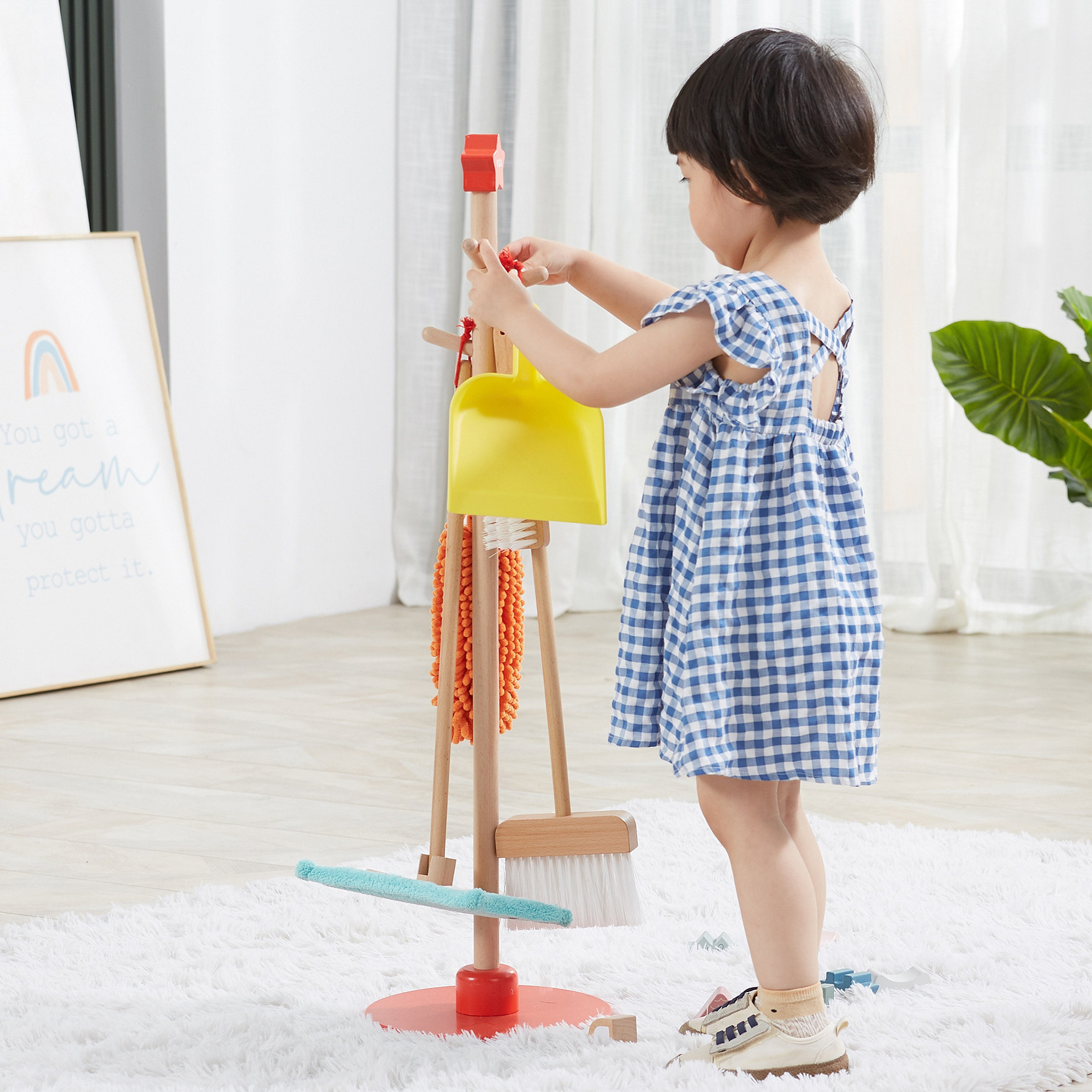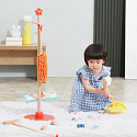Sprzątanie zazwyczaj kojarzy się dzieciom dość negatywnie, jako przykry obowiązek czy nudne i męczące zajęcie. Zestaw do sprzątania to akcesoria dopasowane do małych pomocników, zarówno wielkością jak i ciężkością. Przedmioty można łatwo przechowywać za pomocą stojaka z czerwoną podstawą, na którym można je zawiesić. Dzięki zestawowi do sprzątania dziecko nauczy się sposobu, w jaki należy używać poszczególnych przedmiotów. Maluch nauczy się dbać o porządek i czystość w swoim pokoju.