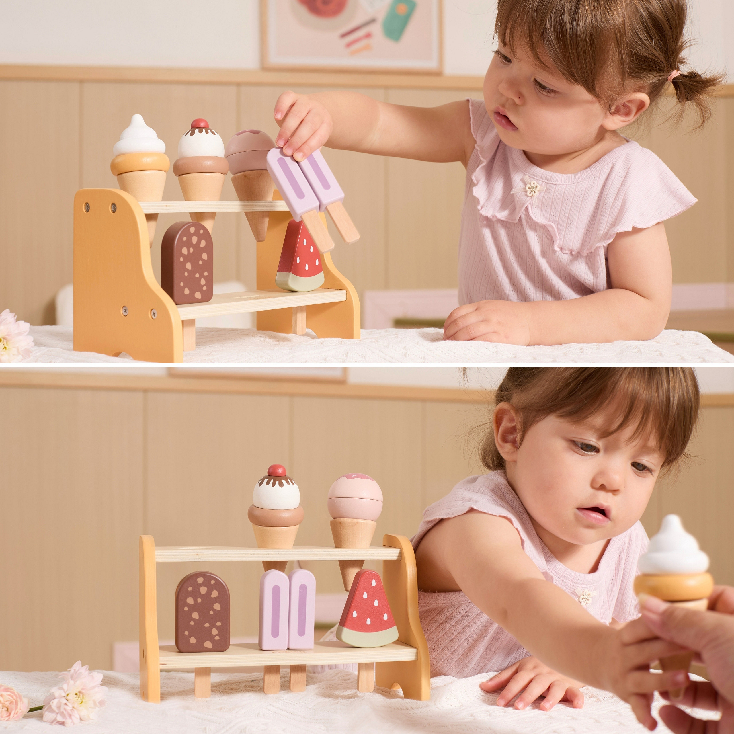 Ten uroczy zestaw zawiera 6 kolorowych lodów od marki VIGA– 3 rożki i 3 lody na patyku – ozdobione kultowymi wzorami, które zachwycą każde dziecko. Dwuwarstwowy, drewniany stojak pozwala eksponować lody i utrzymać porządek podczas zabawy. Wyjmowane elementy stymulują małą motorykę i rozwijają zabawę dotykową. Idealny do kreatywnego odgrywania ról – np. własnego straganu z lodami!