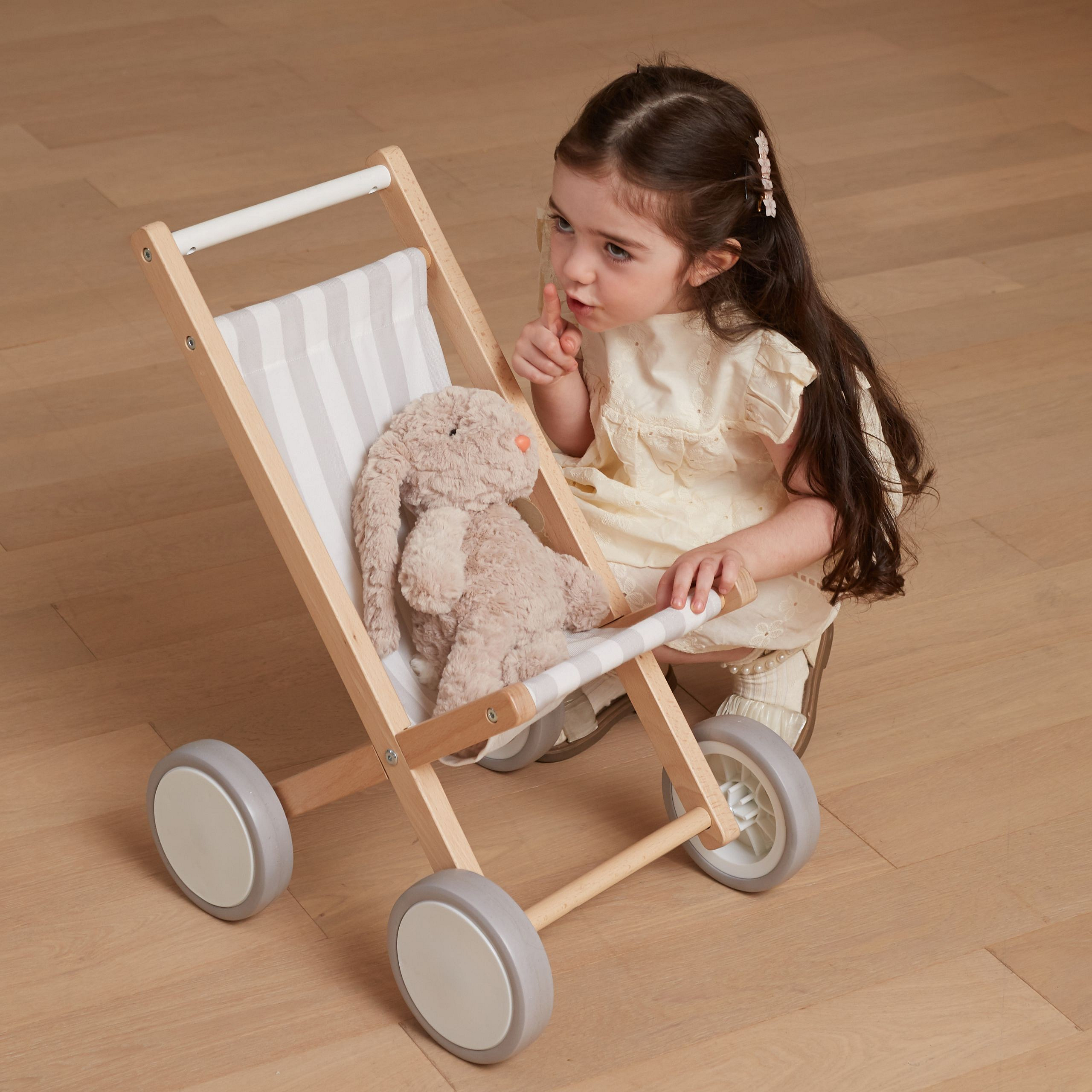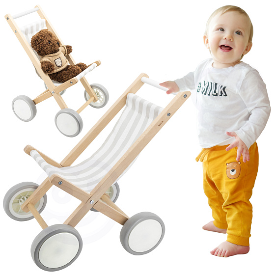 Wózek dla Lalek od marki VIGA wykonany z solidnego drewna bukowego, z dużymi plastikowymi kołami i gumowymi, antypoślizgowymi oponami. Przeznaczony jest dla lalek o rozmiarze do 38 cm.