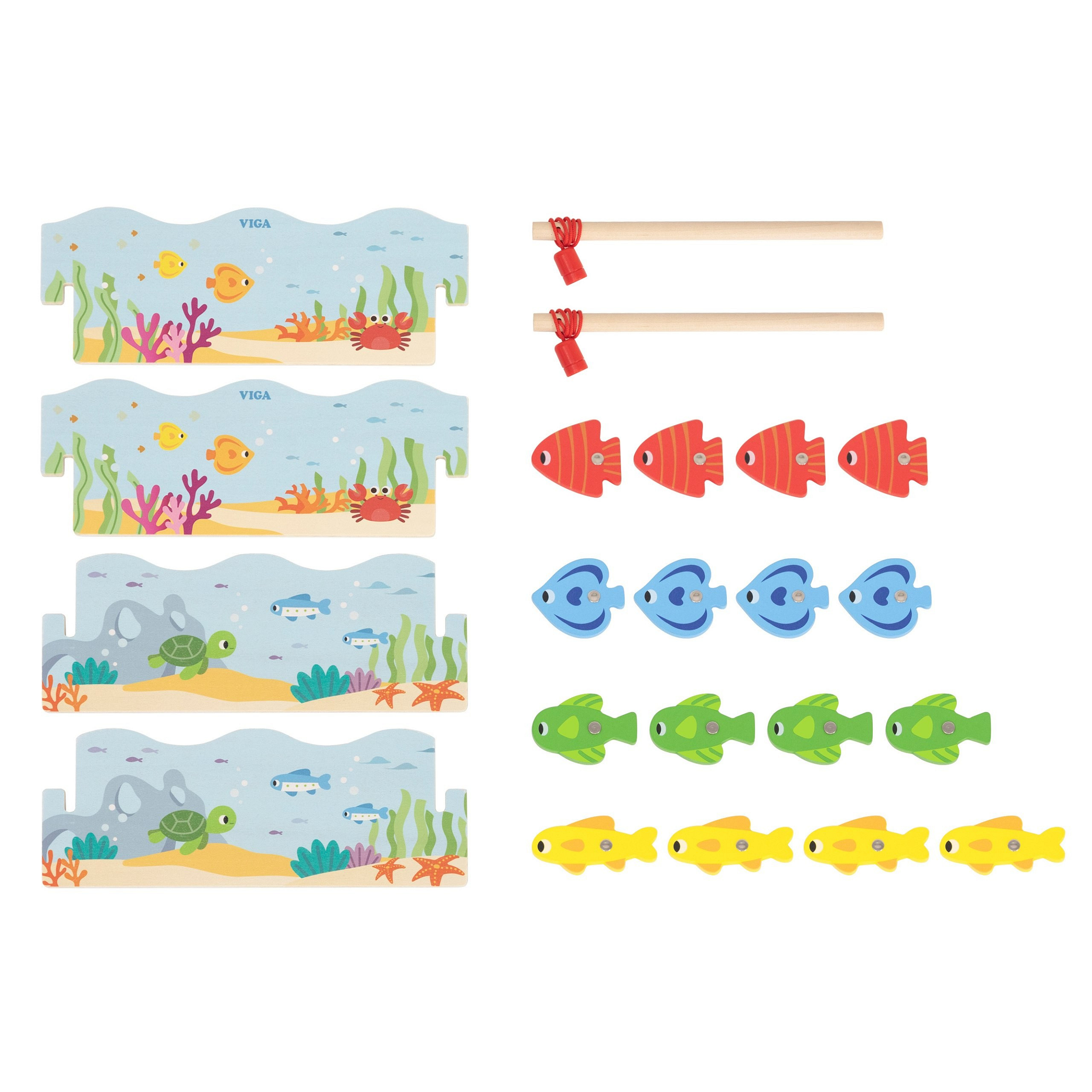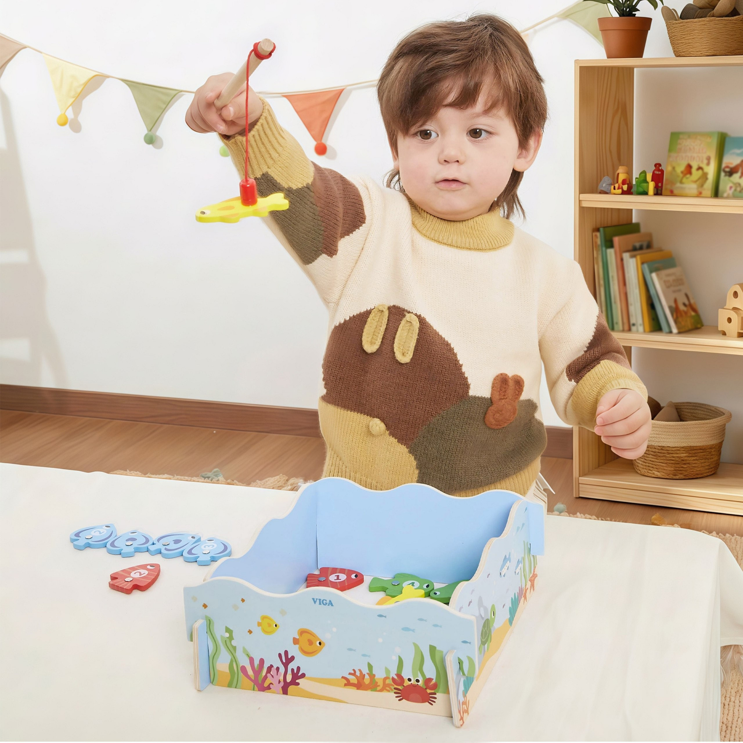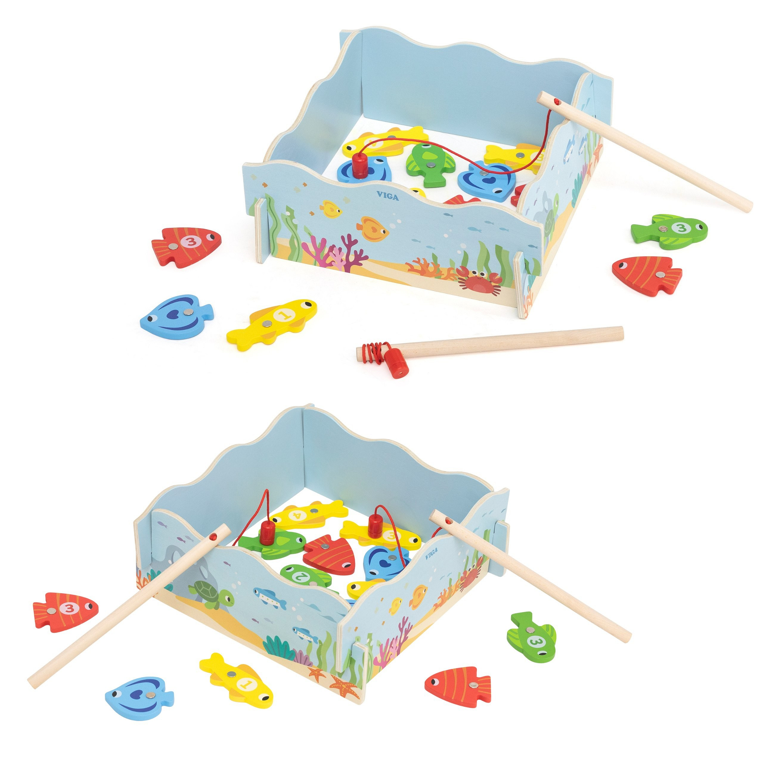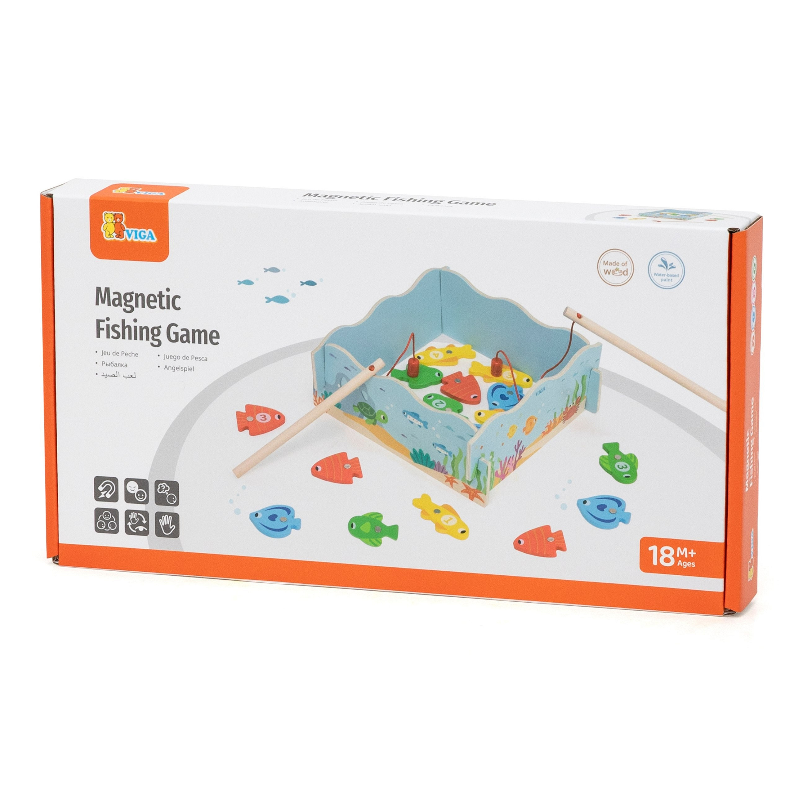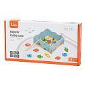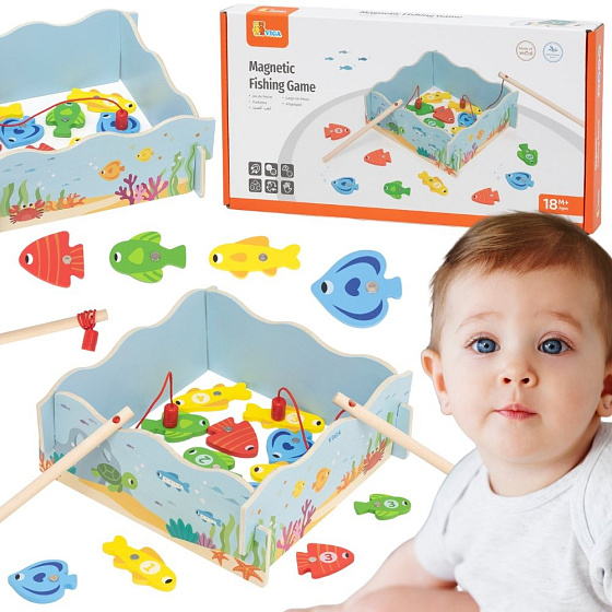 Drewniana gra magnetyczna Wędkowanie od marki Viga pozwala maluchowi łowić kolorowe rybki za pomocą bezpiecznej wędki z magnesem. Każda rybka ma numer, co wprowadza dziecko w świat liczb i nauki kolorów. Pudełko pełni funkcję stawu, a po zabawie służy do przechowywania wszystkich elementów. To idealny prezent dla dzieci powyżej 18 miesiąca życia, rozwijający umiejętności manualne i koordynację wzrokowo-ruchową.