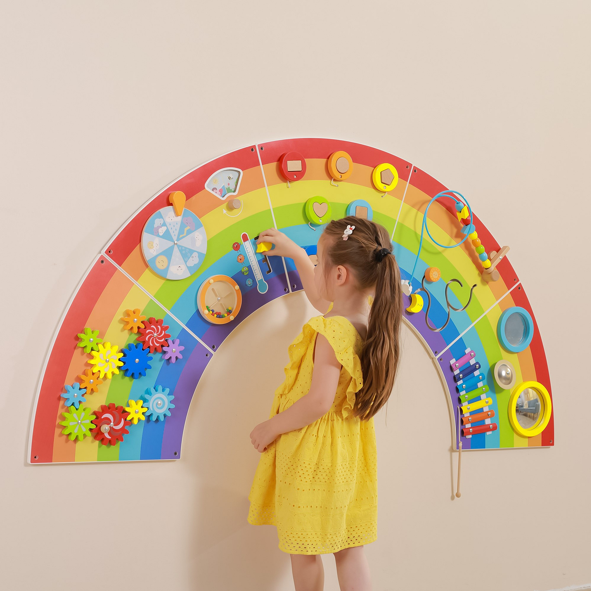 Tablica Sensoryczno - Manipulacyjna Tęcza marki Viga Toys to drewniana, wielofunkcyjna zabawka na ścianę, która zapewni dzieciom godziny świetnej zabawy. Wśród różnych aktywności znajdziesz tutaj 12 czynności: obracające się koła zębate, tablicę pogody, toczący się dysk, dopasowanie klocków, ksylofon, wklęsłe i wypukłe lustro, gong i przeplatanka koralików. Tablica pogody została specjalnie zaprojektowana, aby pasowała do motywu tęczy. Zmieniający się panel pór roku można badać w połączeniu ze zmianami pogody i wahaniami temperatury. Podzielony na 5 części dla łatwego transportu i montażu. Wszystkie 5 części są tej samej wielkości, dzięki czemu można je montować w dowolnej kolejności. Zakrzywiona konstrukcja zachęca dzieci o różnym wzroście do jednoczesnej zabawy i nauki podstawowych pojęć dotyczących kolorów, kształtów, dźwięków i pogody. Zabawka została zaprojektowana tak, aby stymulować zmysły i wspierać rozwój motoryki dziecka. To doskonałe ćwiczenie zręczności małych paluszków. Zabawka uczy również logicznego myślenia oraz cierpliwości. Idealne uzupełnienie środowiska wczesnej nauki i placówek opieki nad dziećmi.