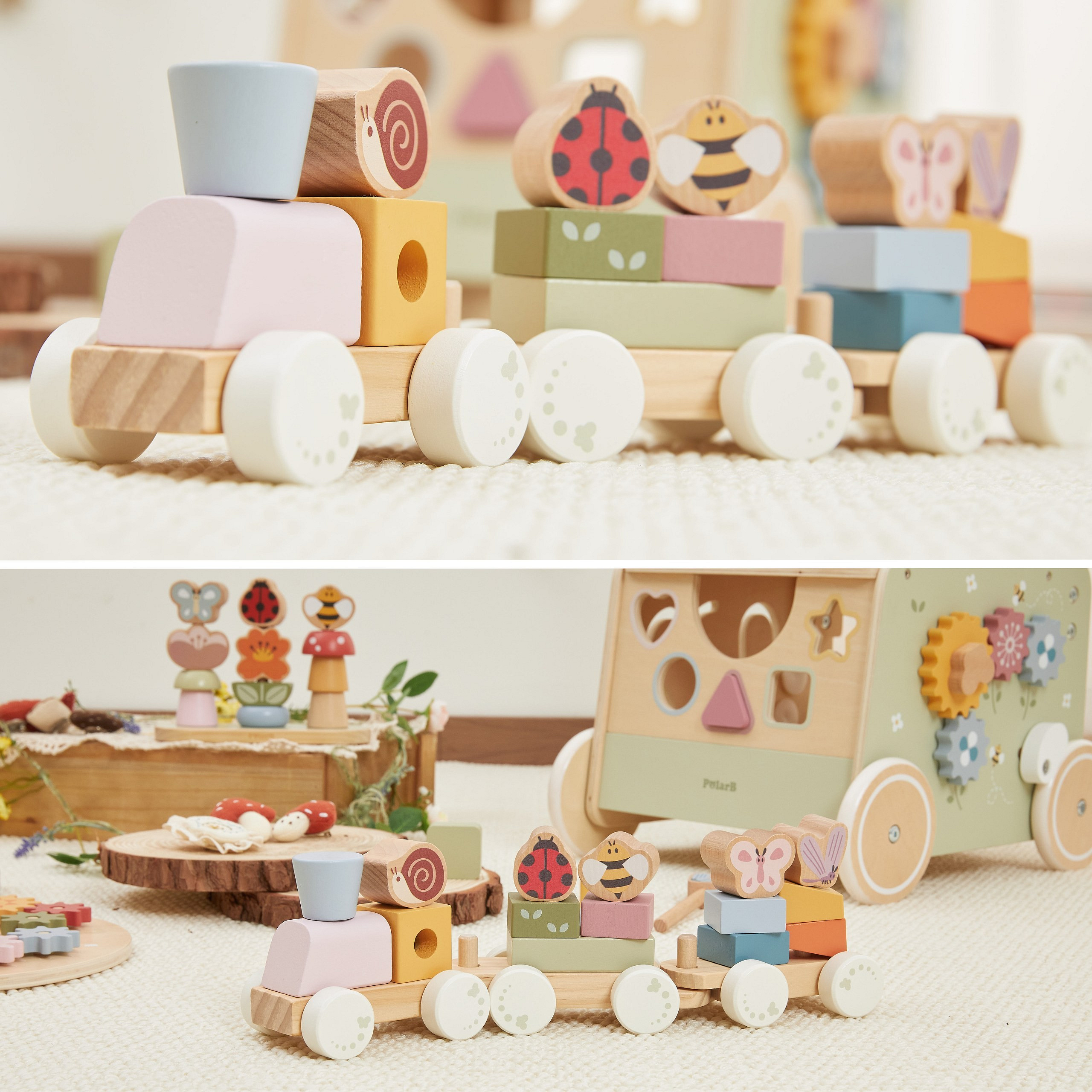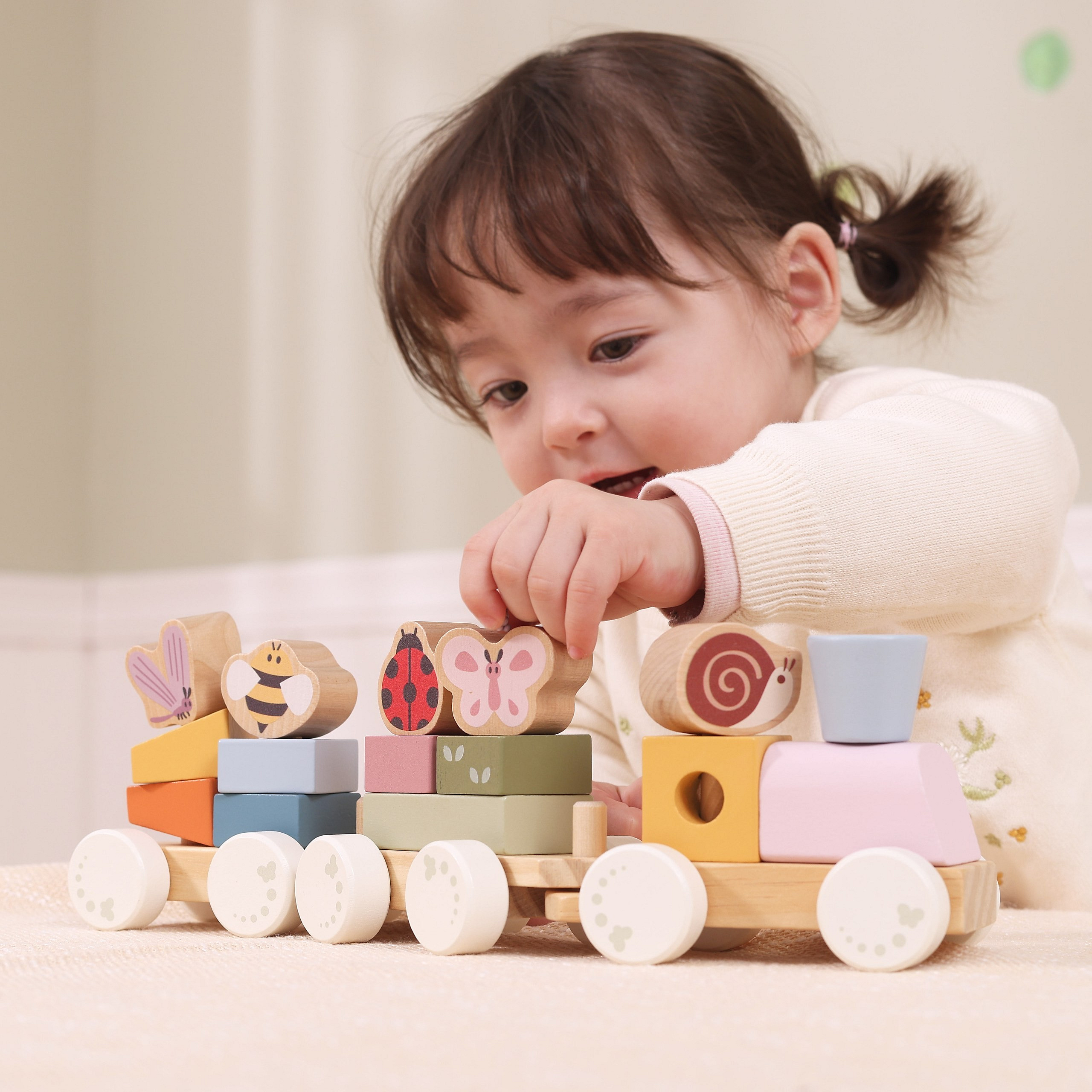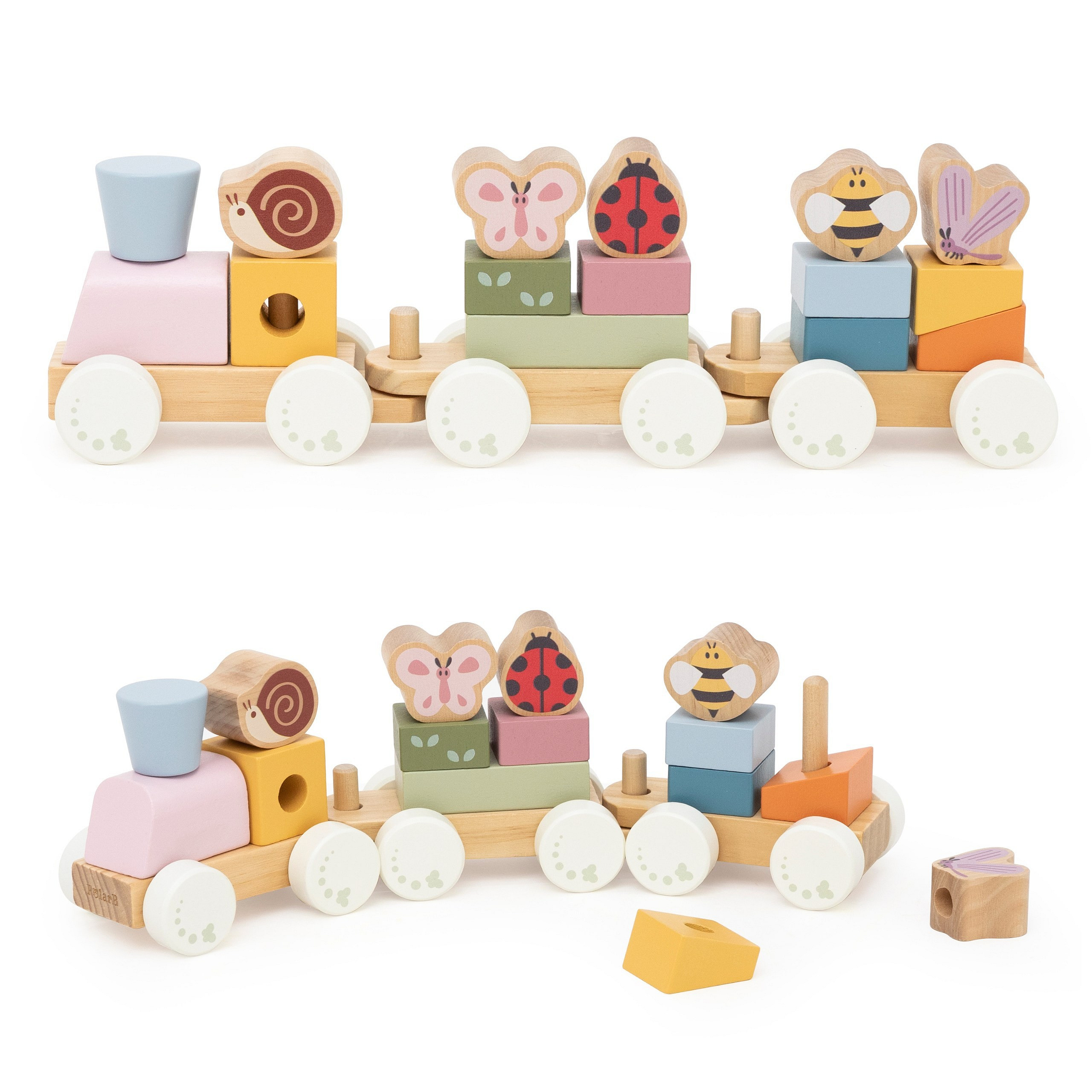 Ten uroczy, wiosenny pociąg do układania od marki Viga, to idealne połączenie zabawy i nauki. Pastelowe kolory oraz sympatyczne motywy owadów przyciągają uwagę dziecka i zachęcają do kreatywnej zabawy. Dzięki możliwości dowolnego układania klocków, maluch może tworzyć własne kompozycje i historie. Połączone wagoniki można również rozdzielać, co daje jeszcze więcej możliwości zabawy. To zabawka, która bawi, uczy i wspiera rozwój na wielu poziomach jednocześnie.