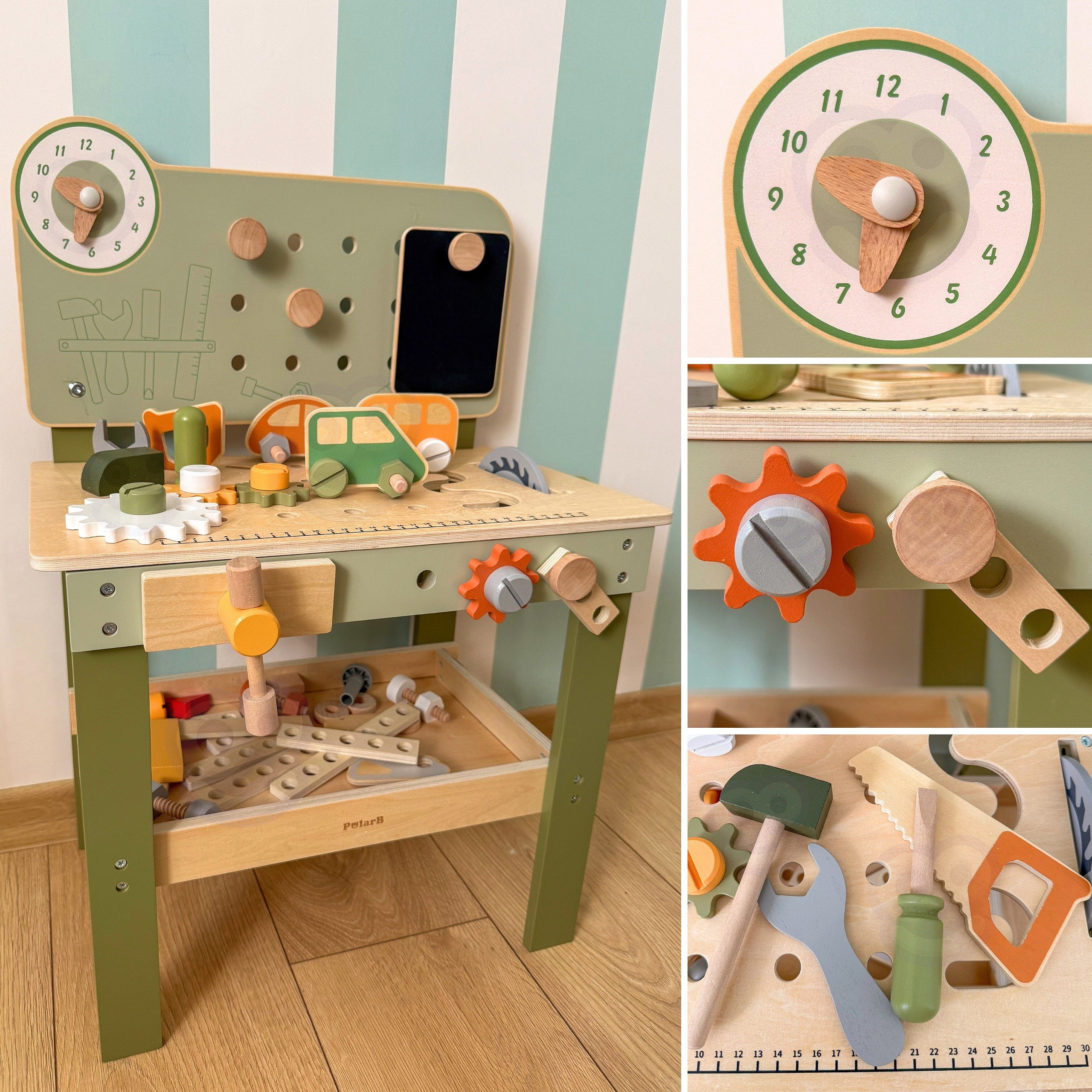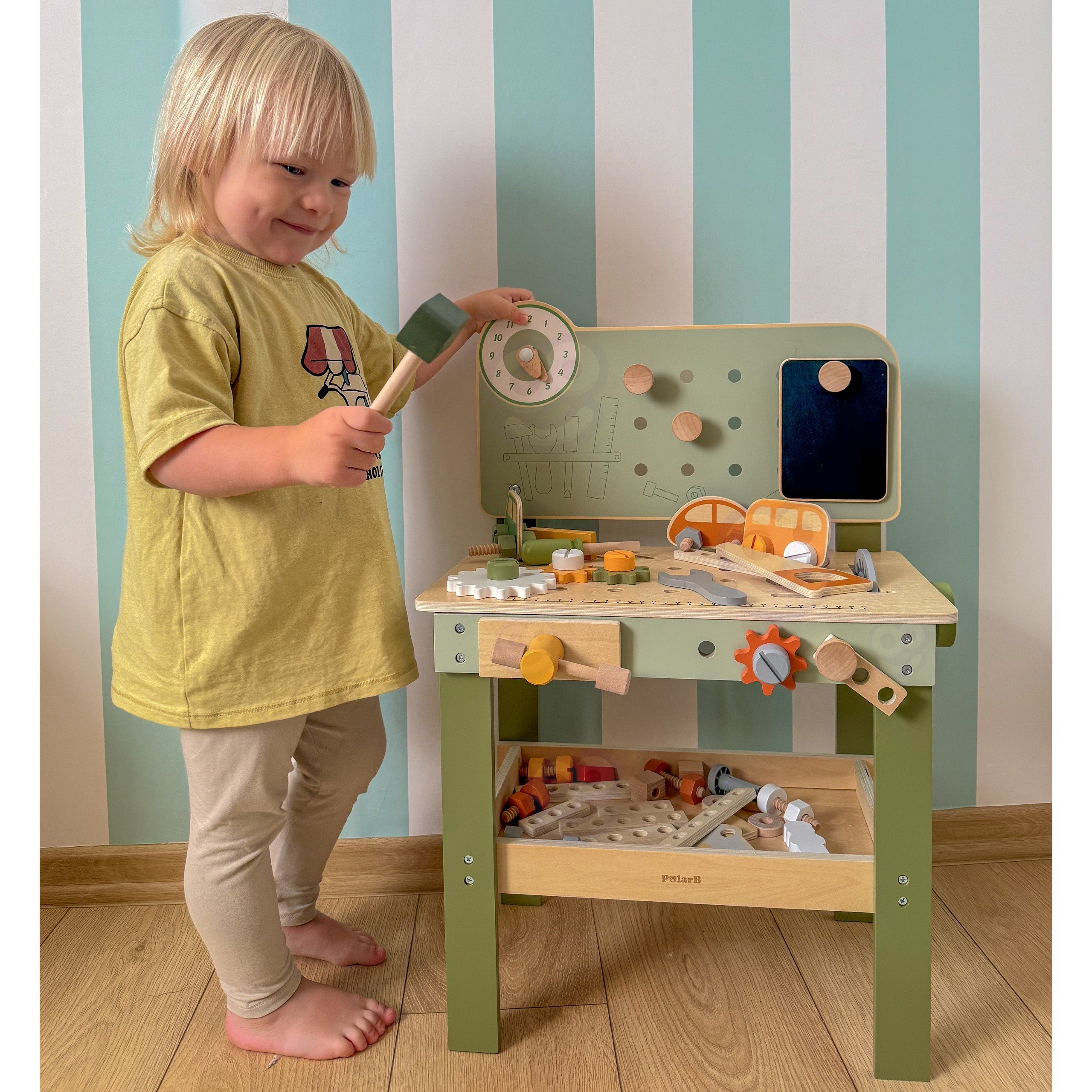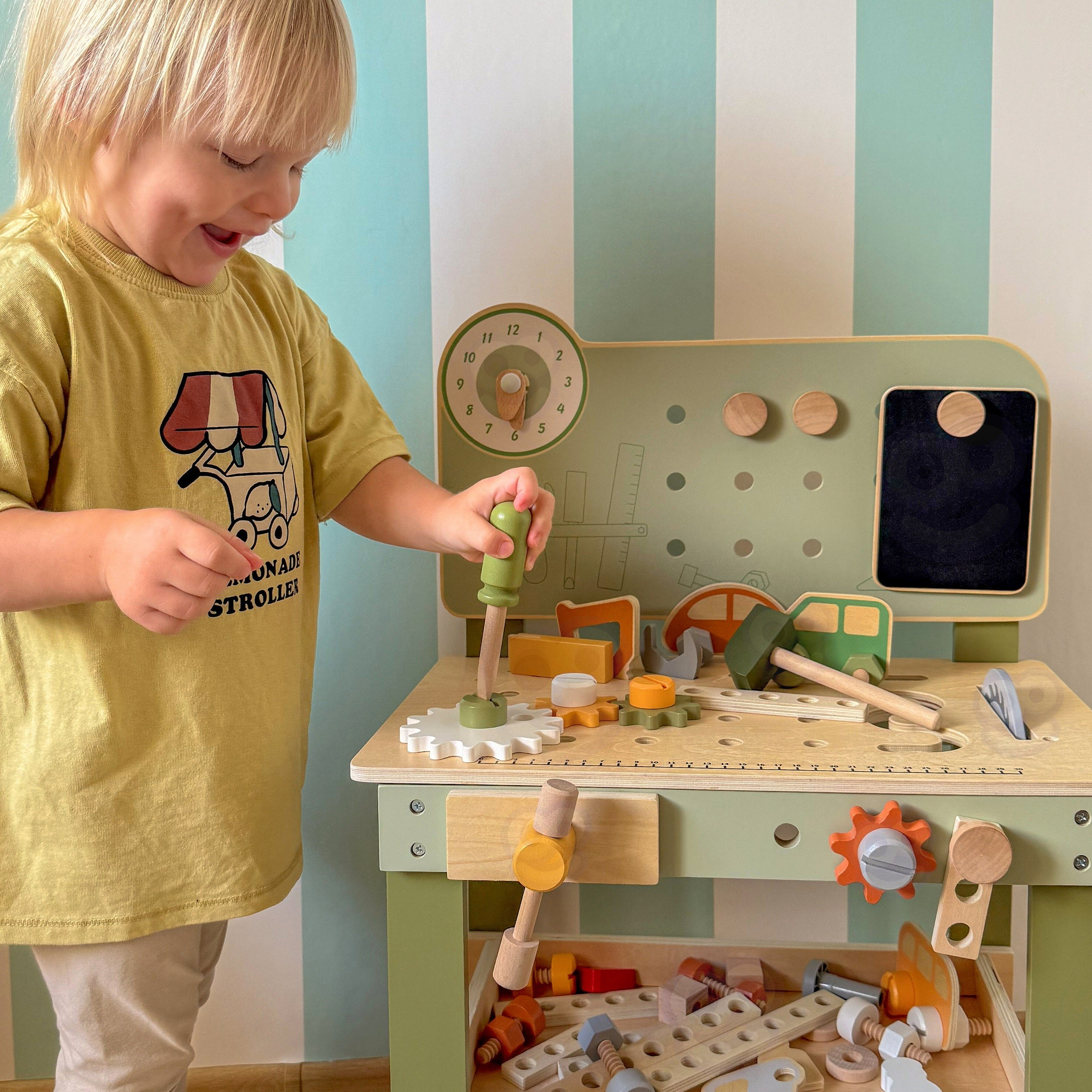Ten duży, drewniany warsztat majsterkowicza od marki Viga, to idealna zabawka, która zamienia zabawę w praktyczne, kreatywne zajęcie pełne nauki i zabawy! Dzięki niemu Twoje dziecko poczuje się jak prawdziwy mechanik – wbija gwoździe, dokręca śruby i przykręca elementy, ćwicząc ręce i umysł. Warsztat ma także zegar ze wskazówkami, drewniane samochodziki oraz wygodne miejsca do przechowywania narzędzi, co czyni zabawę jeszcze ciekawszą. Solidne wykonanie z drewna i bezpieczne, nietoksyczne farby dają rodzicom spokój, a maluchom radość z eksplorowania i tworzenia. To zabawka, która nie tylko bawi, ale też wspiera rozwój małych rączek, wyobraźni i koordynacji w codziennej zabawie!