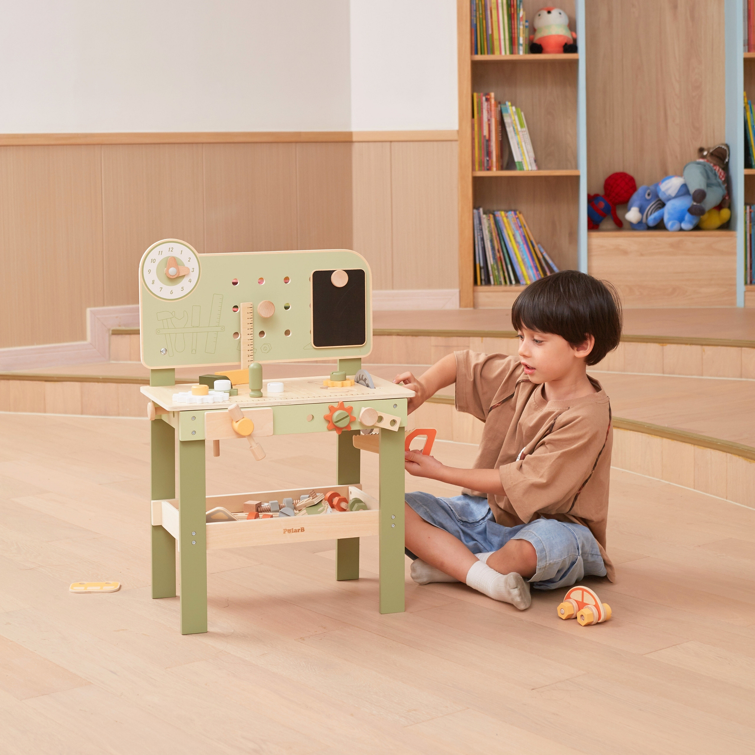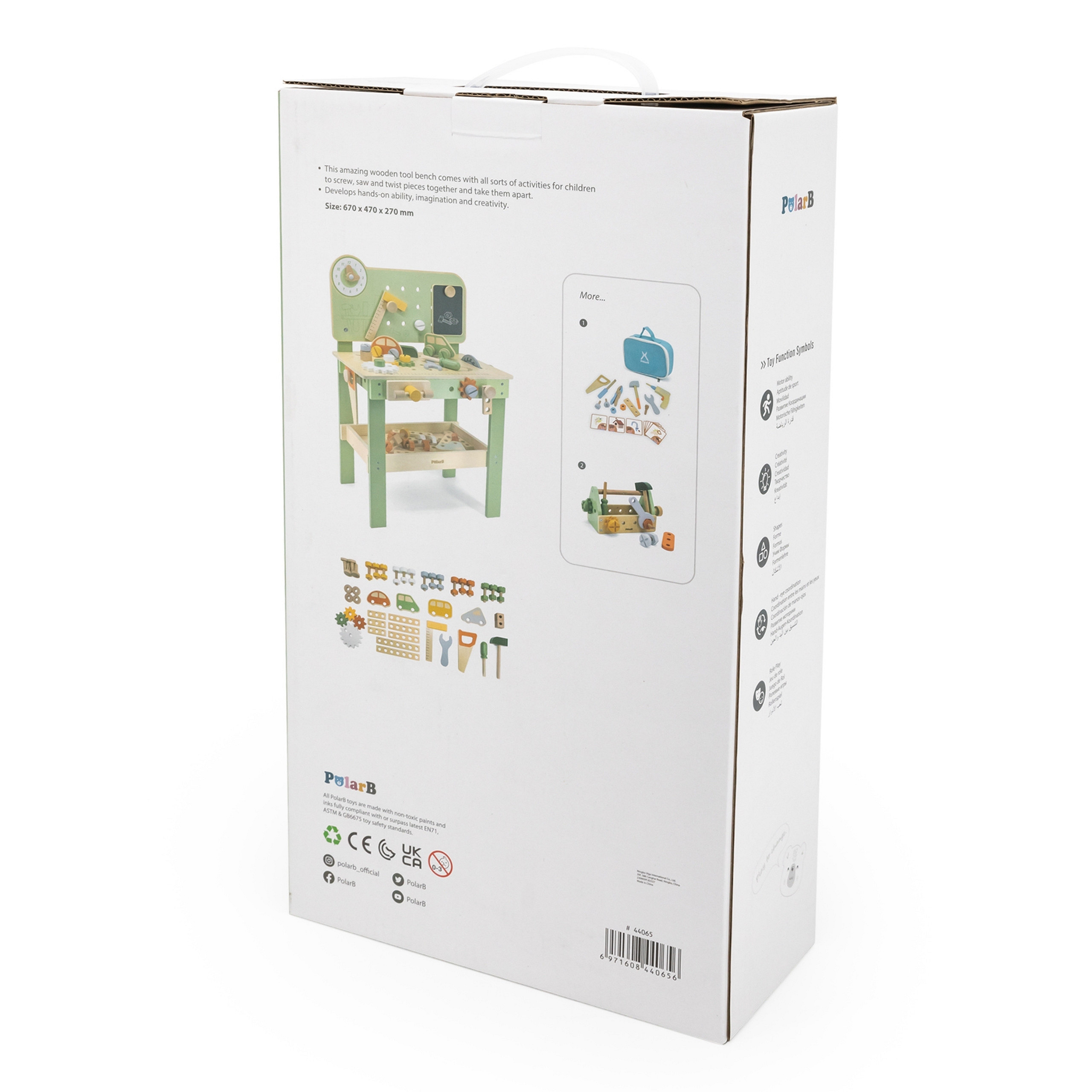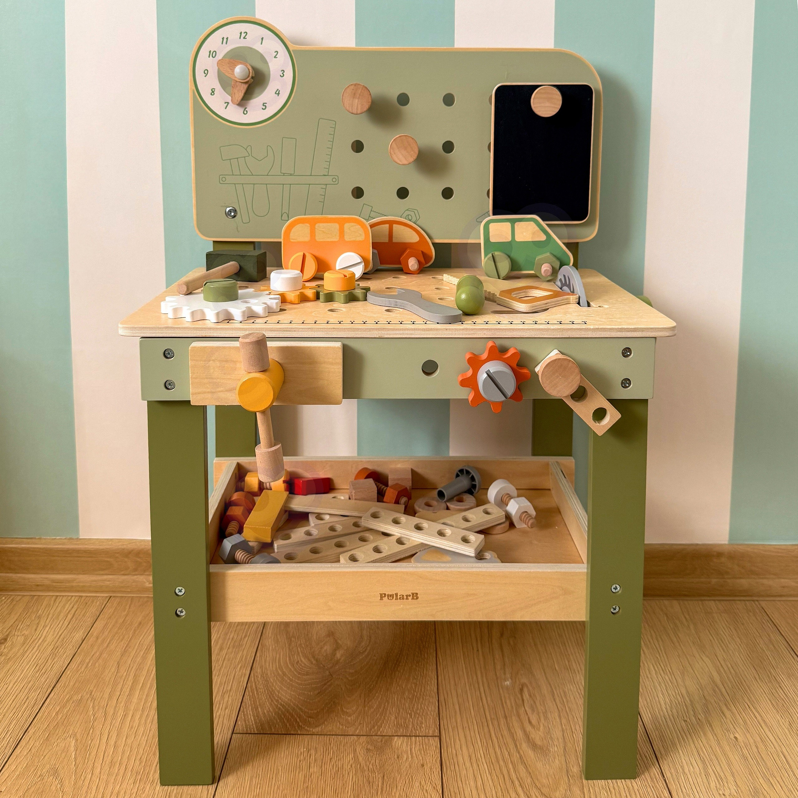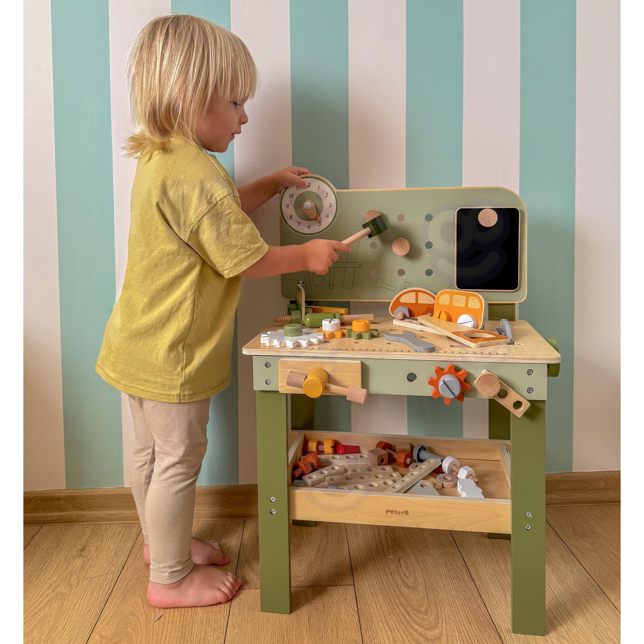 Ten duży, drewniany warsztat majsterkowicza od marki Viga, to idealna zabawka, która zamienia zabawę w praktyczne, kreatywne zajęcie pełne nauki i zabawy! Dzięki niemu Twoje dziecko poczuje się jak prawdziwy mechanik – wbija gwoździe, dokręca śruby i przykręca elementy, ćwicząc ręce i umysł. Warsztat ma także zegar ze wskazówkami, drewniane samochodziki oraz wygodne miejsca do przechowywania narzędzi, co czyni zabawę jeszcze ciekawszą. Solidne wykonanie z drewna i bezpieczne, nietoksyczne farby dają rodzicom spokój, a maluchom radość z eksplorowania i tworzenia. To zabawka, która nie tylko bawi, ale też wspiera rozwój małych rączek, wyobraźni i koordynacji w codziennej zabawie!