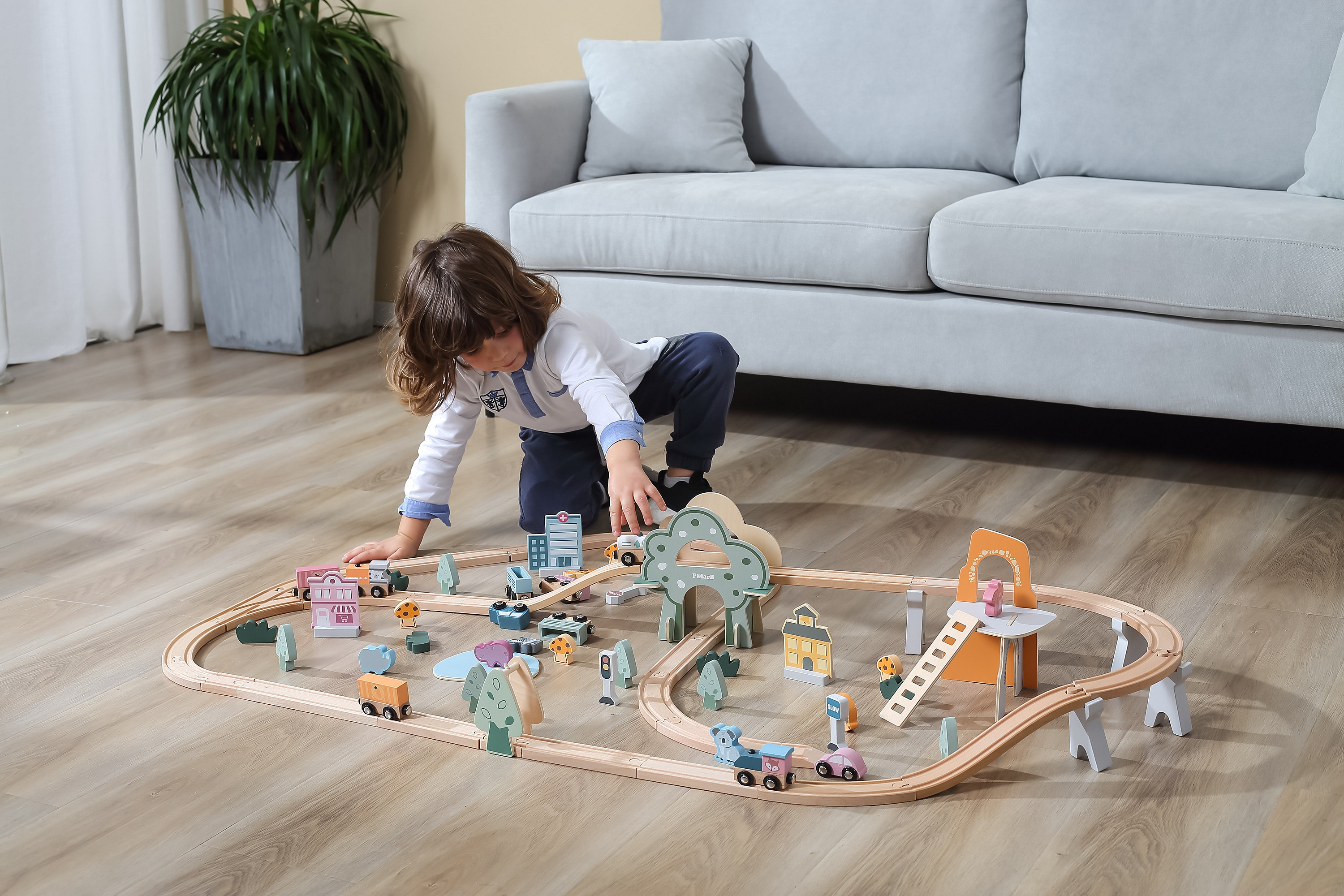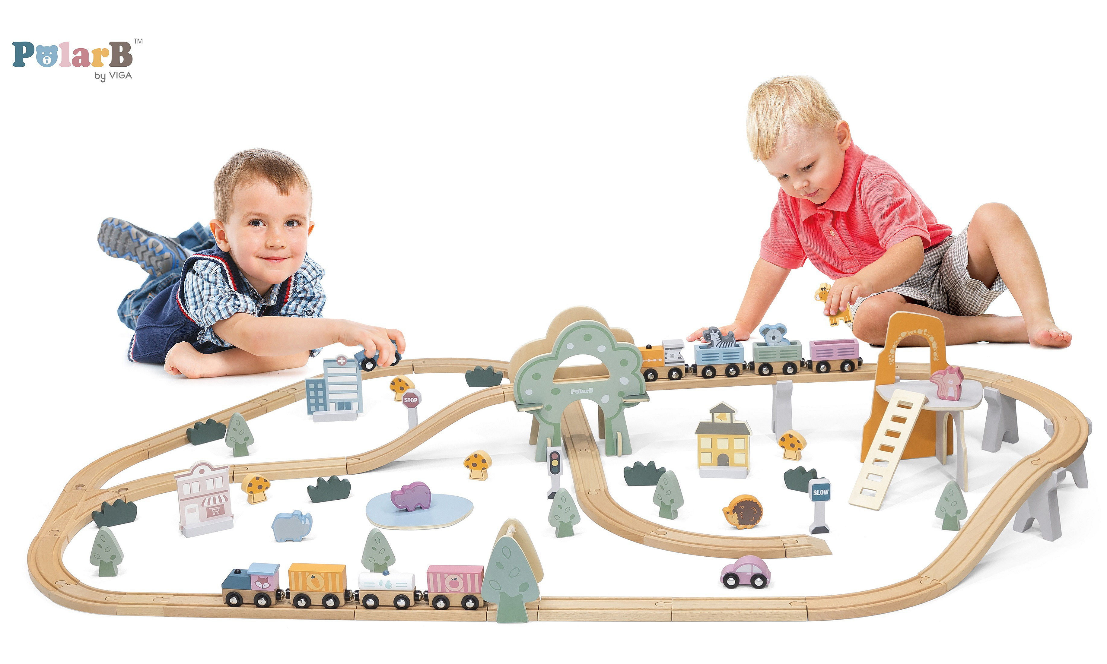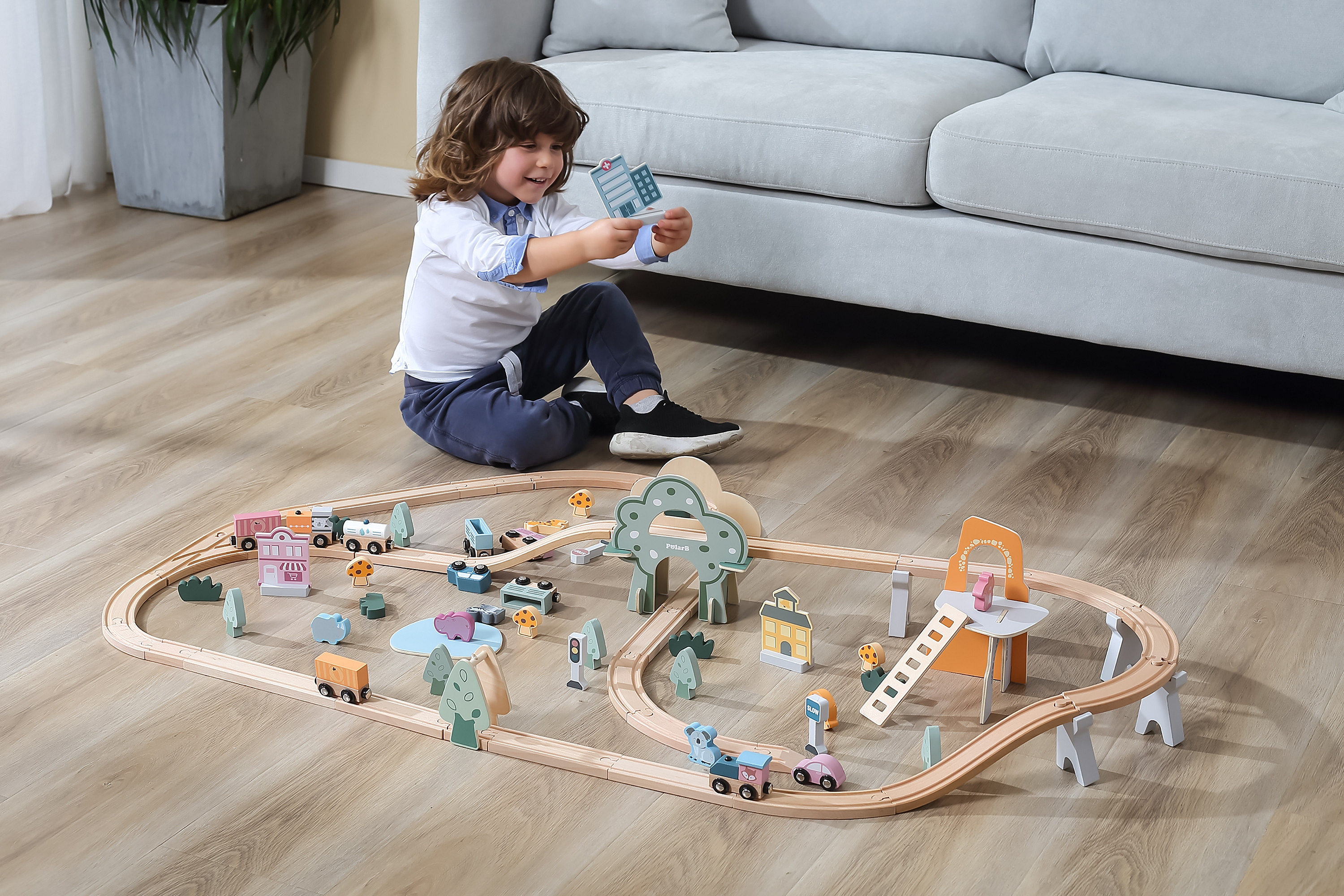 - - W skład wchodzą tory, podjazdy, pociąg z wagonikami, znaki, budynki, zwierzątka, pojazdy oraz elementy krajobrazu.