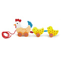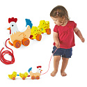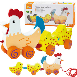 VíceKurka i jej dwa pisklaki połączone są ze sobą czerwonym sznurkiem. Pomiędzy małymi ptaszkami umieszczone są kolorowe koraliki. Podczas ciągnięcia cała gromadka będzie się poruszać w zabawny sposób.