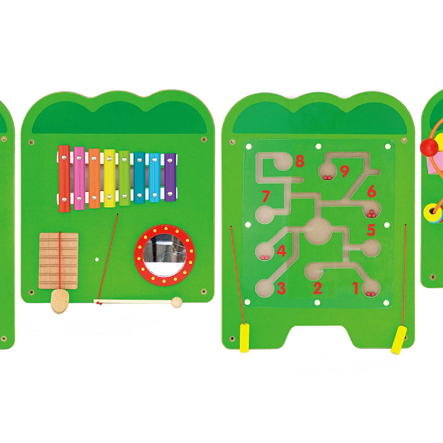 Trzecia plansza zawiera panel muzyczny z kolorowymi cymbałkami, które świetnie sprawdzą się jako pierwszy instrument dla malucha oraz karbowaną deseczkę, która przez pocieranie drewnianą pałeczką również wydaje dźwięki. Na trzeciej planszy znajdziemy także bezpieczne lusterko.