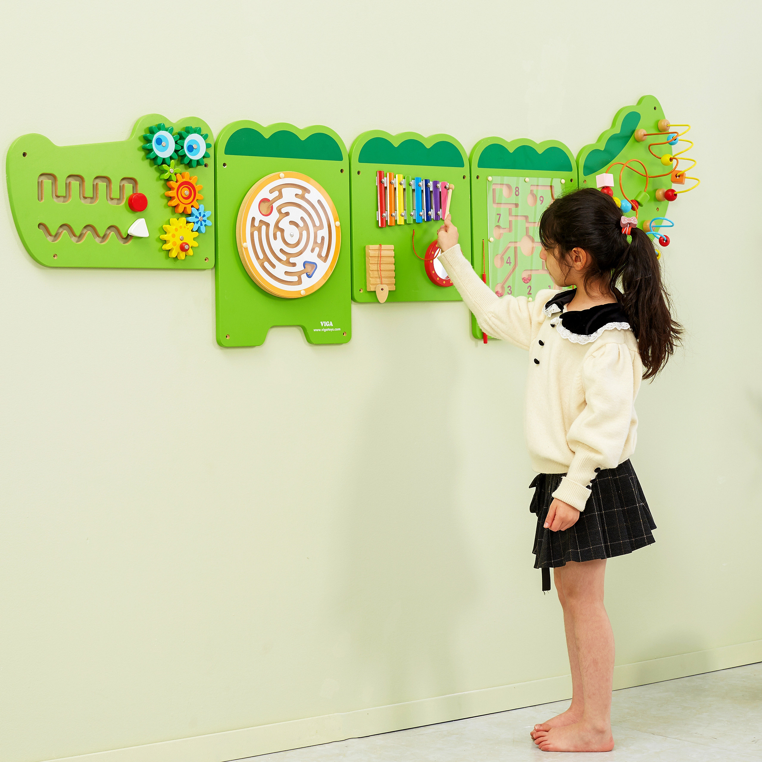 Viga Tablica Sensoryczna Manipulacyjna Edukacyjna Krokodyl świetnie sprawdzi się zarówno w domu, w przedszkolu, czy też w sali zabaw.