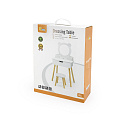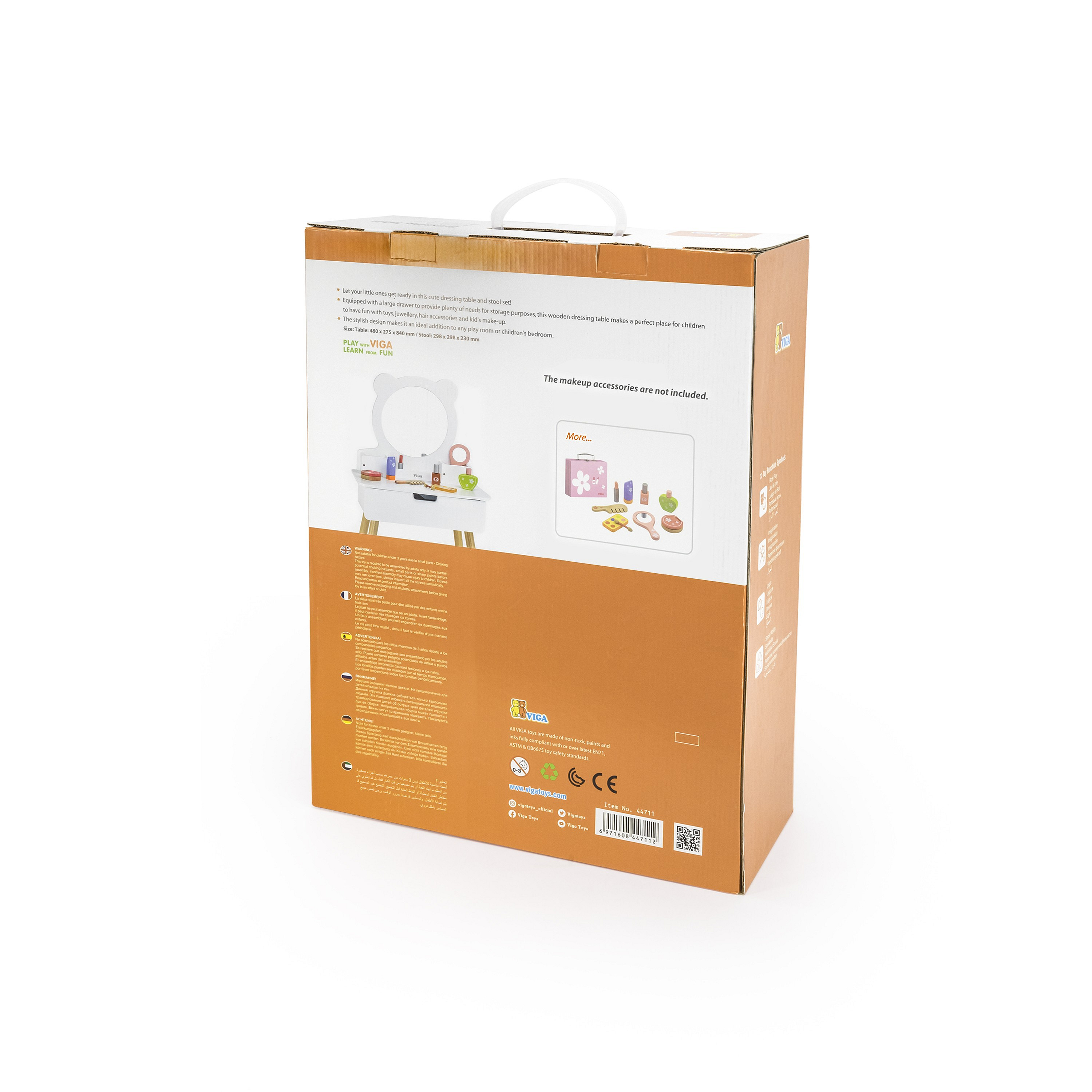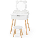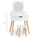 Duża, wolnostojąca biała toaletka od Viga to wymarzony mebel w pokoju każdej dziewczynki. Toaletka posiada wysuwaną szufladę, w której mała księżniczka może schować swoje skarby. Pod samym lustrem znajdują się przegródki na poręczne akcesoria. W zestawie znajdziemy również krzesełko do toaletki. Całość wykonana z drewna i pomalowana nietoksycznymi farbami bezpiecznymi dla dzieci i środowiska.