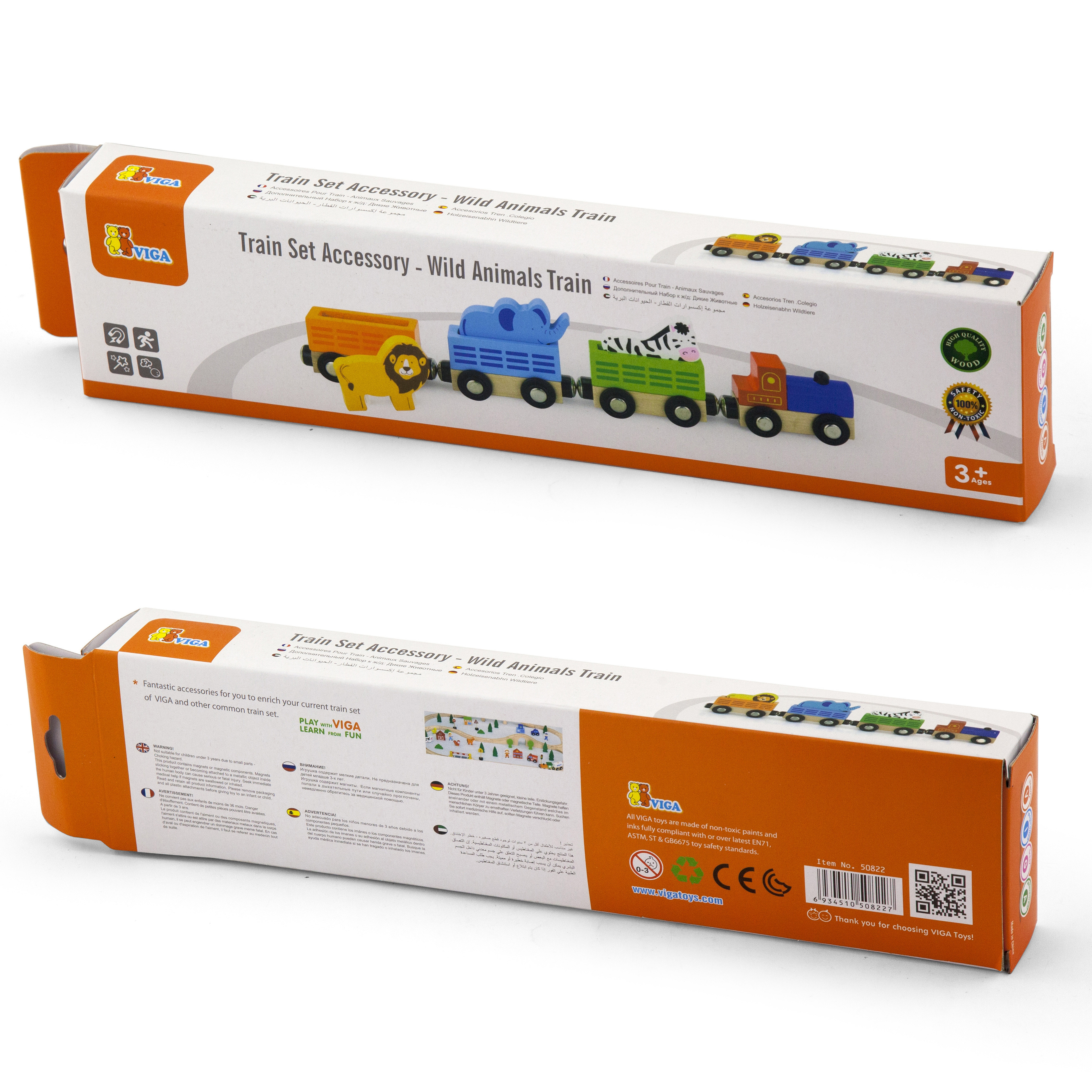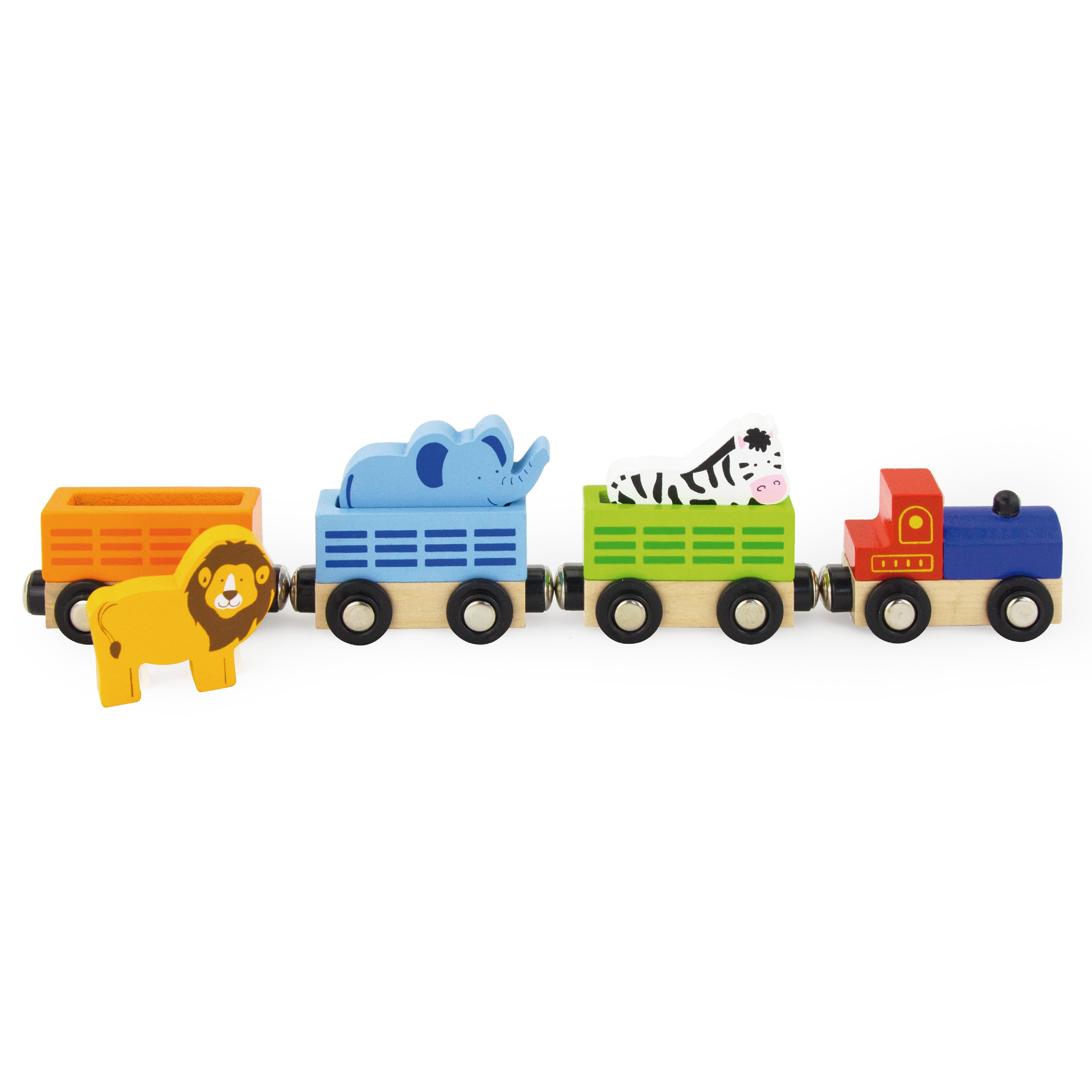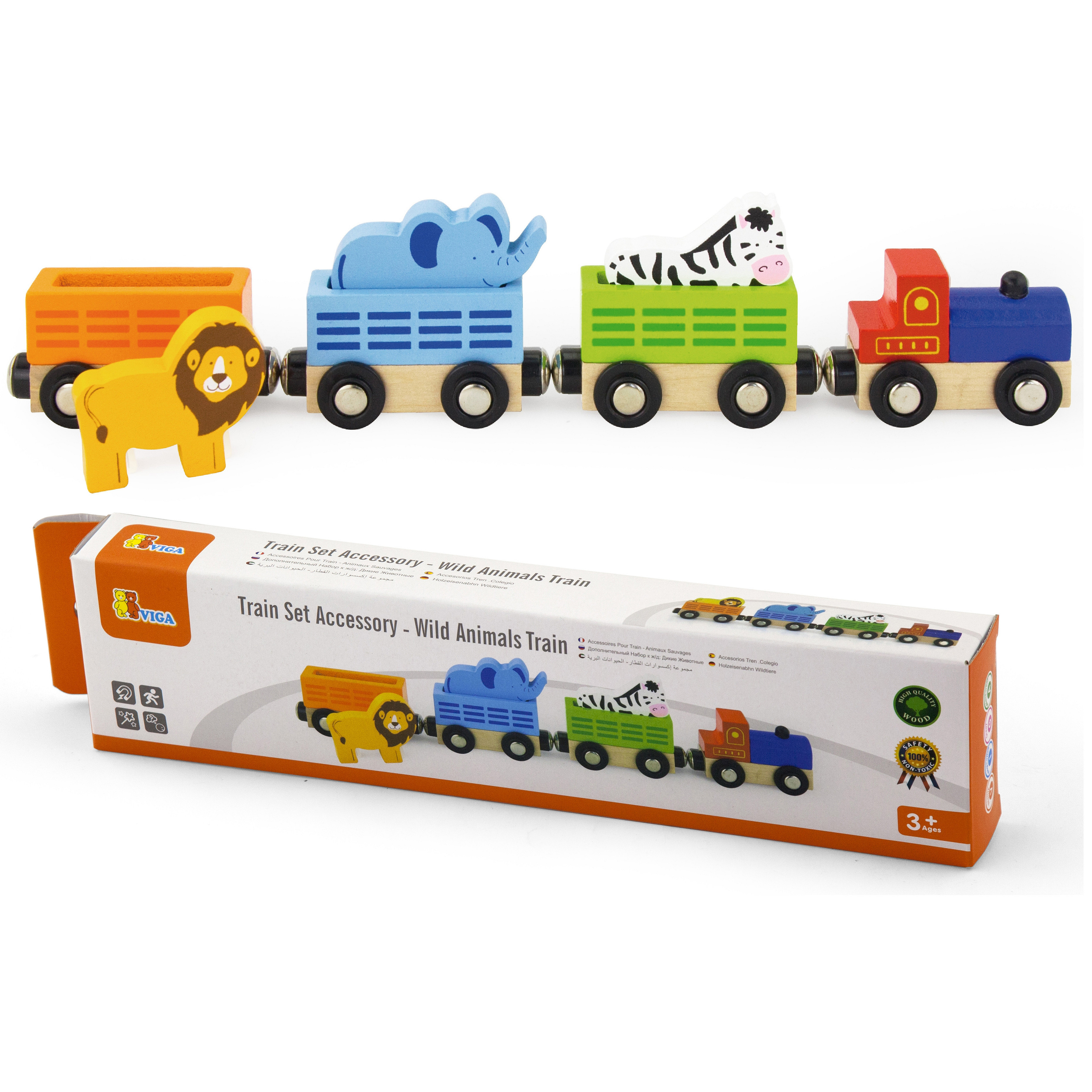 Drewniana figurka przedstawiająca pociąg z dzikimi zwierzętami. Składa się z 4 elementów łączących się ze sobą dzięki magnesowi. Zaprojektowany została przez cenionego producenta zabawek drewnianych firmę Viga Toys dla dzieci od 3 roku życia.