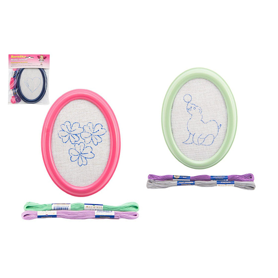 Kreativní set na vyšívání pro všechny šikovné holčičky a malé švadlenky. Sada obsahuje plastový rámeček s napnutým plátýnkem s předtištěným obrázkem, dva další obrázky na vyšití a bavlnky. Sada v několika barevných kombinacích bavlnek a rámu, a v několika motivech obrázku.