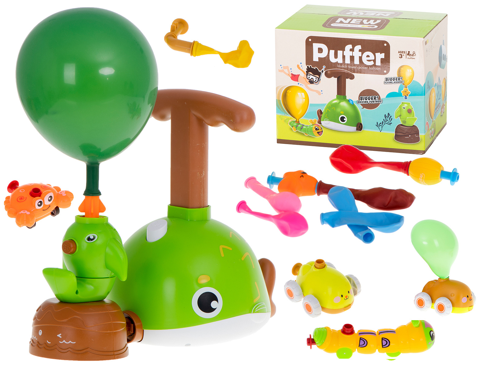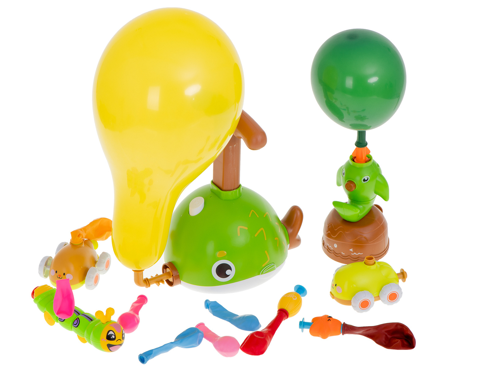 Zawartość zestawu obejmuje wyrzutnię, samochodziki, baloniki, piłkę, rozgwiazdę, latający gwizdek, gąsienicę i wiele innych elementów, które dostarczą mnóstwo różnorodnych i kreatywnych zabaw.