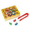 Zadaniem dziecka jest wyjęcie kolorowych pszczółek przy pomocy dołączonej pęsety, a następnie umieszczenie każdej z nich w otworze odpowiadającym barwą.