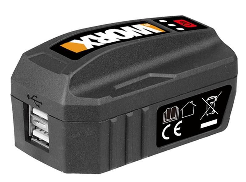 WA4009 - USB adaptér na baterii Mění jakoukoliv baterii WORX POWER SHARE na přenosný napájecí zdroj. Lze jej použít pro nabíjení mobilních telefonů, tabletů a malých elektronických zařízení. Díky kompaktnímu designu se USB nabíjecí adaptér snadno přenáší a, zajišťuje, že energetické rezervy budete mít vždy po ruce. 2 USB výstupy, indikátorem stavu nabití a 3dílnou konstrukcí pouzdra