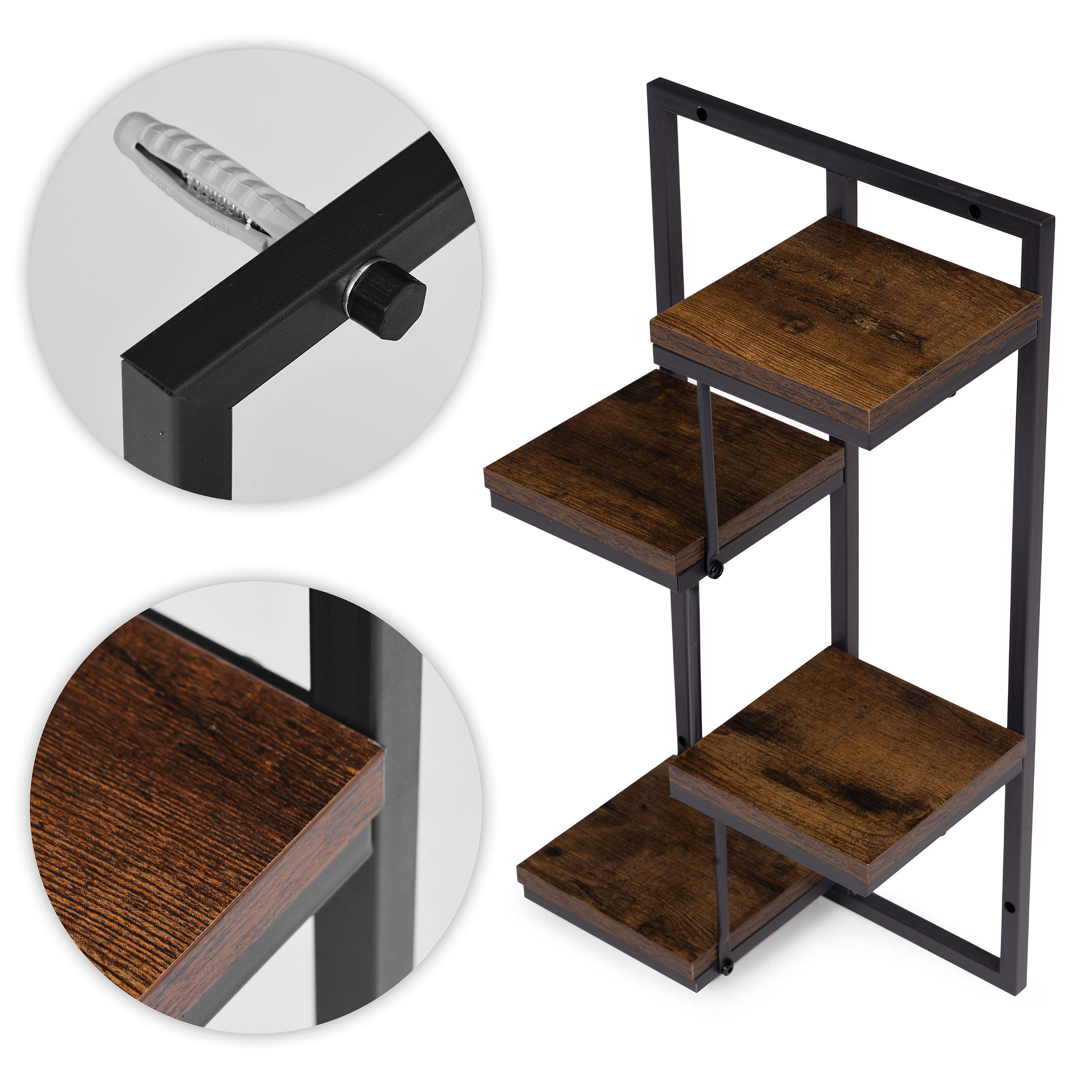 The shelf comes with a complete mounting kit that allows for quick and safe wall installation. The kit includes screws, decorative caps, and 5 cm expansion plugs, ensuring stability even with heavier pots. This means no need to purchase additional parts – everything you need for installation is included in the package.