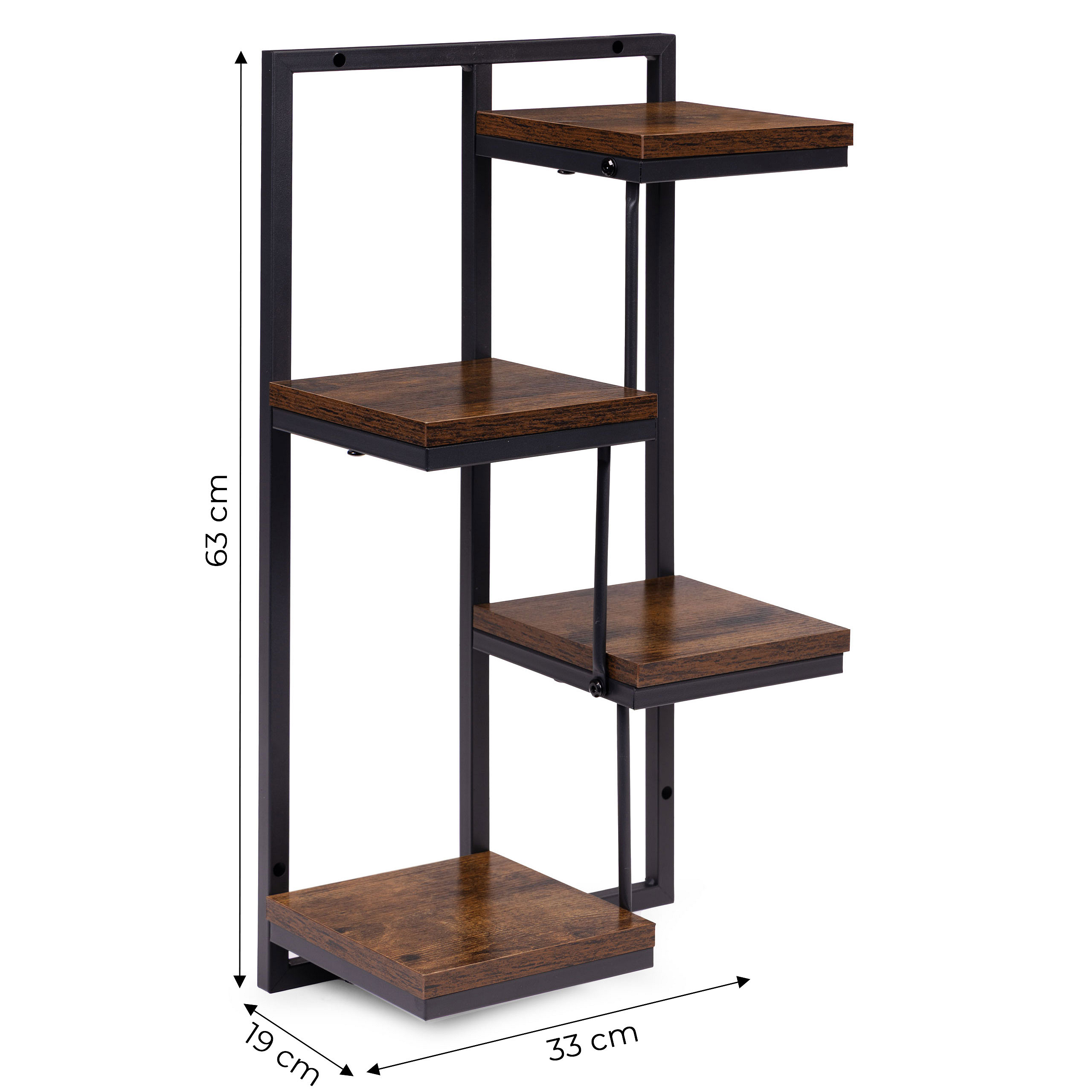 The product is made of powder-coated steel, providing resistance to corrosion and mechanical damage. The chipboard shelves are finished in a natural wood imitation color, emphasizing the decorative, loft-style character of the furniture.
