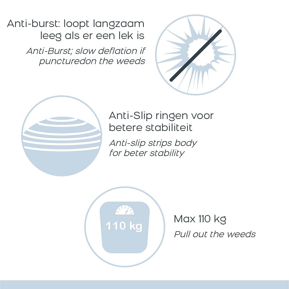 The ball has a diameter of 65 cm and is therefore perfect for persons with a length between 165 - 185 cm and with a maximum weight of up to 110 kg.