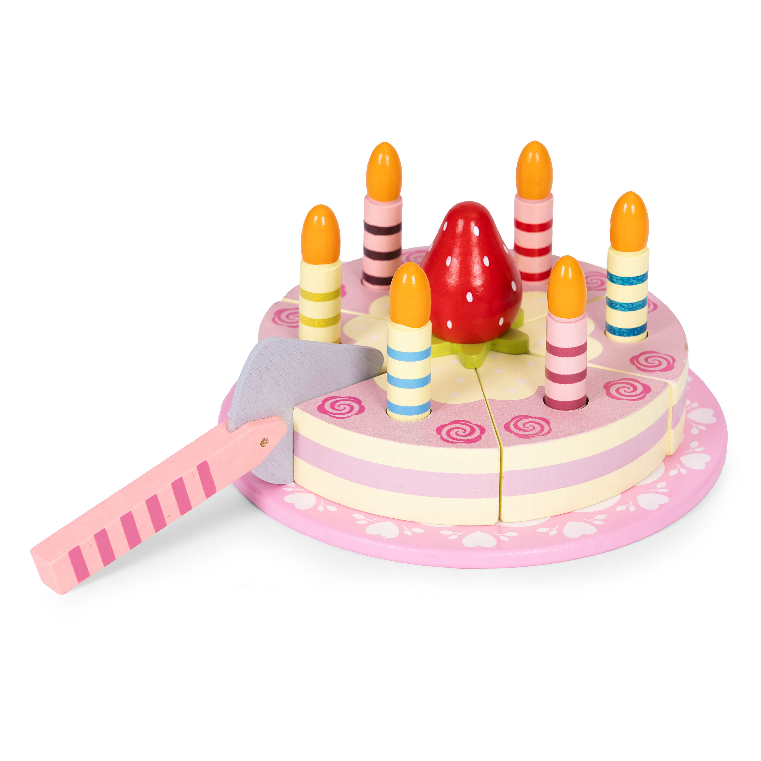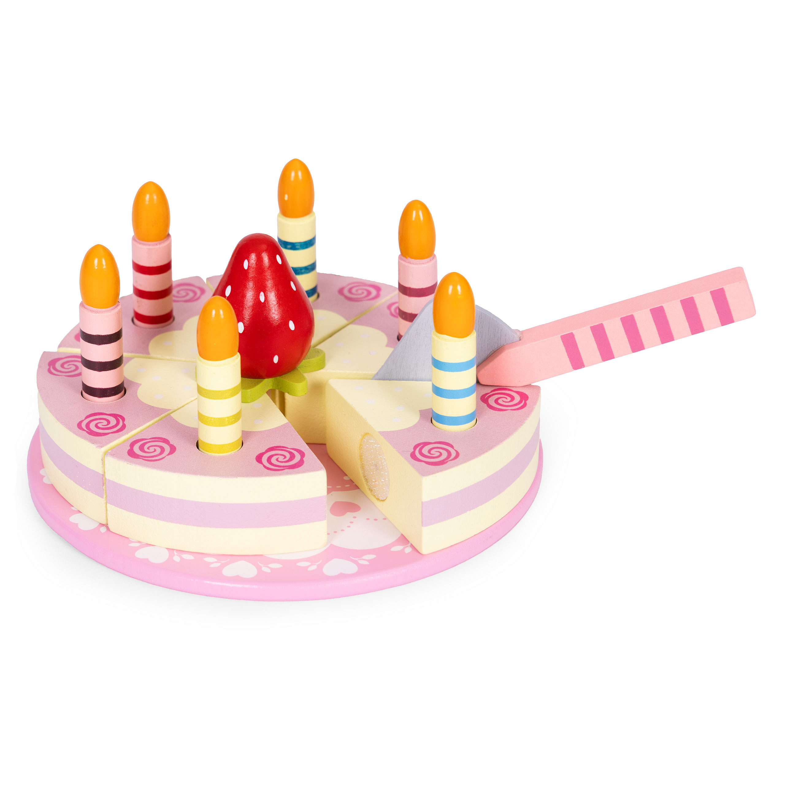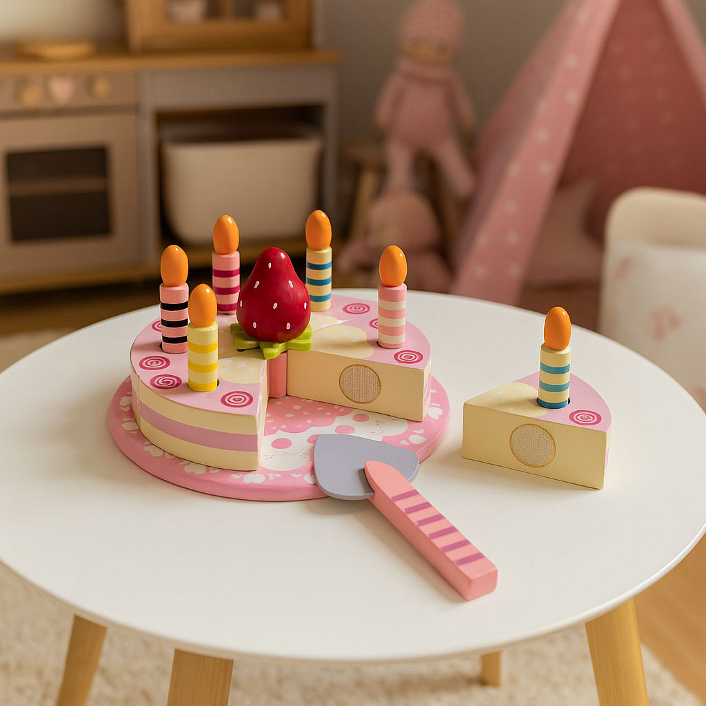 Insertable candles for the wooden cake add authenticity and allow little ones to act out joyful birthday party scenes. The wooden strawberry adds color and flavor to the whole fun. Children can use it to decorate their cake, while improving their motor and manual skills.