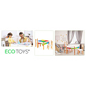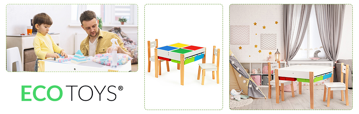 The tabletop consists of 2 removable elements. On one side there are colorful boards for arranging blocks, the other side is a flat surface, allowing for drawing, painting and other creative games.