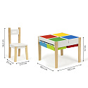 A great set for all little ones, thanks to its simple form it will perfectly fit into the decor of children's rooms, playrooms or waiting rooms. The table has solid pine legs that give it stability, the top is made of MDF which makes it easy to maintain and resistant to damage/scratches. The set is complemented by two stable and comfortable chairs, perfectly matched to the table.