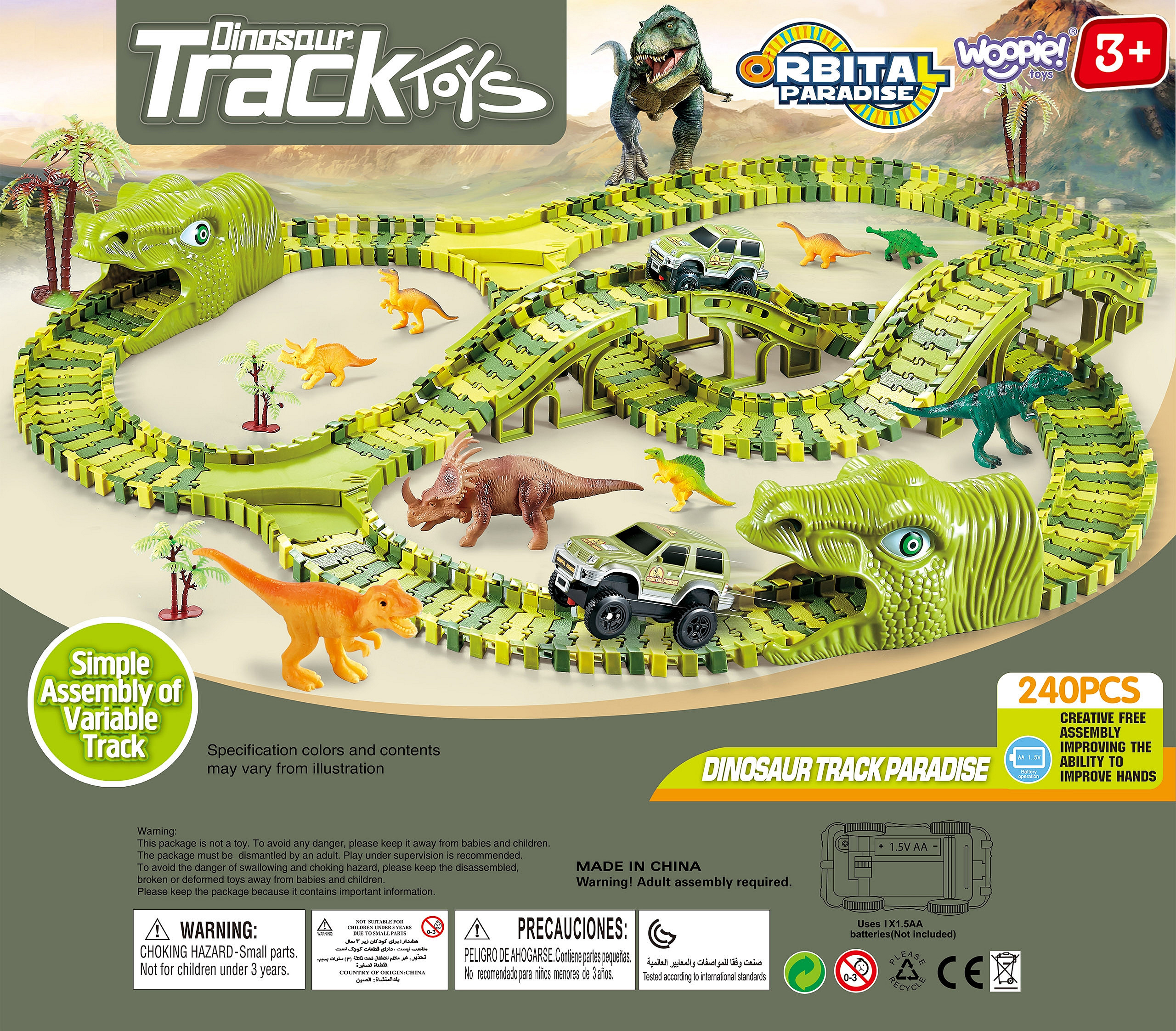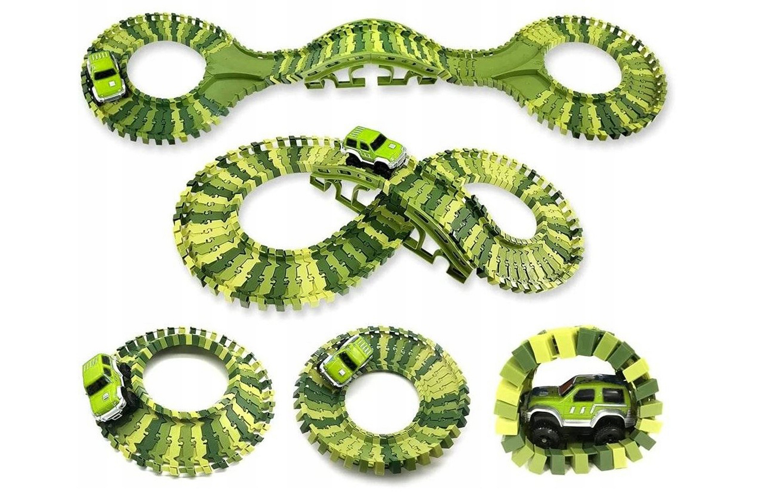 Tor Samochodowy XXL Dinozaury 240 elementów od marki WOOPIE to własny park dinozaurów z torem przeszkód, który nada się idealnie dla małego fana tych prehistorycznych zwierząt. Ogromna ilość elementów pozwala puścić wodze fantazji i zbudować swój wymarzony tor. Dzięki elastyczności toru, autko ma lepszą przyczepność. Dziecko wymyślając tor rozwija swoją wyobraźnię oraz kreatywność, a przy budowaniu go poprawia swoje zdolności manualne oraz rozwija małą motorykę.