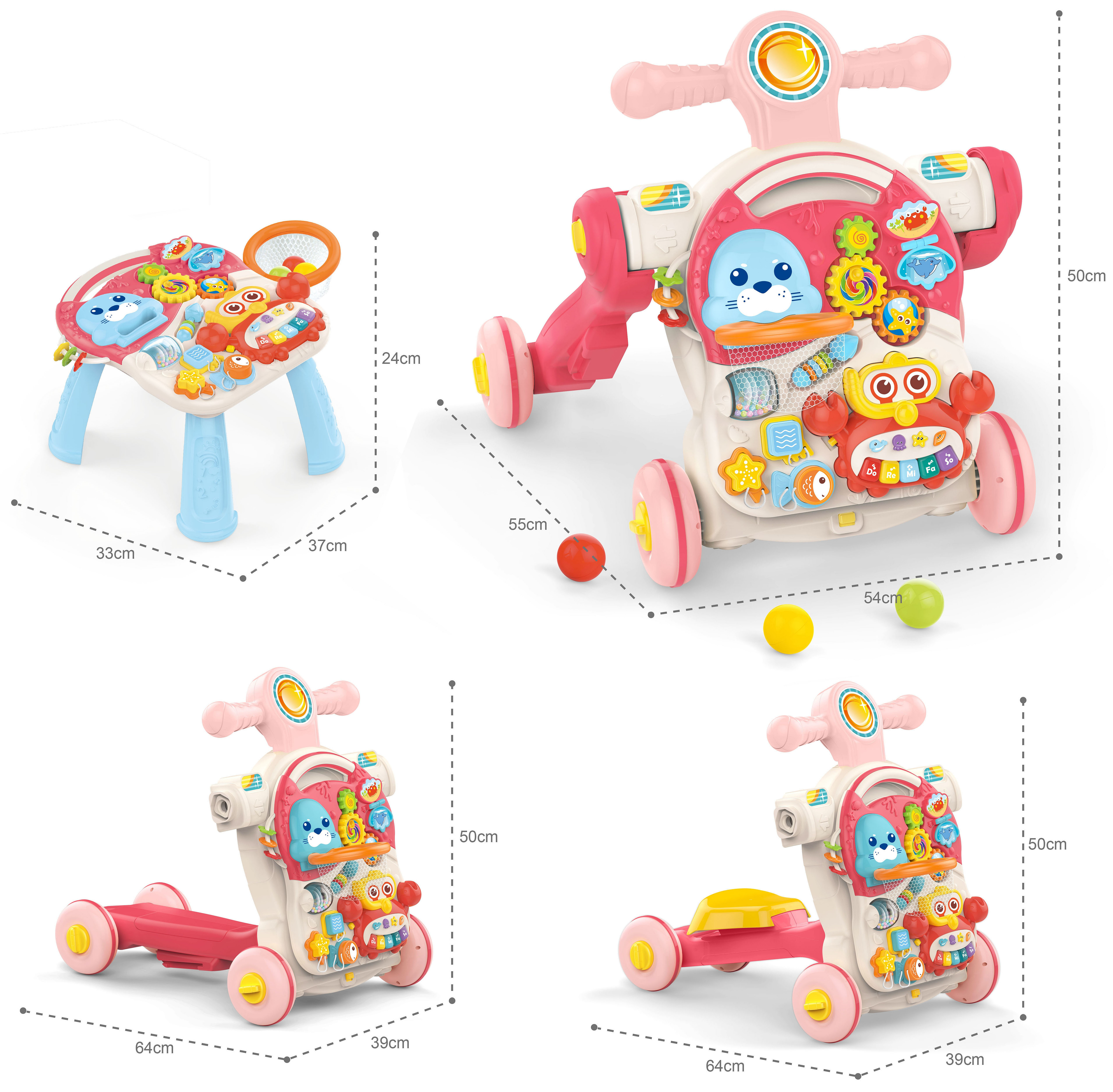 Odkryj nieskończone możliwości zabawy z Wielofunkcyjnym Interaktywnym Jeździkiem 4w1 od marki WOOPIE! Ten edukacyjny pchacz stanie się ulubionym towarzyszem Twojego malucha, podążając za nim krok w krok od pierwszych raczkujących dni, aż do swobodnego przemieszczania. Zabawka jest prawdziwą skarbnicą niespodzianek, które dziecko może samodzielnie odkrywać. Ułatwia to połączenie kilku funkcji w jednej zabawce: pchacza, hulajnogi, jeździka oraz stolika edukacyjnego, co sprawia, że zabawka z pewnością nie znudzi się przez długi czas. Główny panel oferuje mnóstwo atrakcji: krabik-mini-organki dla rozwoju muzycznego, ruchome "drzwiczki" z wesołymi zwierzątkami, obrotowe zębatki, kolorowe klocki na sznurkach do nauki kształtów i kolorów, obrotową grzechotkę, mini liczydło z krążkami i wiele innych. Bezpieczeństwo jest na pierwszym miejscu - zabawka wykonana jest z najwyższej jakości, atestowanych i estetycznych materiałów. Zabawka nie posiada żadnych nierówności czy ostrych krawędzi, gwarantując pełne bezpieczeństwo użytkowania.