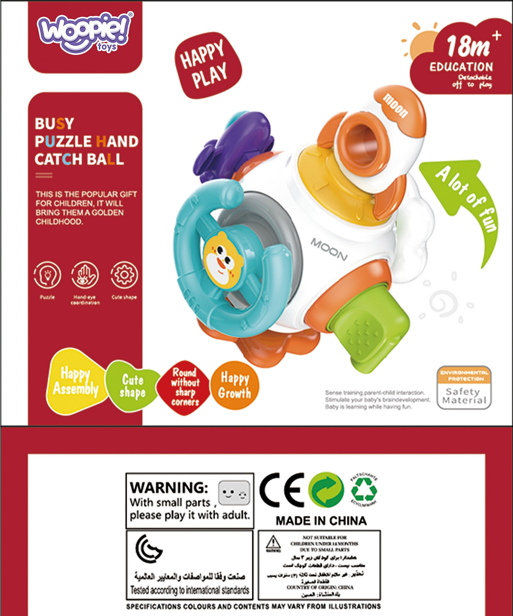 Piłka Kosmiczna Rakieta Montessori od marki WOOPIE to kolorowa, edukacyjna kostka sensoryczna dla dzieci od 18 miesięcy życia. Zawiera sześć paneli aktywności, które stymulują zmysły dziecka i rozwijają umiejętności motoryczne. Elementy takie jak kierownica, przycisk chmura, wtyczka analogowa, zabawki spinner, zabawki rakietowe i zabawki ze statkami kosmicznymi zapewniają różnorodne doświadczenia. Zabawka jest bezpieczna, wykonana z wysokiej jakości materiałów i zaprojektowana z myślą o rozwoju i bezpieczeństwie dziecka.